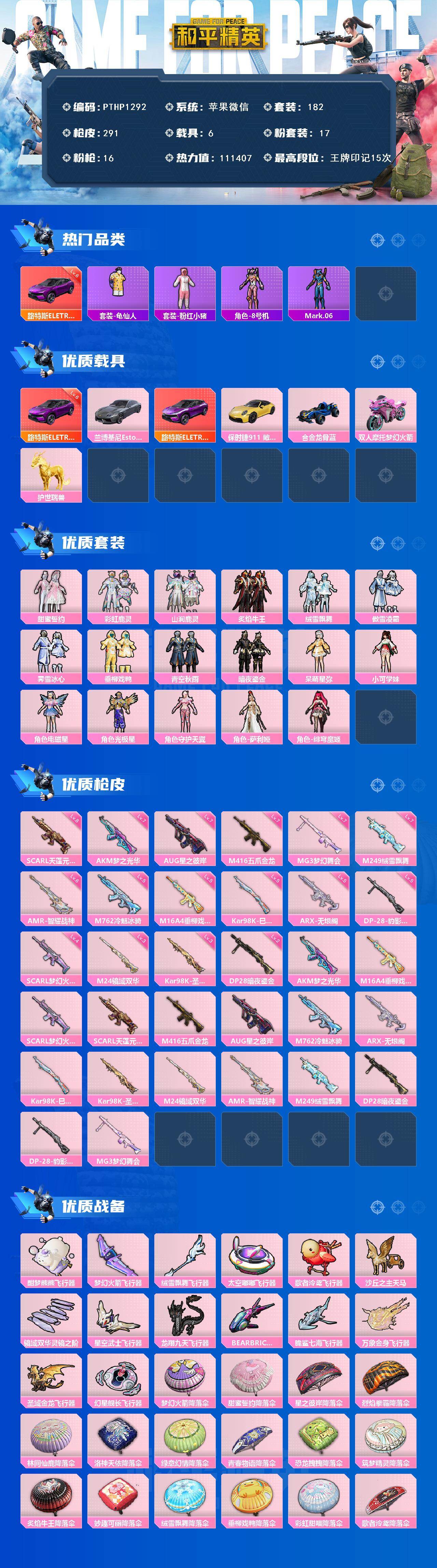 【自带包赔 找回全额赔】 苹果 微信-17粉装-16特效呛-6载具-16粉色飞行器-111407热力值-15王牌印记-182套装-291呛皮 【红色载具】:路特斯eletre(电光紫)六级 【热门品类】:套装-龟仙人,套装-粉红小猪,角色-8号机,角色-mark.06 【粉色套装】:粉装-甜蜜誓约,粉装-彩虹鹿灵,粉装-山涧鹿灵,粉装-炙焰牛王,粉装-绒雪飘舞,粉装-傲雪凌霜,粉装-霁雪冰