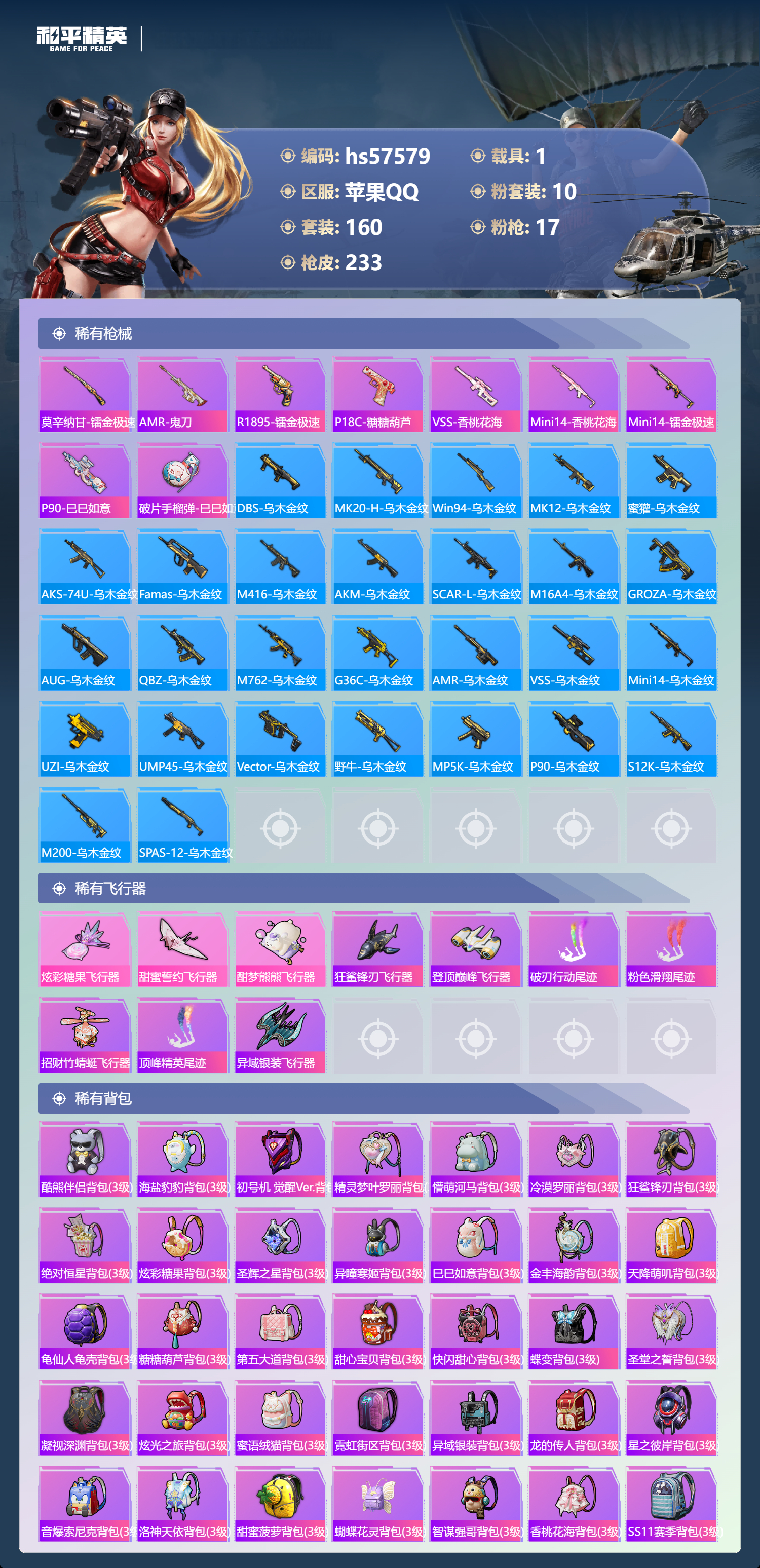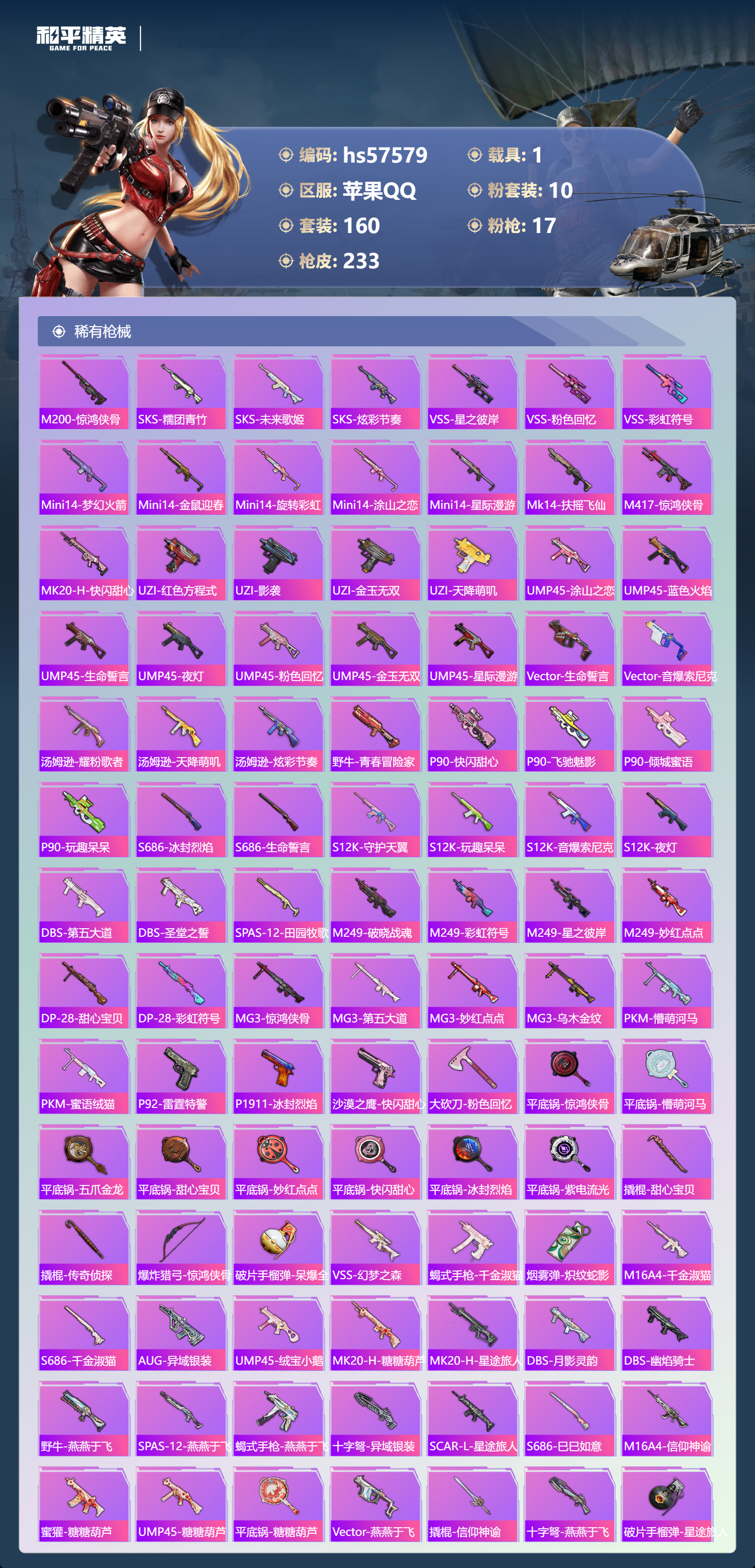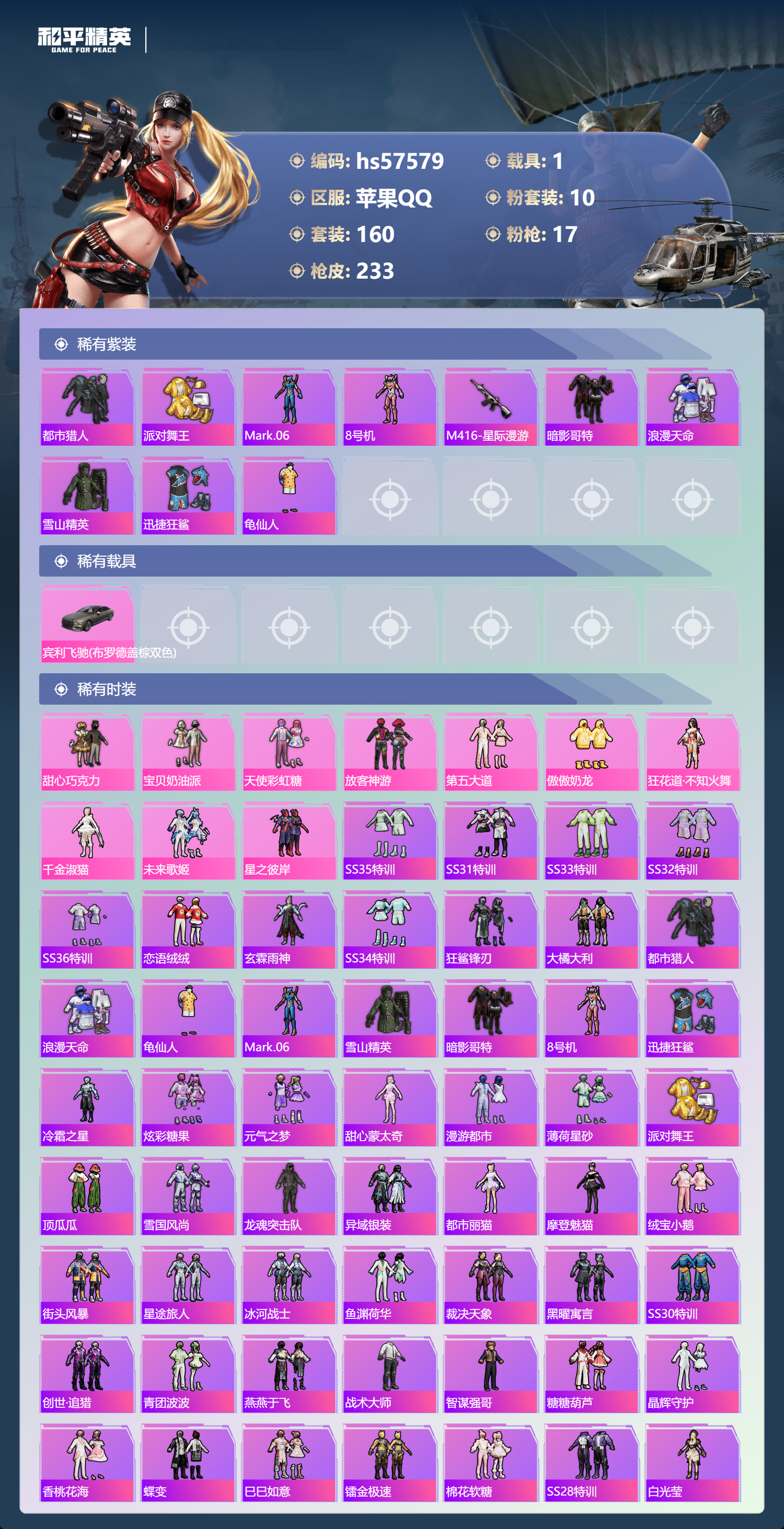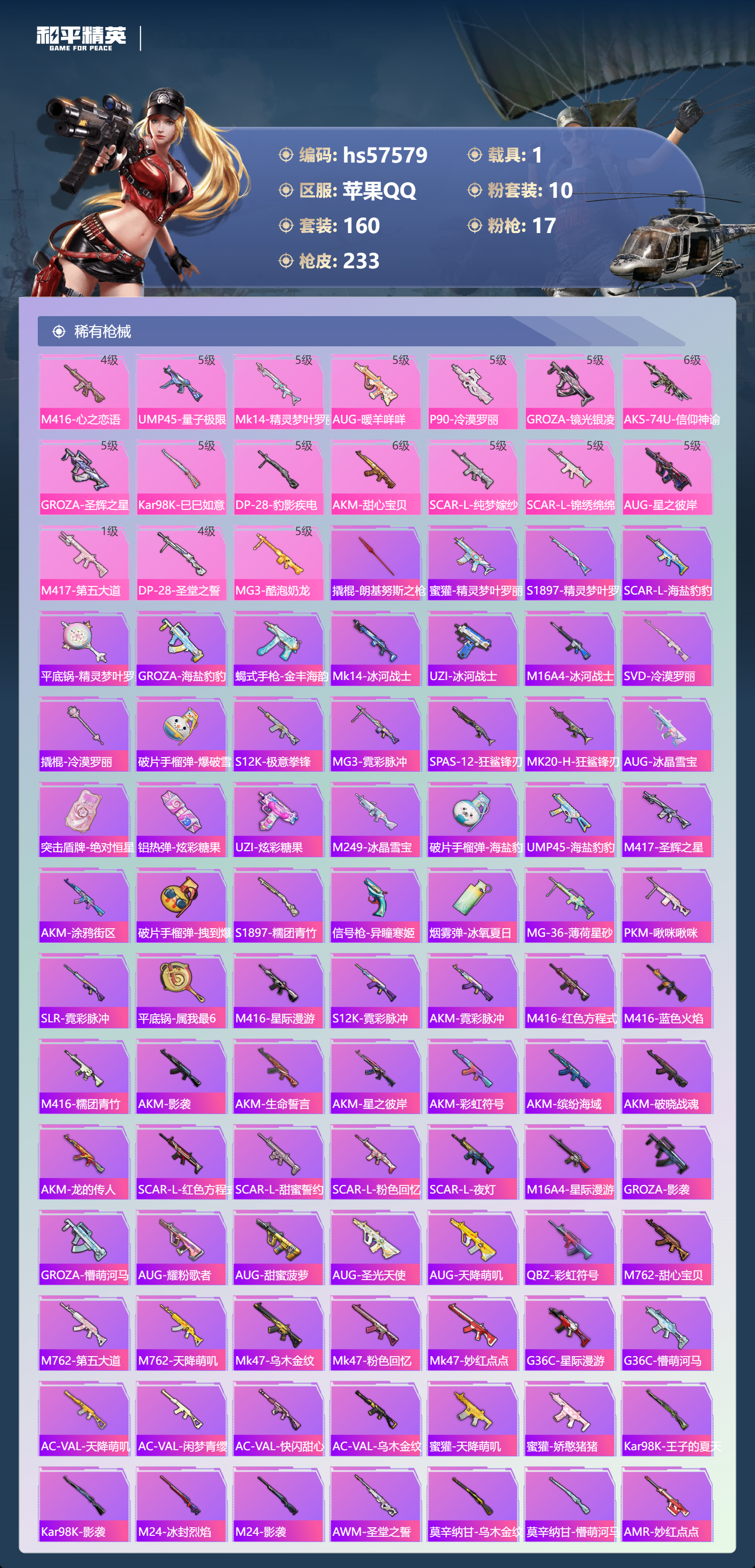 1载具-160套装-233呛皮-hs57579 苹果手q-15王牌印记-有战神框-10粉装-17特效呛-1载具-79030热力值-160套装-233呛皮-7卓越印记-6传奇印记【10粉装】套装-天使彩虹糖套装-甜心巧克力角色-狂花道·不知火舞套装-未来歌姬套装-放客神游套装-宝贝奶油派套装-傲傲奶龙角色-千金淑猫套装-第五大道套装-星之彼岸【17特效呛】m416-心之恋语/4级akm-甜心宝贝/6级gr