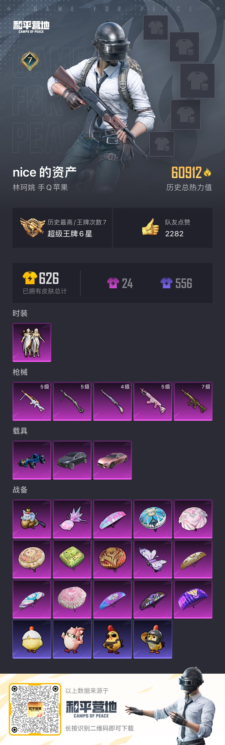 _2393253-3载具-126套装-183呛皮-1稀有3载具1粉装5特效呛23热门126套装183呛皮60912热力值7印记历史超级王牌6星【1稀有】akm-缤纷海域【3载具】玛莎拉蒂粉色合金龙骨蓝色特斯拉x银色【1粉装】潮汐统领【5特效呛】m416-五爪金龙7级kar98k-伏魔团4级m762-甜蜜誓约5级mg-36-沧焰双生5级dp-28-豹影疾电5级【23热门】小丑鱼雪山精英呆萌铁蟹好奇恐龙迅捷狂鲨浪漫波比胖达圆圆暗夜契约团圆交子瑞龙福将纯白誓言粉红小猪水银刺客梦之呓语白虎圣者青龙圣者海洋之心破蛋小黄鸡风华少年志弄潮海豚m416-仓鼠灰灰m762-瑞龙福将kar98k-深海曼妙【1飞行器】荧光虫舞飞行器 【4头盔】银河战甲头盔金风玉露头盔深海小丑鱼头盔甜蜜誓约头盔 【1背包】甜蜜誓约背包营地id: