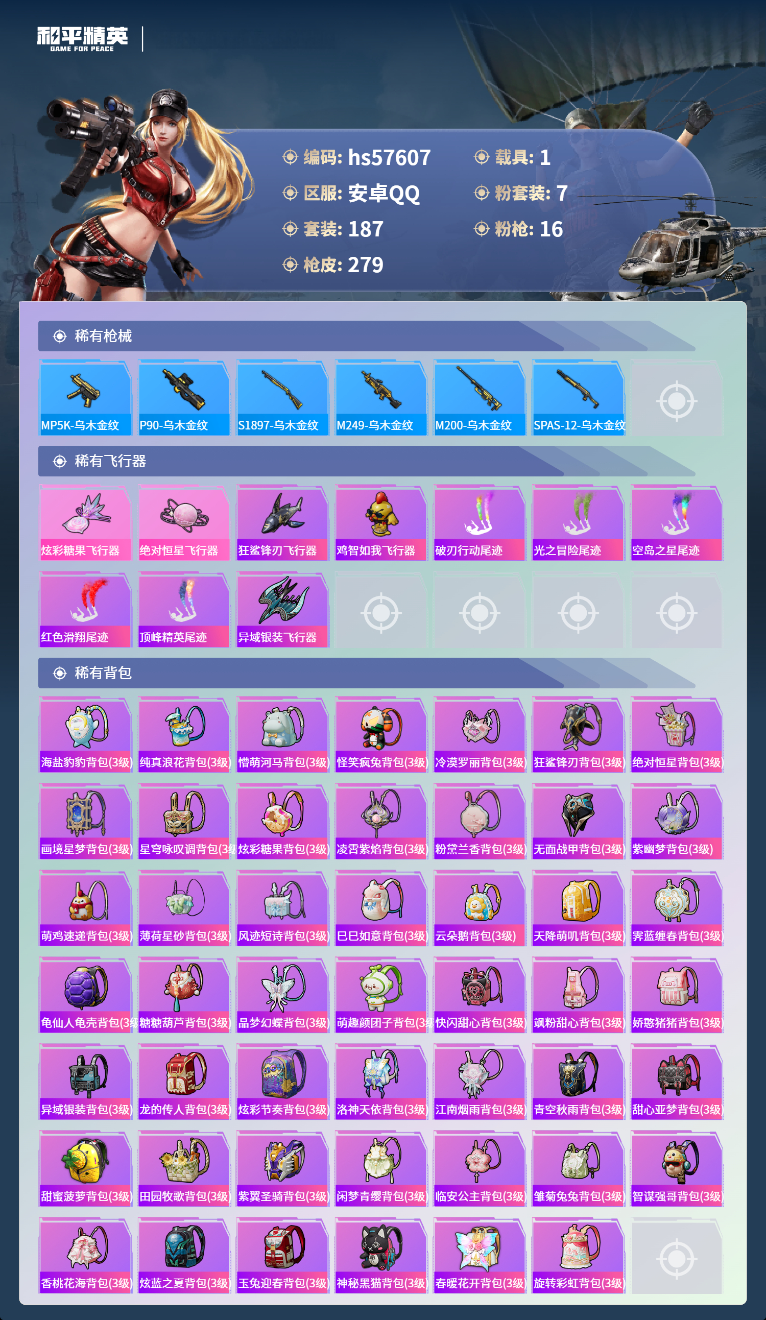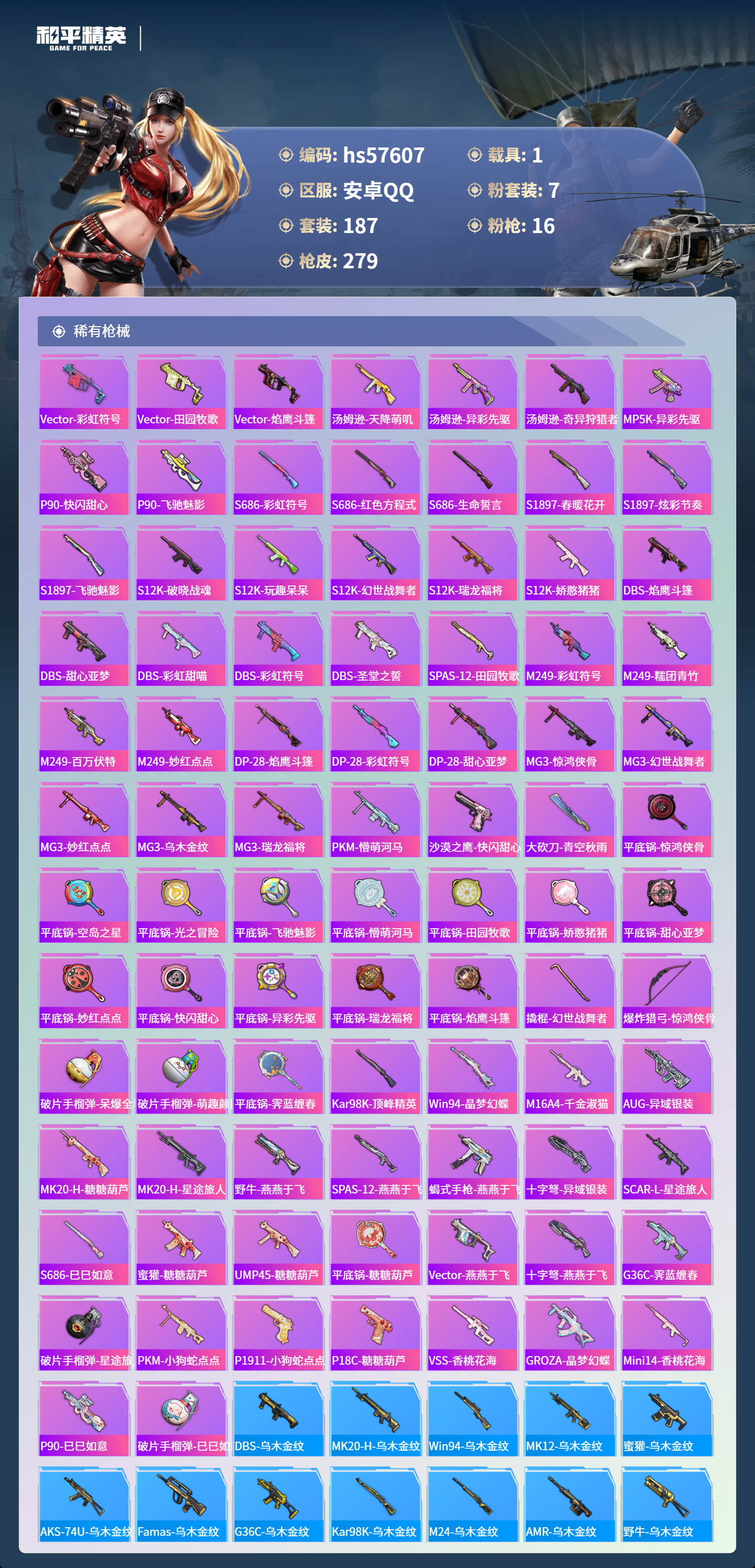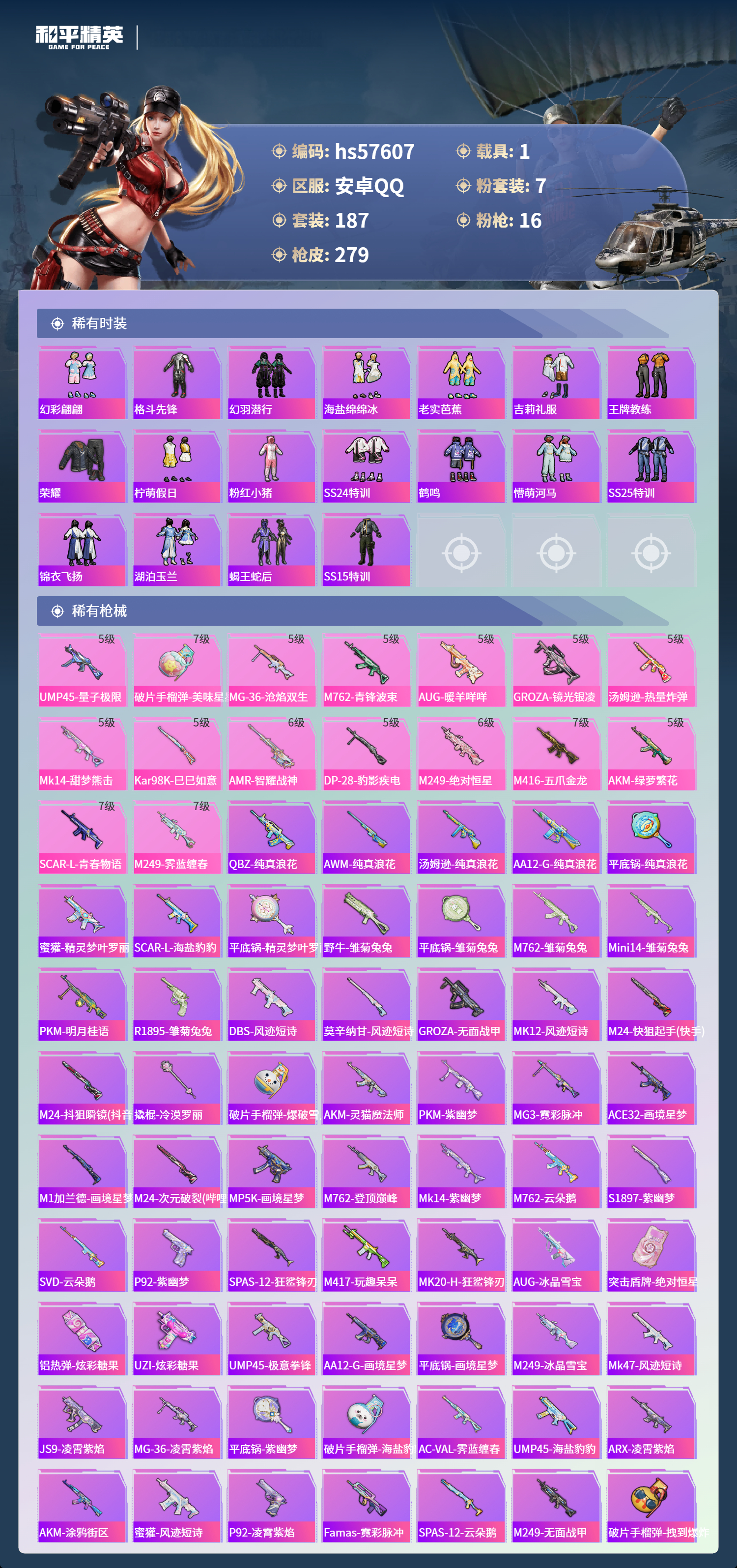 1载具-187套装-279呛皮-hs57607 安卓手q-16王牌印记-有战神框-7粉装-16特效呛-1载具-87457热力值-187套装-279呛皮-2卓越印记-1传奇印记【7粉装】角色-洛天依套装-缤纷油彩角色-绝对恒星角色-守护天翼角色-花灵角色-霁蓝缠春套装-幻彩电音【16特效呛】scar-l-青春物语/7级aug-暖羊咩咩/5级破片手留单-美味星星糖/7级m762-青锋波束/5级m249-霁蓝缠