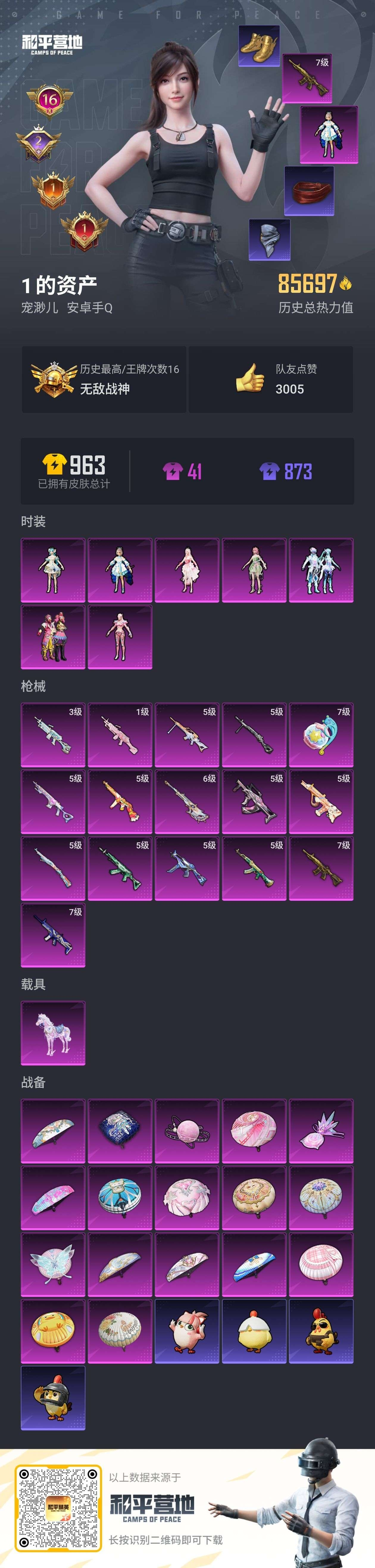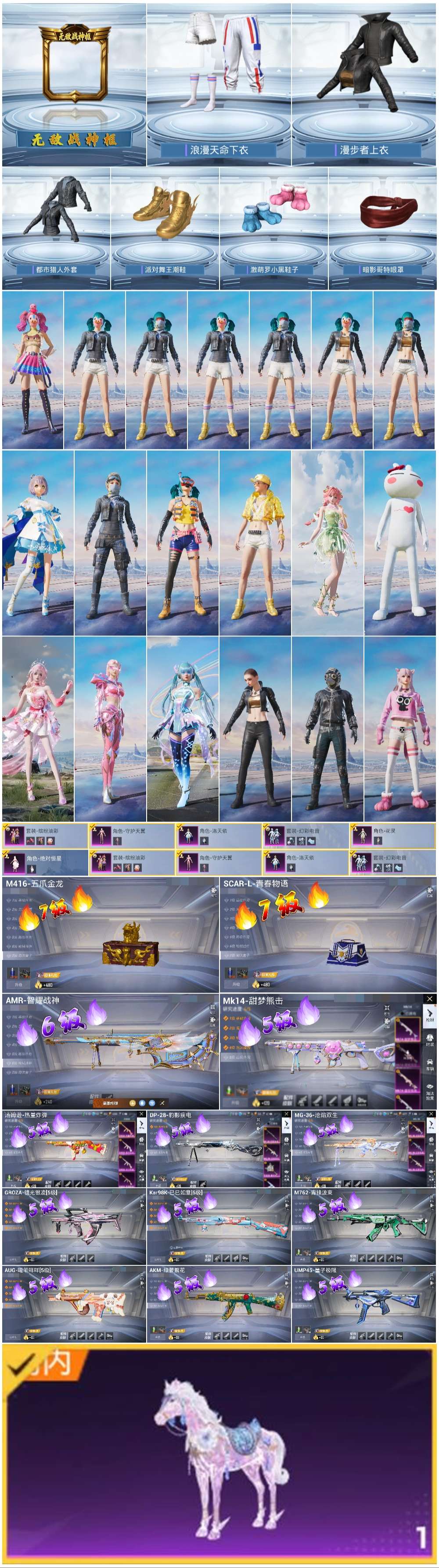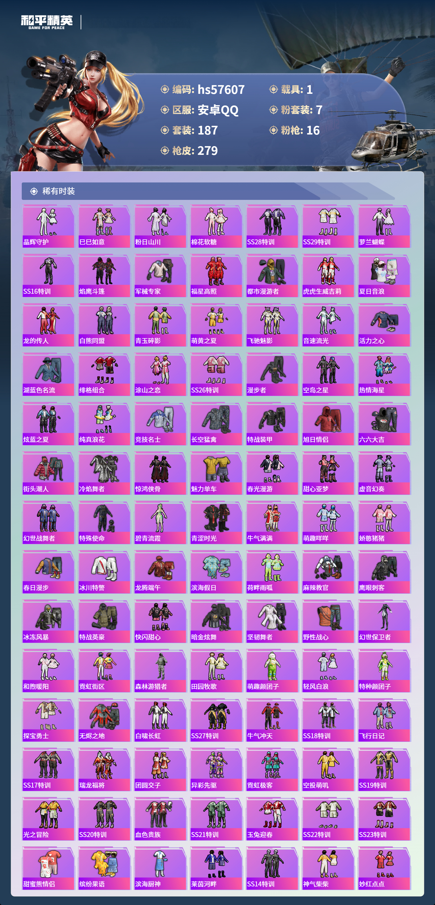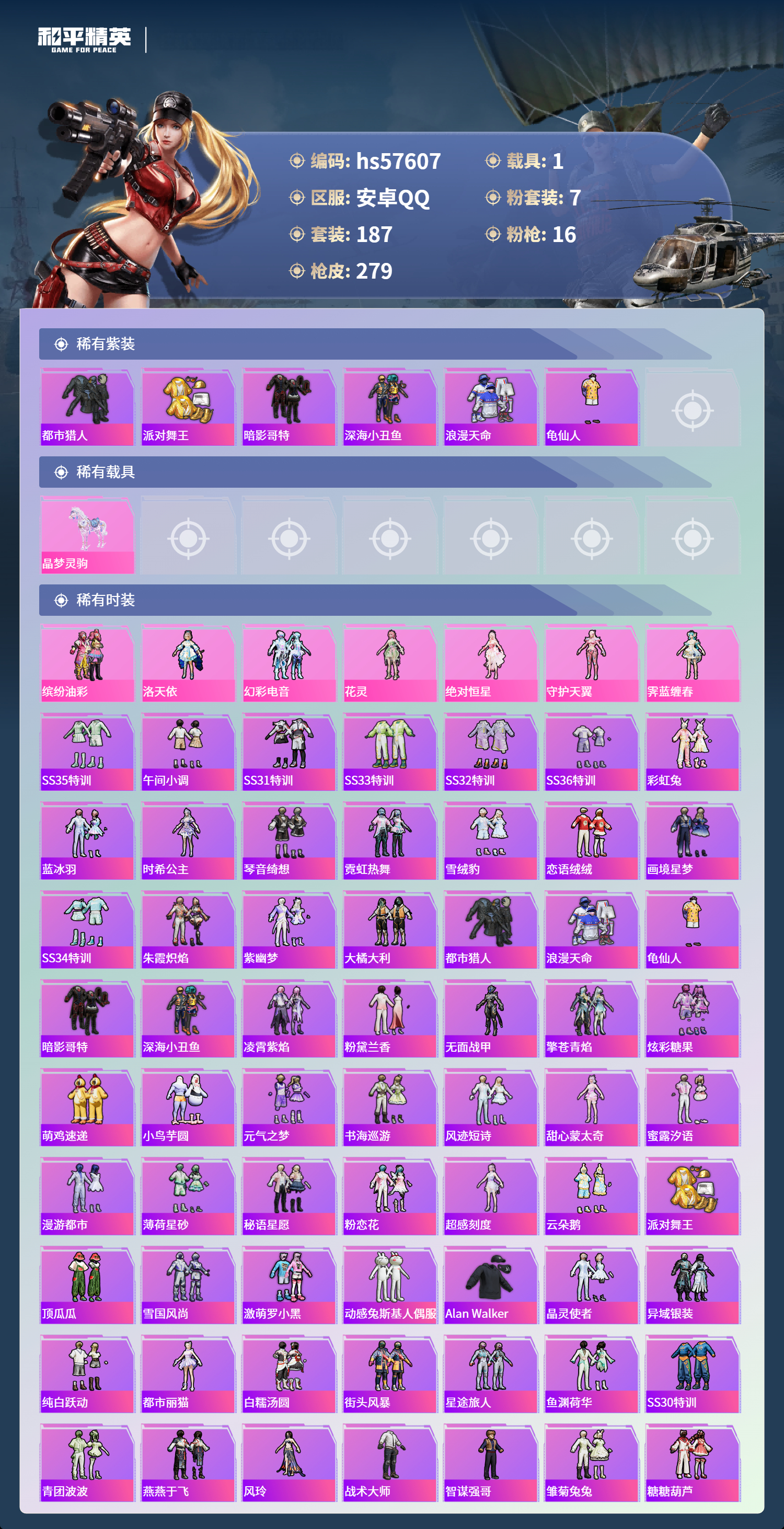 1载具-187套装-279呛皮-hs57607 安卓手q-16王牌印记-有战神框-7粉装-16特效呛-1载具-87457热力值-187套装-279呛皮-2卓越印记-1传奇印记【7粉装】角色-洛天依套装-缤纷油彩角色-绝对恒星角色-守护天翼角色-花灵角色-霁蓝缠春套装-幻彩电音【16特效呛】scar-l-青春物语/7级aug-暖羊咩咩/5级破片手留单-美味星星糖/7级m762-青锋波束/5级m249-霁蓝缠