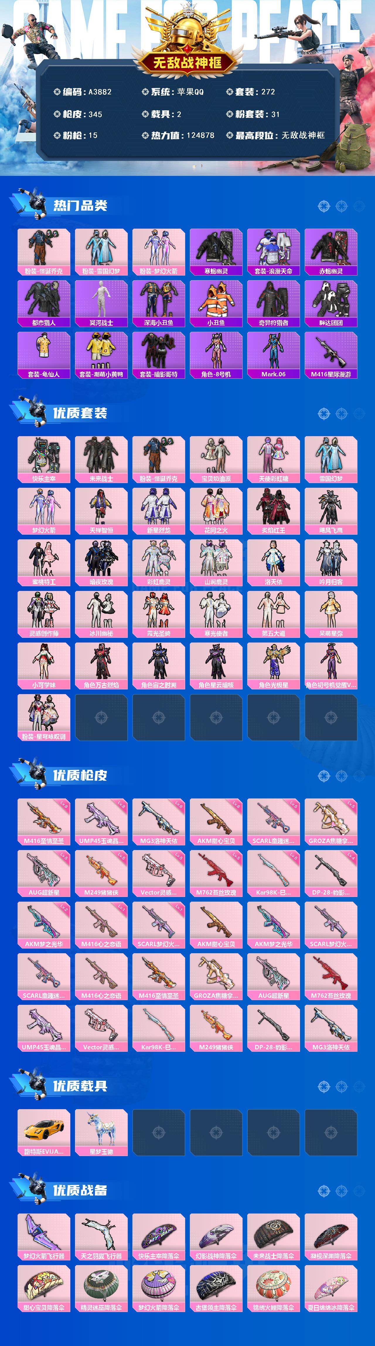[15664069]苹果【素材号/怪诞乔克/雪国幻梦/梦幻火箭/寒蝎幽灵/都市猎人/暗影哥特/蓝螳螂/m416-星际漫游/百万伏特背包/萌熊伴侣背包】 手q-无敌战神框-31粉装-15特效呛-2载具-3粉色飞行器-124878热力值-19王牌印记-272套装-345呛皮 【热门品类】:粉装-怪诞乔克,粉装-雪国幻梦,粉装-梦幻火箭,套装-寒蝎幽灵,套装-浪漫天命,套装-赤蝎幽灵,套装-都市猎人,套装-冥河战士,套装-深海小丑鱼,套装-小丑鱼,套装-奇异狩猎者,套装-胖达团团,套装-龟仙人,套装-潮萌小黄鸭,套装-暗影哥特,角色-8号机,角色-mark.06,m416-星际漫游 【粉色套装】:粉装-快乐主宰,粉装-未来战士,粉装-怪诞乔克,粉装-宝贝奶油派,粉装-天使彩虹糖,粉装-雪国幻梦,粉装-梦幻火箭,粉装-天禅智恒,粉装-新星烈龙,粉装-花间之火,粉装-炙焰红王,粉装-飓风飞鹰,粉装-蜜桃特工,粉装-暗夜玫瑰,粉装-彩虹鹿灵,粉装-山涧鹿灵,角色-洛天依,粉装-吟月归客,粉装-灵感创作师,粉装-冰川幽秘,粉装-霞光圣骑,粉装-寒光使者,粉装-第五大道,角色-呆萌星弥,角色-小可学妹,角色-万古烈焰,角色-宙之时溯,角色-星云暗核,角色-光极星,角色-初号机 觉醒ver.,粉装-星穹咏叹调 【粉色呛皮等级】:akm-甜心宝贝六级,akm-梦之光华二级,scar-l-梦幻火箭一级,scar-l-童趣迷兔五级,m416-心之恋语一级,m416-至情至圣九级,groza-焦糖拿铁五级,aug-超新星五级,m762-苔丝玫瑰五级,ump45-玉魂晶魄八级,vect-灵感创作师五级,kar98k-巳巳如意五级,m249-猪猪侠五级,dp-28-豹影疾电四级,mg3-洛神天依六级 【粉色载具】:路特斯evija(星际黄),星梦玉骢 【粉色呛皮】:akm-甜心宝贝,akm-梦之光华,scar-l-梦幻火箭,scar-l-童趣迷兔,m416-心之恋语,m416-至情至圣,groza-焦糖拿铁,aug-超新星,m762-苔丝玫瑰,ump45-玉魂晶魄,vect-灵感创作师,kar98k-巳巳如意,m249-猪猪侠,dp-28-豹影疾电,mg3-洛神天依 【粉色飞行器】:梦幻火箭飞行器,天之羽翼飞行器 【粉色降落伞】:快乐主宰降落伞,