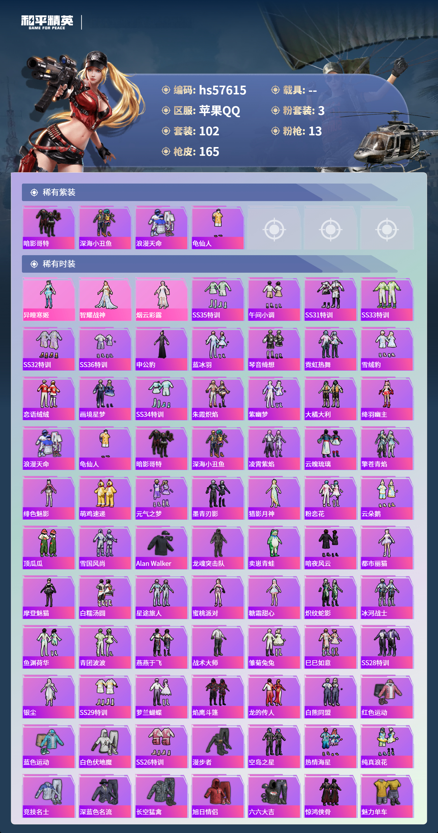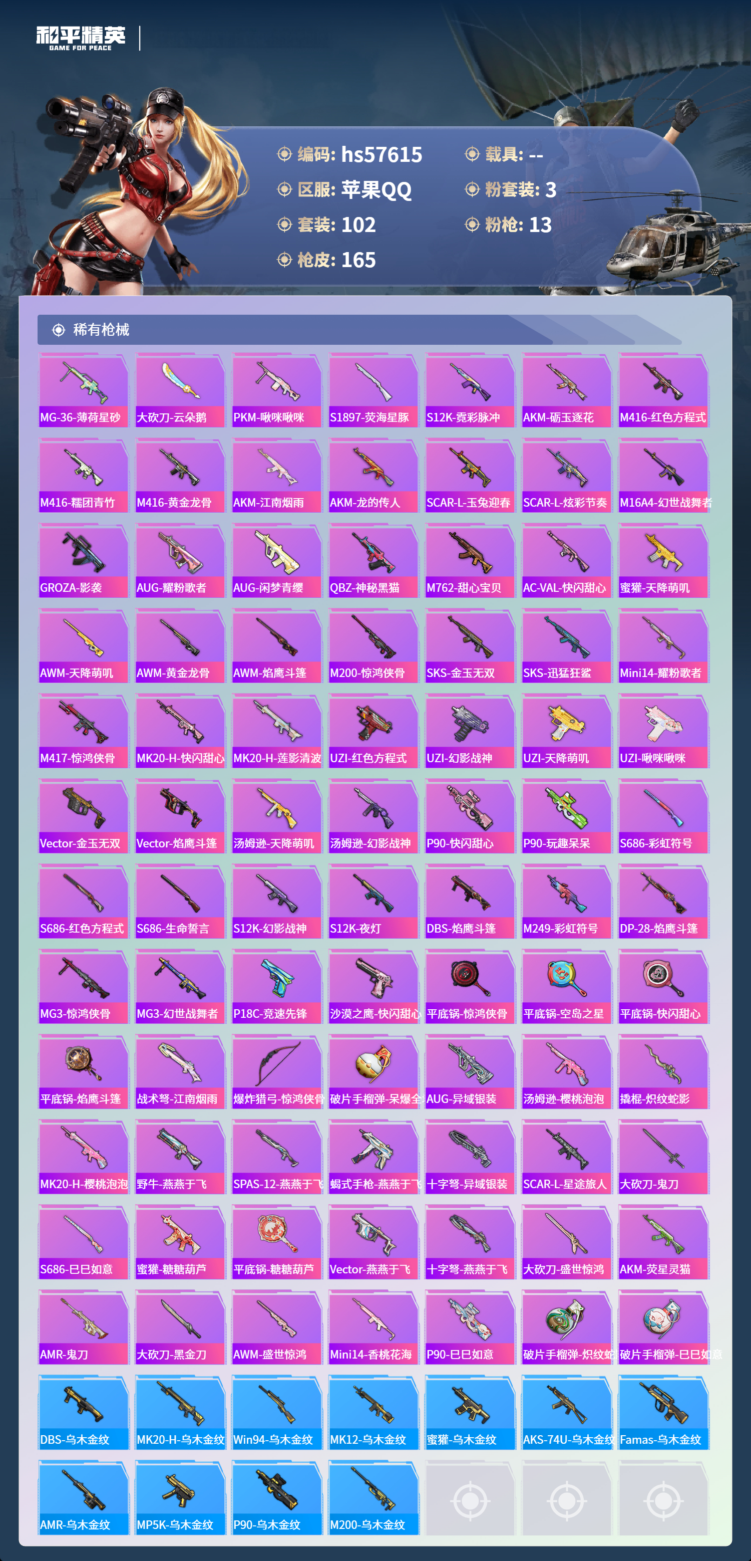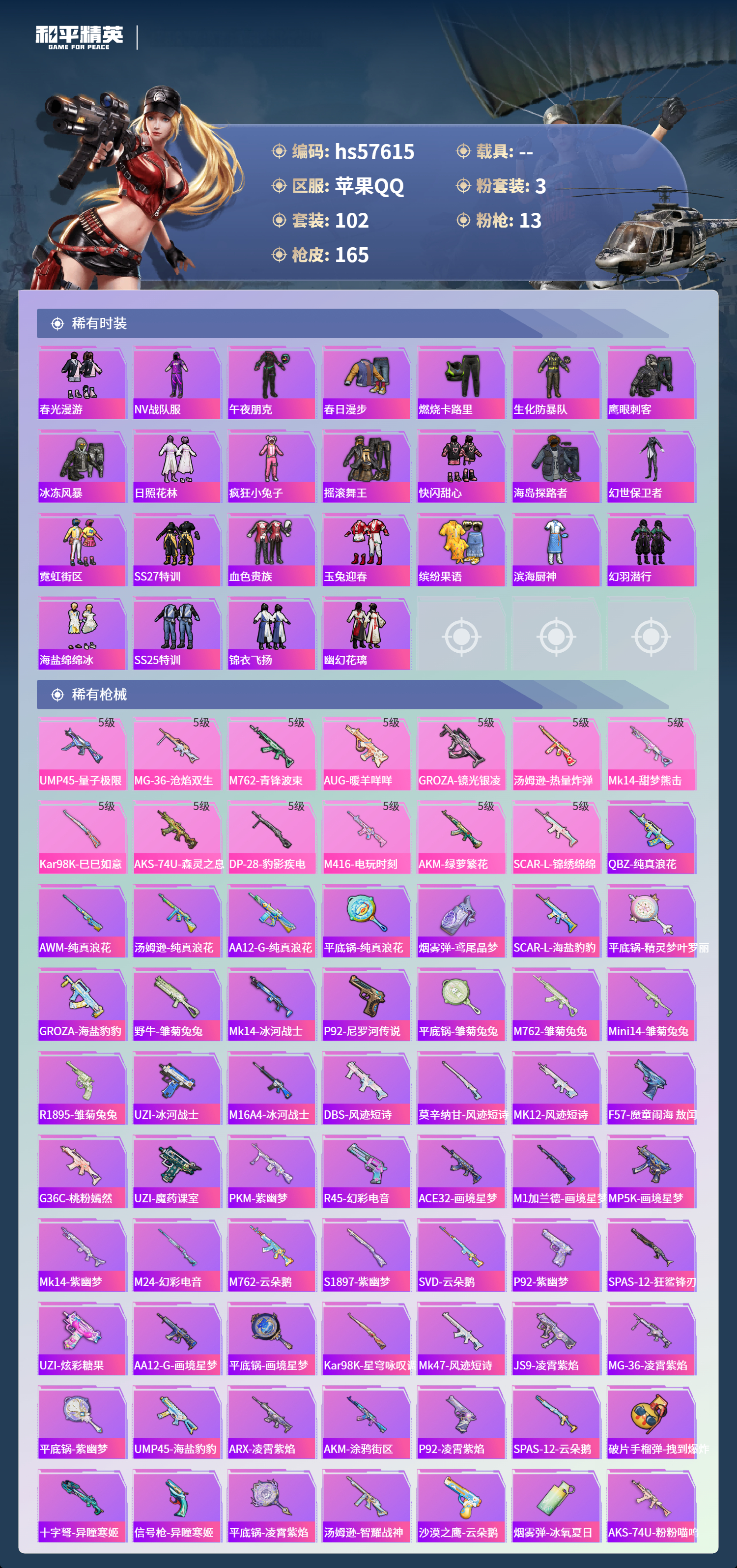 0载具-102套装-165呛皮-hs57615 苹果手q-9王牌印记-3粉装-13特效呛-48008热力值-102套装-165呛皮-1卓越印记【3粉装】角色-智耀战神角色-烟云彩露角色-异瞳寒姬【13特效呛】ump45-量子极限/5级mk14-甜梦熊击/5级aks-74u-森灵之息/5级汤姆逊-热量炸弹/5级kar98k-巳巳如意/5级m762-青锋波束/5级scar-l-锦绣绵绵/5级mg-36-沧焰双生