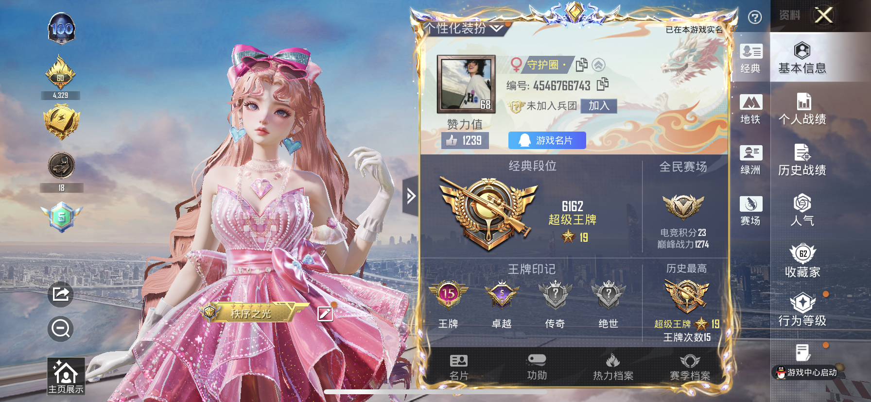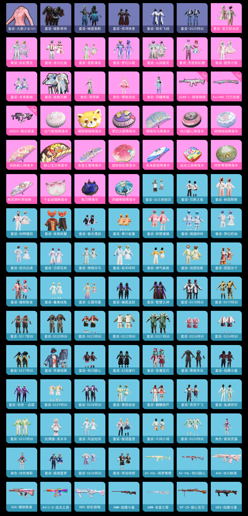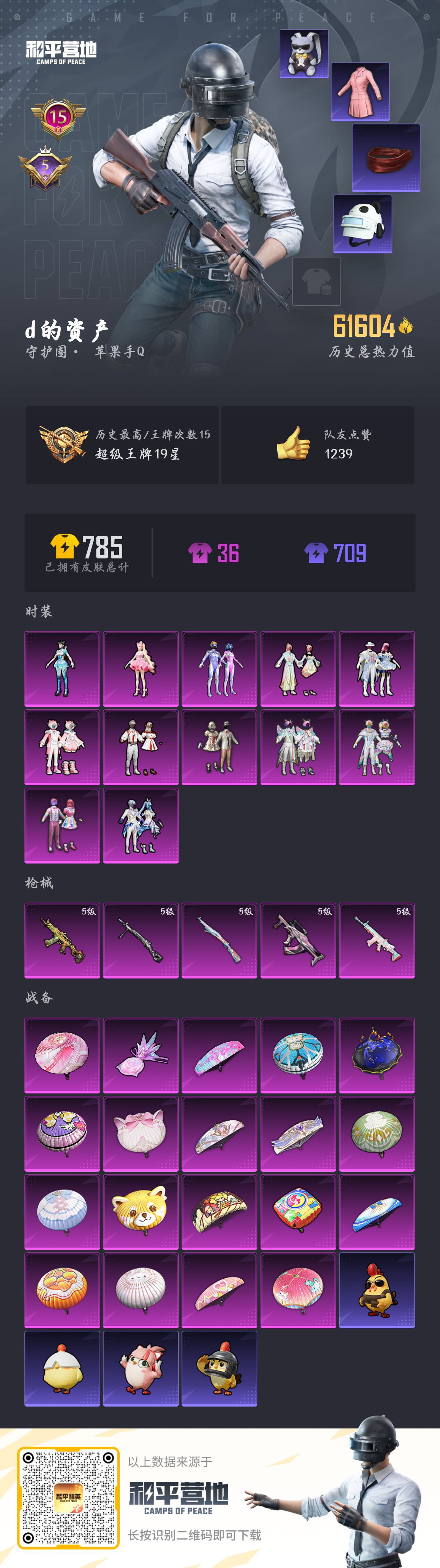 【和平精英】【txhp6167】12粉装,5特效呛,0载具,历史最高段位:超级王牌19星 王牌印记15次 热力值:61604,173套装,198呛械,253装备,136战备;套装:套装-宝贝奶油派,套装-天使彩虹糖,套装-梦幻火箭,套装-独舞天鹅,套装-彩虹鹿灵,套装-山涧鹿灵,套装-甜梦小狐,套装-冰川红玫,套装-莲影清波,套装-未来歌姬,角色-异瞳寒姬,角色-樱桃泡泡,套装-特训学院,套装-猎鹰,套装-青年教官,套装-橘黑制服,套装-红色运动,套装-黄色运动,套装-蓝色运动,套装-黄色伏地魔,套装-白色伏地魔,套装-黑色伏地魔,套装-骑行爱好者,套装-竞技名士,套装-深蓝色名流,套装-酒红色名流,套装-湖蓝色名流,套装-黄色名流,套装-猛禽,套装-长空猛禽,套装-旭日情侣,套装-冷焰舞者,套装-灼焰舞者,套装-特战装甲,套装-浪漫假日,套装-战地督导,套装-青春校园,套装-甜蜜告白,套装-滨海假日,套装-完美偶像,套装-人气偶像,套装-幻影武者,套装-街头潮人,套装-蓝彩潮人,套装-怒火燎原,套装-魅力单车,套装-绮丽涂鸦,套装-竞技达人朋克,套装-野性战心,套装-破晓战魂,套装-都市魅力,套装-荣耀,套装-火箭少女101,套装-极地朋克,套装-幻世战舞者,套装-暗影哥特,套装-弄潮海豚,套装-呆萌铁蟹,套装-甜蜜熊情侣,套装-青涩时光,套装-缤纷果语,套装-龙魂突击队,套装-元素星魂,套装-极速红龙,套装-麻辣教官,套装-恶魔宝贝,套装-黑夜传说,套装-破蛋小黄鸡,套装-军械专家,套装-鹤鸣,套装-霓虹街区,套装-智慧之神,套装-萌黄之夏,套装-夏日音浪,套装-探宝勇士,套装-牛气满满,套装-战术大师,套装-牛气冲天,套装-ss18特训,套装-耀粉歌者,套装-飞行日记,套装-暗夜魅影,套装-ss17特训,套装-团圆交子,套装-福星高照,套装-空投萌叽,套装-ss19特训,套装-炫蓝之夏,套装-ss20特训,套装-粉团憨憨,套装-软羊咩咩,套装-ss21特训,套装-萌趣咩咩,套装-娇憨猪猪,套装-梦幻奶油,套装-玉兔迎春,套装-ss22特训,套装-和煦暖阳,套装-田园牧歌,套装-轻风白浪,套装-光之冒险,套装-绯格组合,套装-ss23特训,套装-白兰地假日,套装-神气柴柴,套装-懵萌河马,套装-王牌教练,套装-柠萌假日,套装-青玉碎影,套装-ss24特训,套装-日照花林,套装-龟仙人,套装-涂山之恋,套装-ss25特训,套装-惊鸿侠骨,套装-锦衣飞扬,套装-云霞荷露,套装-香桃花海,套装-果汁能量,套装-龙的传人,套装-冰河战士,套装-ss26特训,套装-快闪甜心,套装-春光漫游,套装-空岛之星,套装-童真绒兔,套装-贝斯之夜,套装-焰鹰斗篷,套装-幽夜迷踪,套装-幻羽潜行,套装-ss27特训,套装-恋语绒绒,套装-老实芭蕉,套装-ss28特训,套装-街头风暴,套装-海盐绵绵冰,套装-蝶变,套装-创世·追猎,套装-ss29特训,角色-绯色魅影,角色-紫俏灵猫,套装-异域银装,套装-星途旅人,角色-临安公主,套装-ss30特训,套装-青团波波,套装-糖糖葫芦,套装-ss31特训,套装-鱼渊荷华,套装-燕燕于飞,角色-海琴烟,套装-ss33特训,套装-巳巳如意,套装-ss32特训,套装-青翼流星,套装-顶瓜瓜,套装-狂鲨锋刃,套装-大橘大利,套装-炫彩糖果,玩偶服-美羊羊,套装-元气之梦,套装-ss34特训,套装-薄荷星砂,套装-ss35特训,套装-午间小调,套装-秘语星愿,套装-风迹短诗,套装-琴音绮想,套装-粉黛兰香,套装-画境星梦,套装-ss36特训,套装-雪国风尚,套装-萌鸡速递;呛皮:aug-甜蜜菠萝,aug-耀粉歌者,aug-冰川粉黛,aug-天降萌叽,aug-异域银装,aug-冰晶雪宝,5级groza-镜光银凌,groza-田园牧歌,groza-懵萌河马,groza-海盐豹豹,groza-荧海星豚,m762-甜心宝贝,m762-彩虹符号,m762-天降萌叽,akm-霓虹街区,akm-彩虹符号,akm-龙的传人,akm-荧星灵猫,akm-霓彩脉冲,5级scar-l-锦绣绵绵,scar-l-炫彩节奏,scar-l-玉兔迎春,scar-l-是爱神辣,scar-l-星途旅人,scar-l-海盐豹豹,蜜獾-娇憨猪猪,蜜獾-垂柳戏鸭,蜜獾-天降萌叽,蜜獾-精灵梦叶罗丽,蜜獾-糖糖葫芦,蜜獾-风迹短诗,蜜獾-乌木金纹,mk47-乌木金纹,mk47-风迹短诗,g36c-懵萌河马,g36c-星穹咏叹调,g36c-乌木金纹,m16a4-幻世战舞者,m16a4-莲影清波,m16a4-冰河战士,m416-夜灯,m416-糯团青竹,ac-val-乌木金纹,ac-val-天降萌叽,ac-val-闲梦青缨,ac-val-快闪甜心,q-妙趣可丽,q-未来歌姬,ace32-画境星梦,ace32-冰晶雪宝,famas-乌木金纹,莫辛纳甘-乌木金纹,莫辛纳甘-懵萌河马,莫辛纳甘-风迹短诗,win94-乌木金纹,amr-乌木金纹,m24-天降萌叽,m24-幻彩电音,m24-乌木金纹,m200-仲夏莫吉托,m200-惊鸿侠骨,m200-乌木金纹,5级kar98k-巳巳如意,kar98k-梦幻火箭,kar98k-炫彩节奏,awm-圣堂之誓,awm-焰鹰斗篷,awm-奇迹舞步,slr-娇憨猪猪,slr-金丰海韵,vss-田园牧歌,vss-彩虹符号,vss-香桃花海,qbu-飒粉甜心,m1加兰德-画境星梦,mk20-h-快闪甜心,mk20-h-星途旅人,mk20-h-糖糖葫芦,mk20-h-狂鲨锋刃,mk20-h-乌木金纹,sks-炫彩节奏,sks-糯团青竹,sks-未来歌姬,mini14-梦幻火箭,mini14-耀粉歌者,mini14-涂山之恋,mini14-香桃花海,mk14-乌木金纹,mk14-海螺星光,mk14-冰河战士,mk14-薄荷星砂,m417-惊鸿侠骨,mk12-风迹短诗,mk12-乌木金纹,5级aks-74u-森灵之息,aks-74u-鬼刀,aks-74u-鸡智如我,aks-74u-乌木金纹,p90-飞驰魅影,p90-倾城蜜语,p90-快闪甜心,p90-玩趣呆呆,p90-巳巳如意,p90-乌木金纹,ump45-生命誓言,ump45-涂山之恋,ump45-炫光之旅,ump45-海盐豹豹,ump45-糖糖葫芦,ump45-极意拳锋,uzi-炫彩节奏,uzi-娇憨猪猪,uzi-冰河战士,uzi-啾咪啾咪,uzi-炫彩糖果,vect-田园牧歌,vect-焰鹰斗篷,vect-燕燕于飞,野牛-燕燕于飞,野牛-乌木金纹,汤姆逊-耀粉歌者,汤姆逊-林间仙鹿,汤姆逊-暗夜鎏金,汤姆逊-天降萌叽,mp5k-画境星梦,mp5k-乌