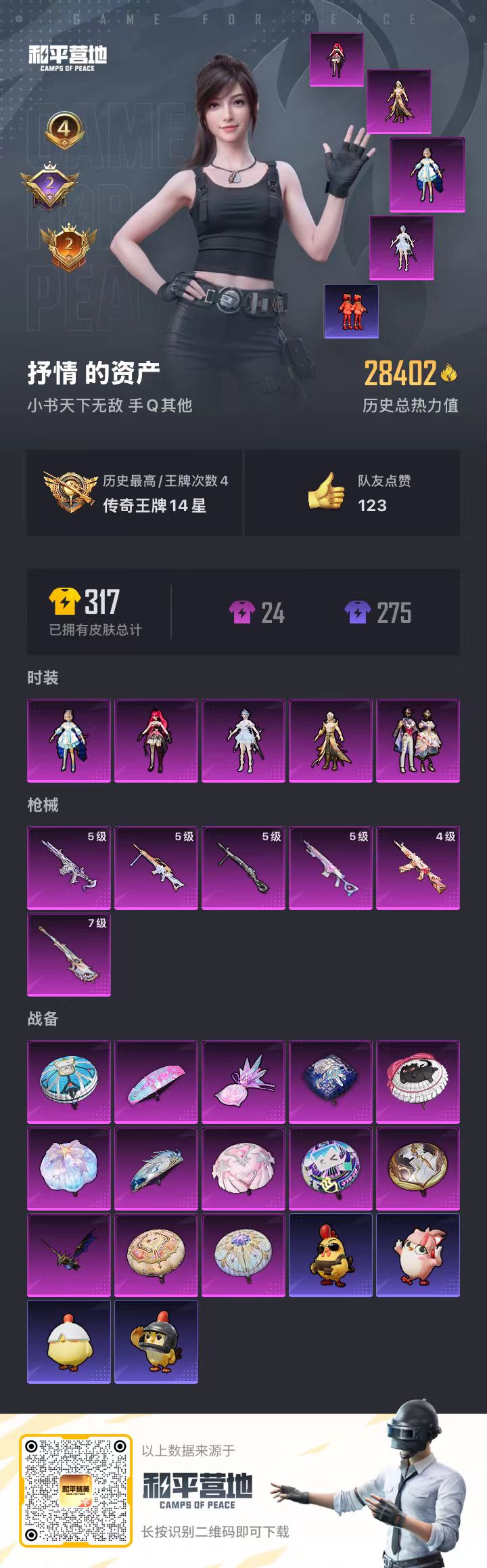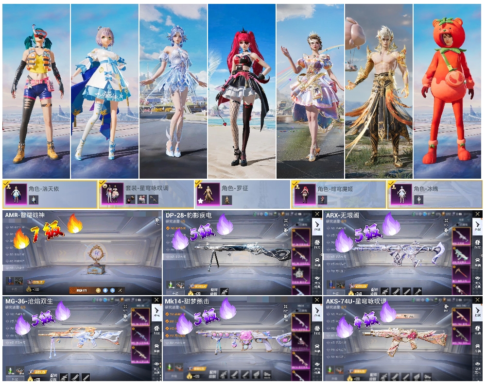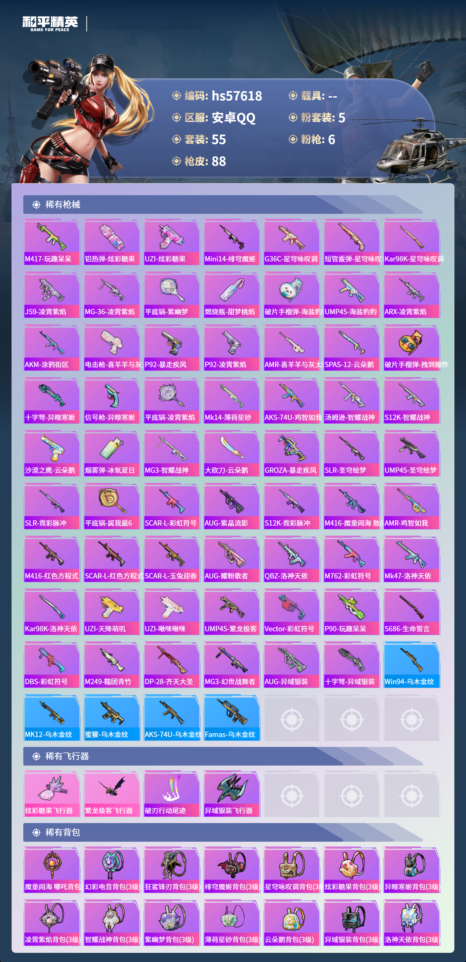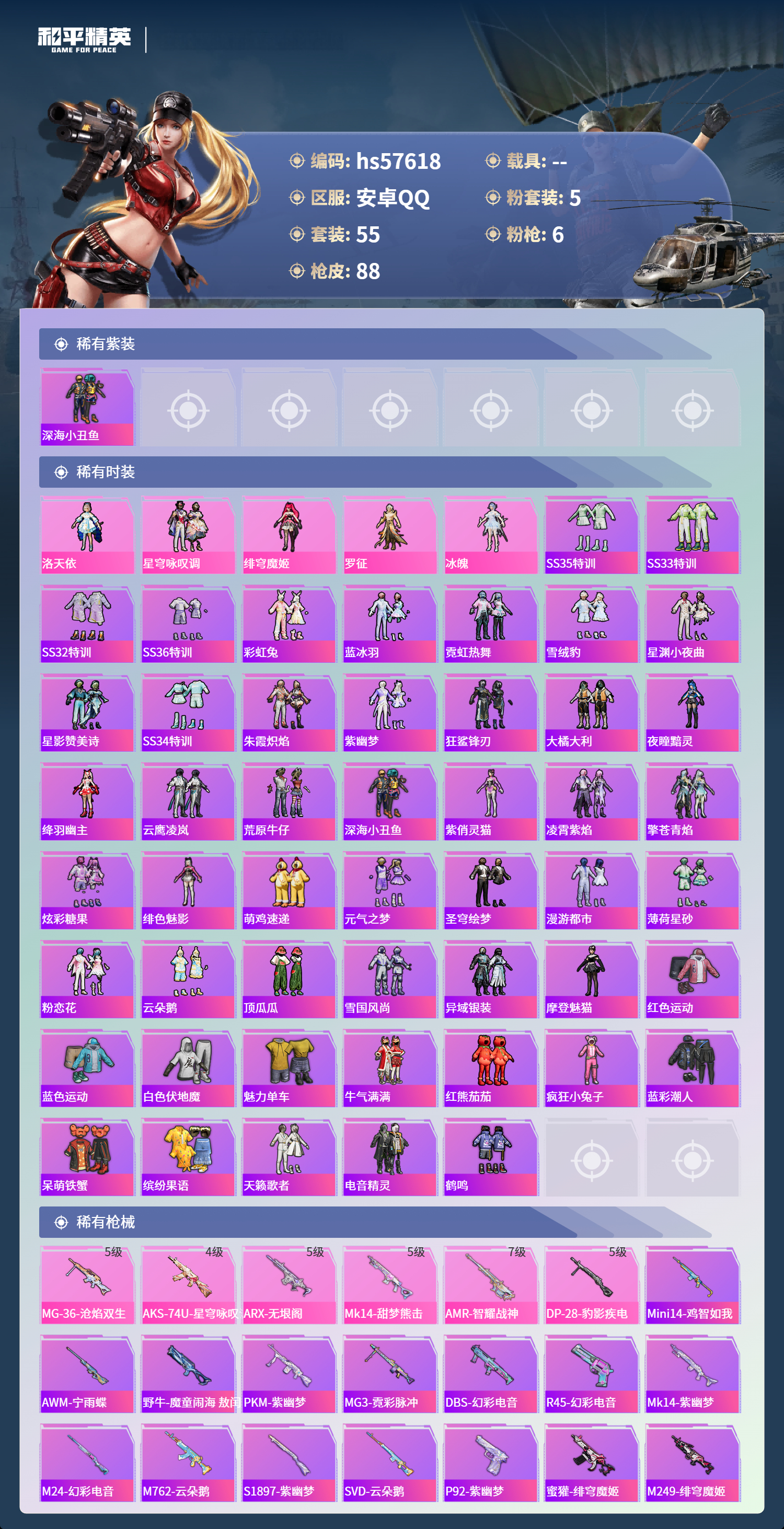 0载具-55套装-88呛皮-hs57618 安卓手q-4王牌印记-5粉装-6特效呛-28402热力值-55套装-88呛皮-2卓越印记-2传奇印记【5粉装】角色-绯穹魔姬角色-洛天依套装-星穹咏叹调角色-罗征角色-冰魄【6特效呛】arx-无垠阁/5级dp-28-豹影疾电/5级mk14-甜梦熊击/5级amr-智耀战神/7级mg-36-沧焰双生/5级aks-74u-星穹咏叹调/4级【1稀有紫装】深海小丑鱼
