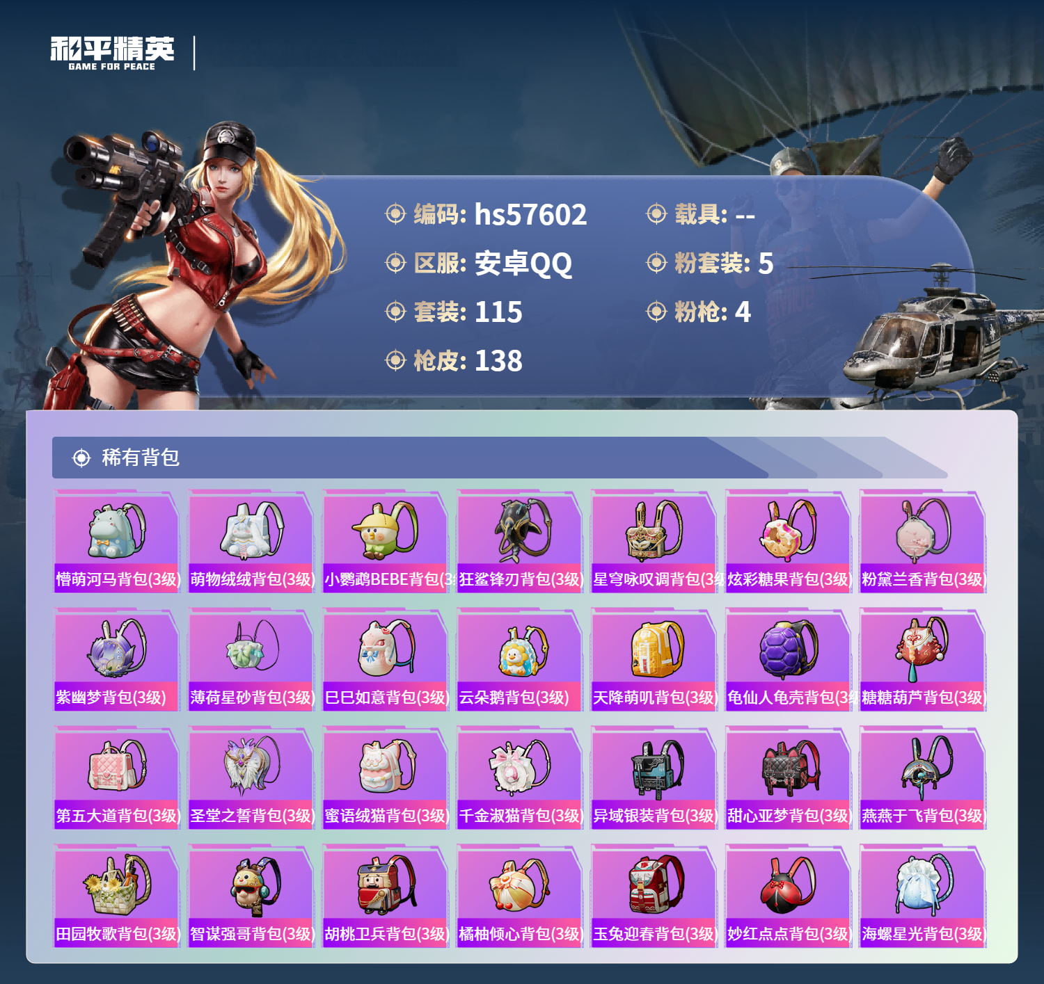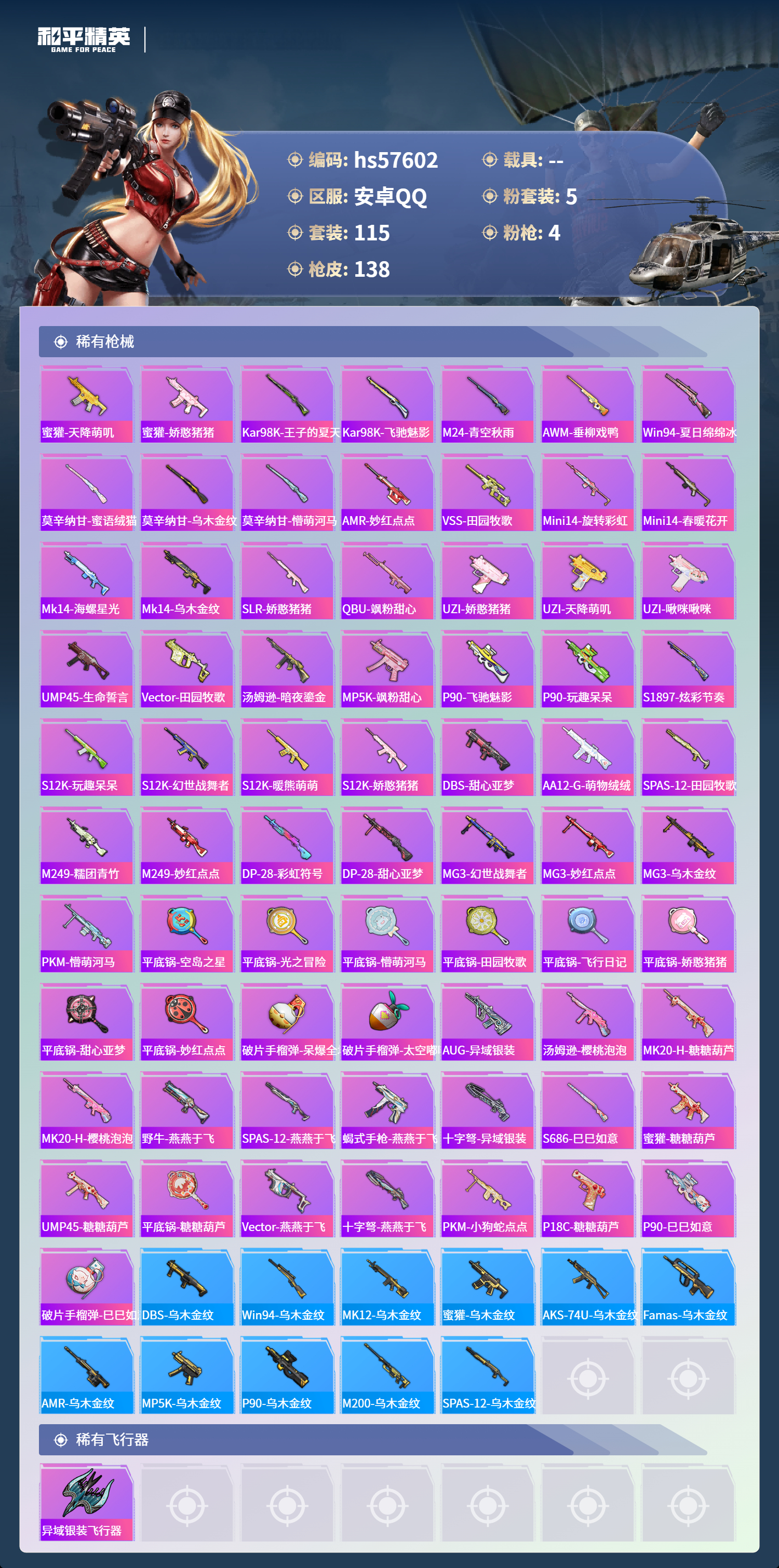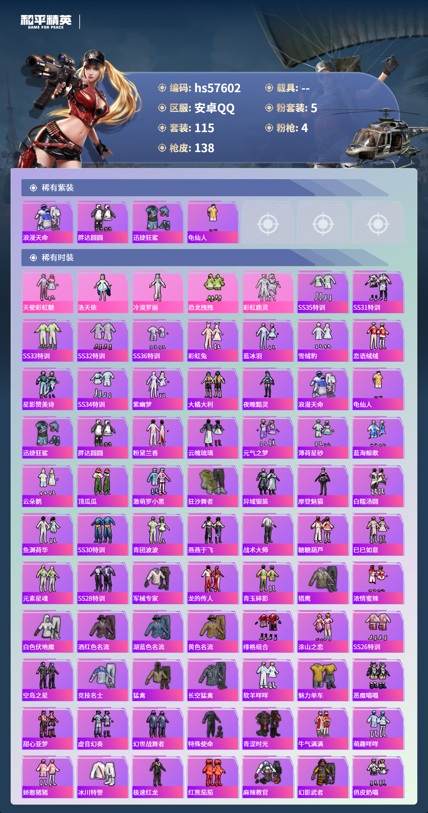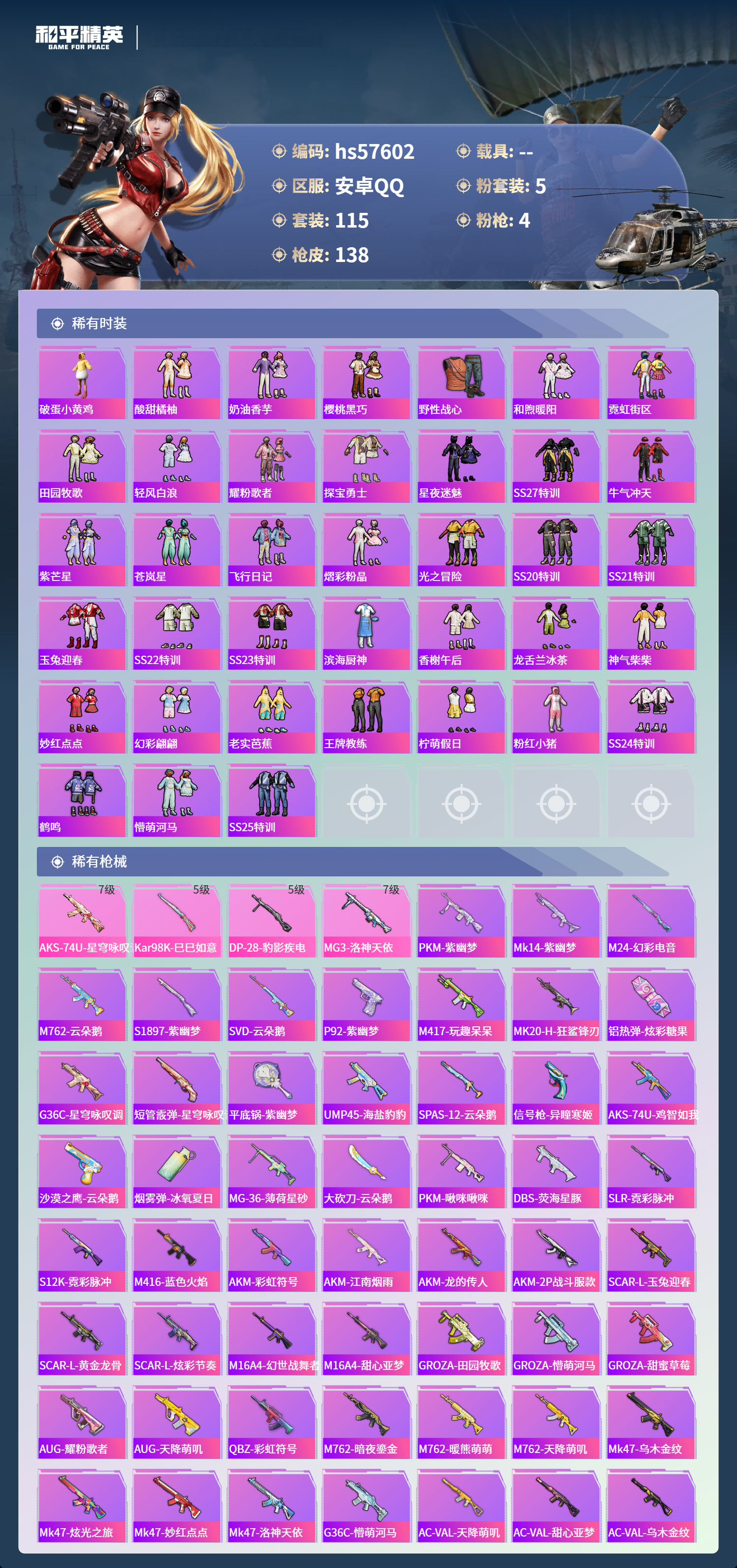 0载具-115套装-138呛皮-hs57602 安卓手q-8王牌印记-5粉装-4特效呛-45180热力值-115套装-138呛皮-3卓越印记-1传奇印记【5粉装】套装-恐龙拽拽套装-彩虹鹿灵套装-天使彩虹糖角色-冷漠罗丽角色-洛天依【4特效呛】dp-28-豹影疾电/5级mg3-洛神天依/7级kar98k-巳巳如意/5级aks-74u-星穹咏叹调/7级【4稀有紫装】浪漫天命胖达圆圆迅捷狂鲨龟仙人【115