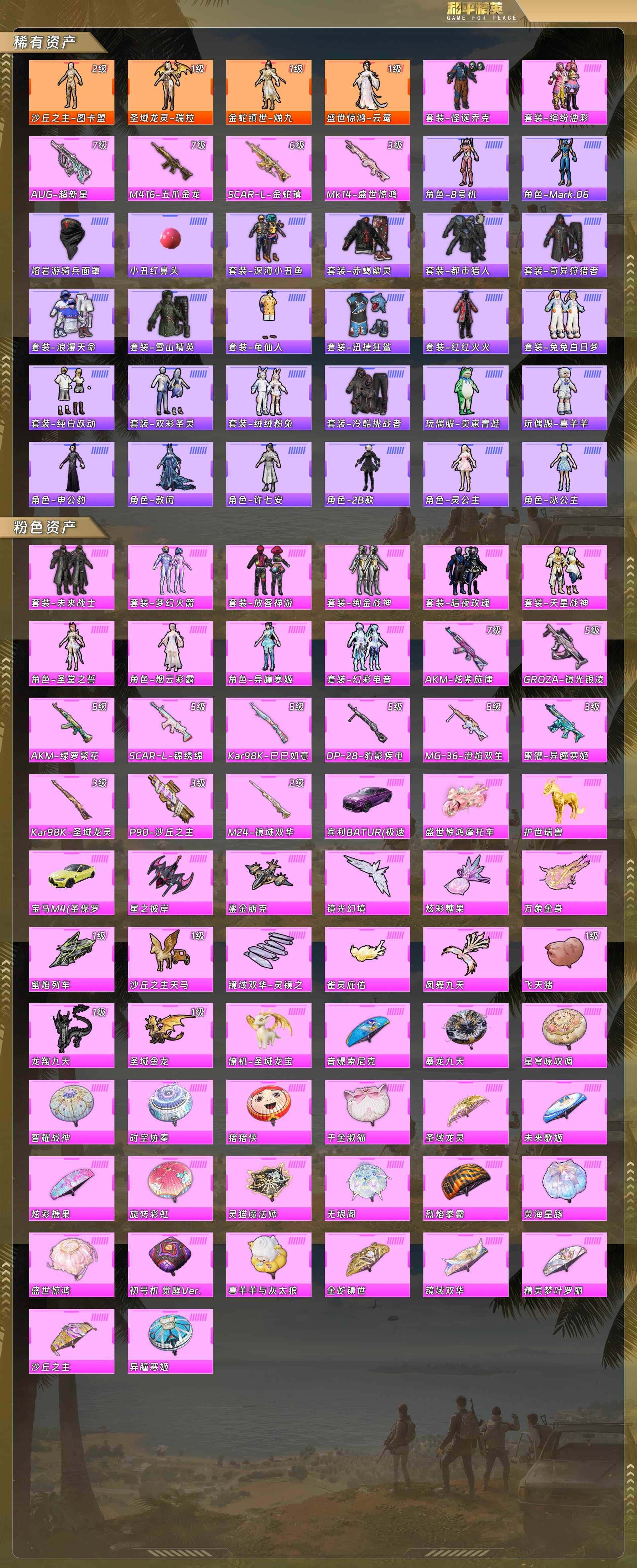 素材号-地铁满天赋-2级图卡盟-瑞拉-烛九-云鸾-小丑-都市-赤蝎-发光眼罩/蓝螳螂/深海小丑鱼/浪漫天命/猪脸/梦幻火箭/未来战士/绚金战神/圣堂之誓/烟云彩露/aug超新星7级/m4五爪金龙7级/scar金蛇镇世6级/mk盛世惊鸿3级/ak炫紫旋律7级/98k圣域龙灵3级/p90沙丘之主3级/宾利紫/盛世惊鸿摩托/护世瑞兽/宝马黄(4神装12粉套15粉呛4载具)没战神框hp5060-13粉色飞行器-115524热力值-13王牌印记-226套装-310呛皮 【红色神装等级】:圣域龙灵-瑞拉一级,金蛇镇世-烛九一级,盛世惊鸿-云鸾一级,沙丘之主-图卡盟二级 【红色角色神装】:圣域龙灵-瑞拉,金蛇镇世-烛九,盛世惊鸿-云鸾,沙丘之主-图卡盟 【热门品类】:粉装-怪诞乔克,粉装-梦幻火箭,粉装-缤纷油彩,套装-浪漫天命,套装-赤蝎幽灵,套装-都市猎人,套装-深海小丑鱼,套装-小丑鱼,套装-奇异狩猎者,角色-2b战斗服款,套装-龟仙人,套装-红红火火,角色-8号机,角色-mark.06,熔岩游骑兵连帽夹克 【粉色套装】:粉装-未来战士,粉装-怪诞乔克,粉装-梦幻火箭,粉装-缤纷油彩,粉装-放客神游,粉装-绚金战神,粉装-暗夜玫瑰,粉装-天星战神,角色-圣堂之誓,角色-烟云彩露,粉装-幻彩电音,角色-异瞳寒姬 【粉色呛皮等级】:akm-炫紫旋律七级,akm-绿萝繁花五级,scar-l-锦绣绵绵五级,scar-l-金蛇镇世六级,m416-五爪金龙七级,groza-镜光银凌五级,aug-超新星七级,蜜獾-异瞳寒姬三级,p90-沙丘之主三级,kar98k-巳巳如意五级,kar98k-圣域龙灵三级,m24-镜域双华二级,mk14-盛世惊鸿三级,dp-28-豹影疾电五级,mg-36-沧焰双生五级 【粉色载具】:宾利batur(极速紫),宝马m4(圣保罗黄),盛世惊鸿摩托车,僚机-圣域龙宝,护世瑞兽 【粉色呛皮】:akm-炫紫旋律,akm-绿萝繁花,scar-l-锦绣绵绵,scar-l-金蛇镇世,m416-五爪金龙,groza-镜光银凌,aug-超新星,蜜獾-异瞳寒姬,p90-沙丘之主,kar98k-巳巳如意,kar98k-圣域龙灵,m24-镜域双华,mk14-盛世惊鸿,dp-28-豹影疾电,mg-36-沧焰双生 【粉色飞行器】:星之彼岸飞行器,镜光幻境飞行翼,沙丘之主天马,镜域双华-灵镜之阶,鎏金朋克飞行器,龙翔九天飞行器,幽焰列车飞行器,凤舞九天飞行器,万象金身飞行器,圣域金龙飞行器,雀灵庇佑飞行器,飞天猪飞行器 【粉色降落伞】:烈焰拳霸降落伞,旋转彩虹降落伞,音爆索尼克降落伞,未来歌姬降落伞,沙丘之主降落伞,猪猪侠降落伞,镜域双华降落伞,精灵梦叶罗丽降落伞,墨龙九天降落伞,初号机 觉醒ver.降落伞,时空协奏降落伞,千金淑猫降落伞,盛世惊鸿降落伞,金蛇镇世降落伞,圣域龙灵降落伞,智耀战神降落伞,星穹咏叹调降落伞,荧海星豚降落伞,灵猫魔法师降落伞,无垠阁降落伞,喜羊羊与灰太狼降落伞,异瞳寒姬降落伞,炫彩糖果降落伞 【稀有套装】:套装-龟仙人,套装-巳巳如意,套装-小鸟芋圆,套装-雏菊兔兔,套装-萝兰蝴蝶,套装-小熊娃娃,套装-糖糖葫芦,套装-青团波波,套装-棉花软糖,角色-许七安,套装-燕燕于飞,套装-鱼渊荷华,角色-蜜桃派对,套装-粉恋花,套装-紫幽梦,套装-蓝冰羽,角色-瑰梦爱神,套装-星影赞美诗,套装-彩虹兔,套装-云朵鹅,套装-雪绒豹,角色-灵公主,套装-蜜露汐语,套装-朱霞炽焰,套装-凌霄紫焰,套装-擎苍青焰,玩偶服-喜羊羊,角色-敖闰,角色-申公豹,角色-绯色魅影,角色-紫俏灵猫,套装-炫彩糖果 【稀有呛皮】:aug-冰晶雪宝,akm-2p战斗服款,akm-夜灯,akm-影袭,akm-江南烟雨,akm-缤纷海域,akm-萌趣颜团子,akm-霓虹街区,akm-龙的传人,m16a4-生命誓言,m16a4-红色方程式,m16a4-千金淑猫,scar-l-夜灯,scar-l-炫彩节奏,scar-l-玉兔迎春,scar-l-红色方程式,scar-l-黄金龙骨,m416-夜灯,m416-糯团青竹,m416-红色方程式,m416-蓝色火焰,m416-萌萌史莱姆,groza-2b战斗服款,groza-彩虹符号,groza-影袭,groza-懵萌河马,groza-田园牧歌,groza-蓝莓炮弹,aug-2p战斗服款,aug-怪笑疯兔,aug-耀粉歌者,aug-黑白懵懵牛,aug-金蛇镇世,q-彩虹符号,q-未来歌姬,q-神秘黑猫,m762-天降萌叽,m762-彩虹甜喵,m762-牛气冲天,m762-瑞龙福将,m762-云朵鹅,mk47-妙红点点,mk47-炫光之旅,g36c-镜域双华,g36c-懵萌河马,g36c-桃粉嫣然,g36c-星穹咏叹调,ac-val-快闪甜心,蜜獾-千面幻镜,蜜獾-天降萌叽,蜜獾-娇憨猪猪,famas-镜域双华,famas-墨龙九天,arx-凌霄紫焰,uzi-啾咪啾咪,uzi-天降萌叽,uzi-娇憨猪猪,uzi-幻影战神,uzi-影袭,uzi-红色方程式,uzi-盛世惊鸿,ump45-夜灯,ump45-海渊国主,ump45-生命誓言,ump45-金玉无双,vect-焰鹰斗篷,vect-夜灯,vect-彩虹符号,vect-暗夜玫瑰,vect-生命誓言,vect-田园牧歌,汤姆逊-天降萌叽,汤姆逊-耀粉歌者,野牛-沙丘之主,mp5k-飒粉甜心,js9-凌霄紫焰,p90-快闪甜心,p90-金蛇镇世,kar98k-2b战斗服款,kar98k-彩虹符号,kar98k-影袭,m24-影袭,awm-焰鹰斗篷,awm-王牌四分卫,awm-音爆索尼克,awm-黄金龙骨,awm-盛世惊鸿,sks-糯团青竹,sks-迅猛狂鲨,sks-圣域龙灵,vss-彩虹符号,vss-田园牧歌,mini14-旋转彩虹,mini14-春暖花开,mini14-梦幻火箭,mini14-穿刺龙虾,mini14-耀粉歌者,mini14-金玉无双,win94-瑞龙福将,slr-娇憨猪猪,slr-彩虹符号,slr-墨龙九天,莫辛纳甘-懵萌河马,莫辛纳甘-镭金极速,amr-妙红点点,amr-喜羊羊与灰太狼,amr-墨龙九天,m417-惊鸿侠骨,m417-猪猪侠,mk20-h-快闪甜心,mk20-h-莲影清波,mk20-h-净心行者,mk20-h-圣域龙灵,m200-惊鸿侠骨,svd-云朵鹅,svd-冷漠罗丽,mk12-金蛇镇世,s686-奇异狩猎者,s686-彩虹符号,s686-生命誓言,s686-红色方程式,s1897-荧海星豚,s12k-玩趣呆呆,s12k-瑞龙福将,s12k-破晓战魂,s12k-音爆索尼克,s12k-夜灯,s12k-娇憨猪猪,s12k-智耀战神,dbs-焰鹰斗篷,dbs-彩虹符号,aa12-g-炫