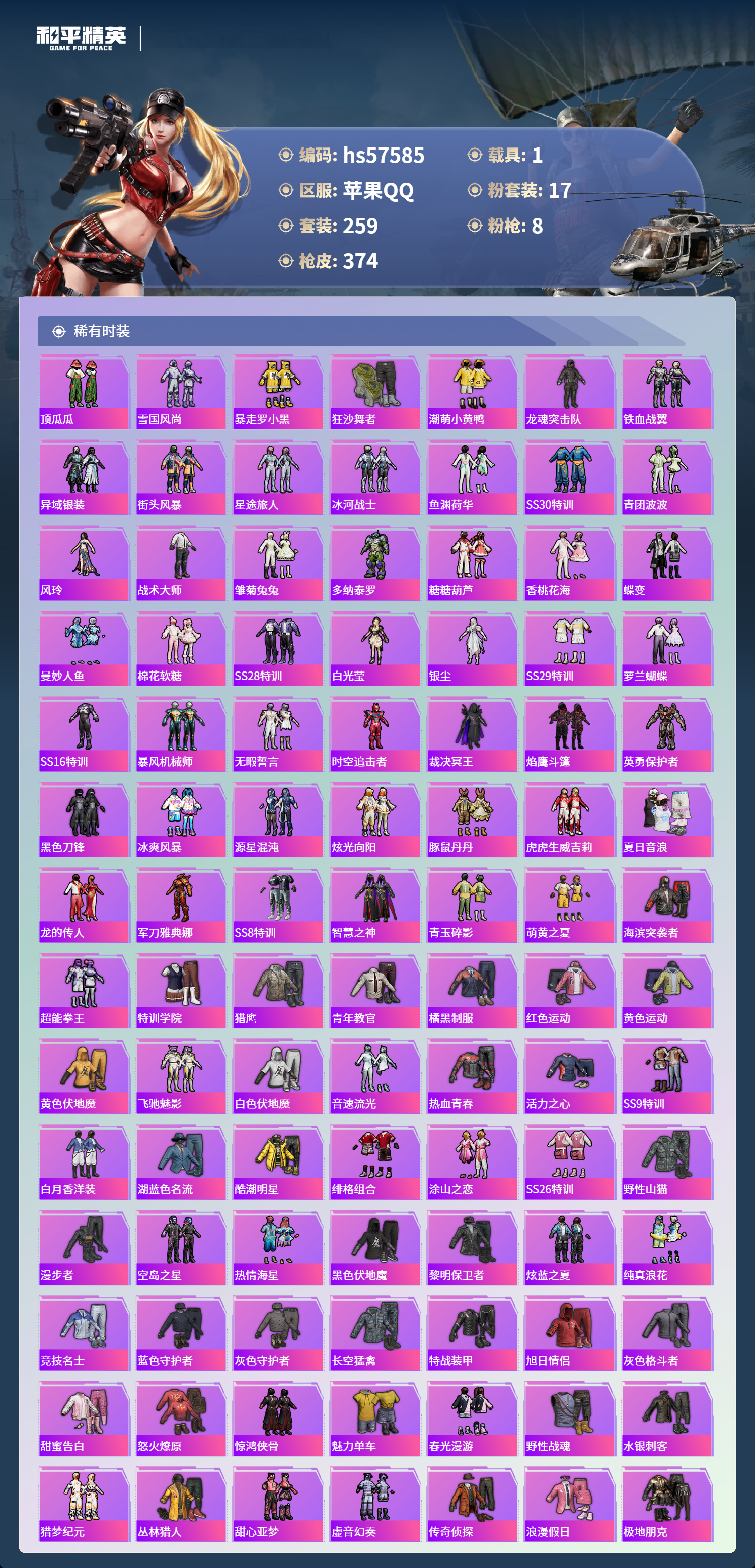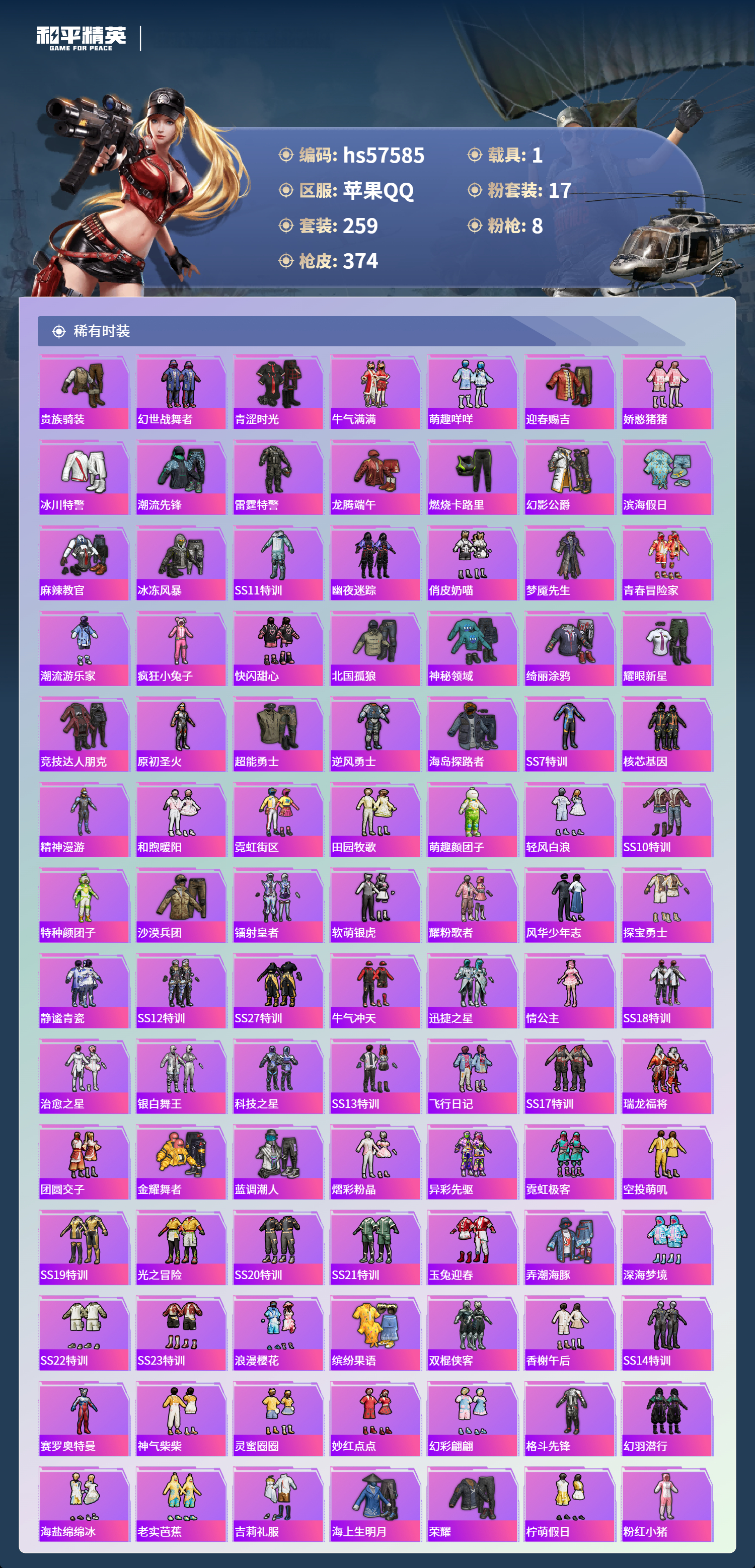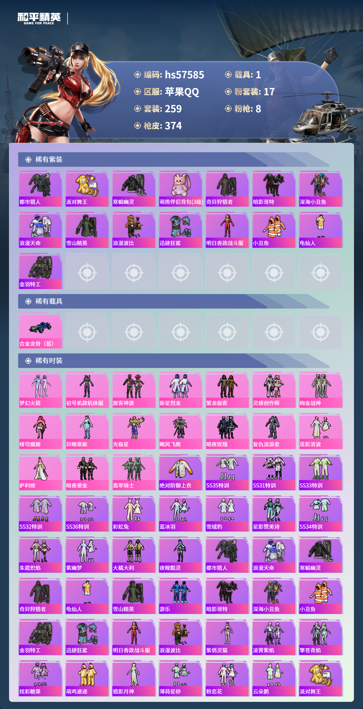 1载具-259套装-374呛皮-hs57585 苹果手q-19王牌印记-17粉装-8特效呛-1载具-热力值-259套装-374呛皮-7卓越印记-3传奇印记【17粉装】角色-初号机款机体服套装-翡翠骑士套装-繁龙极客套装-飓风飞鹰套装-梦幻火箭角色-绯穹魔姬套装-暗夜玫瑰套装-灵感创作师套装-绚金战神套装-暗夜鎏金角色-光极星套装-新星烈龙角色-异瞳寒姬角色-萨利娅套装-莲影清波角色-复