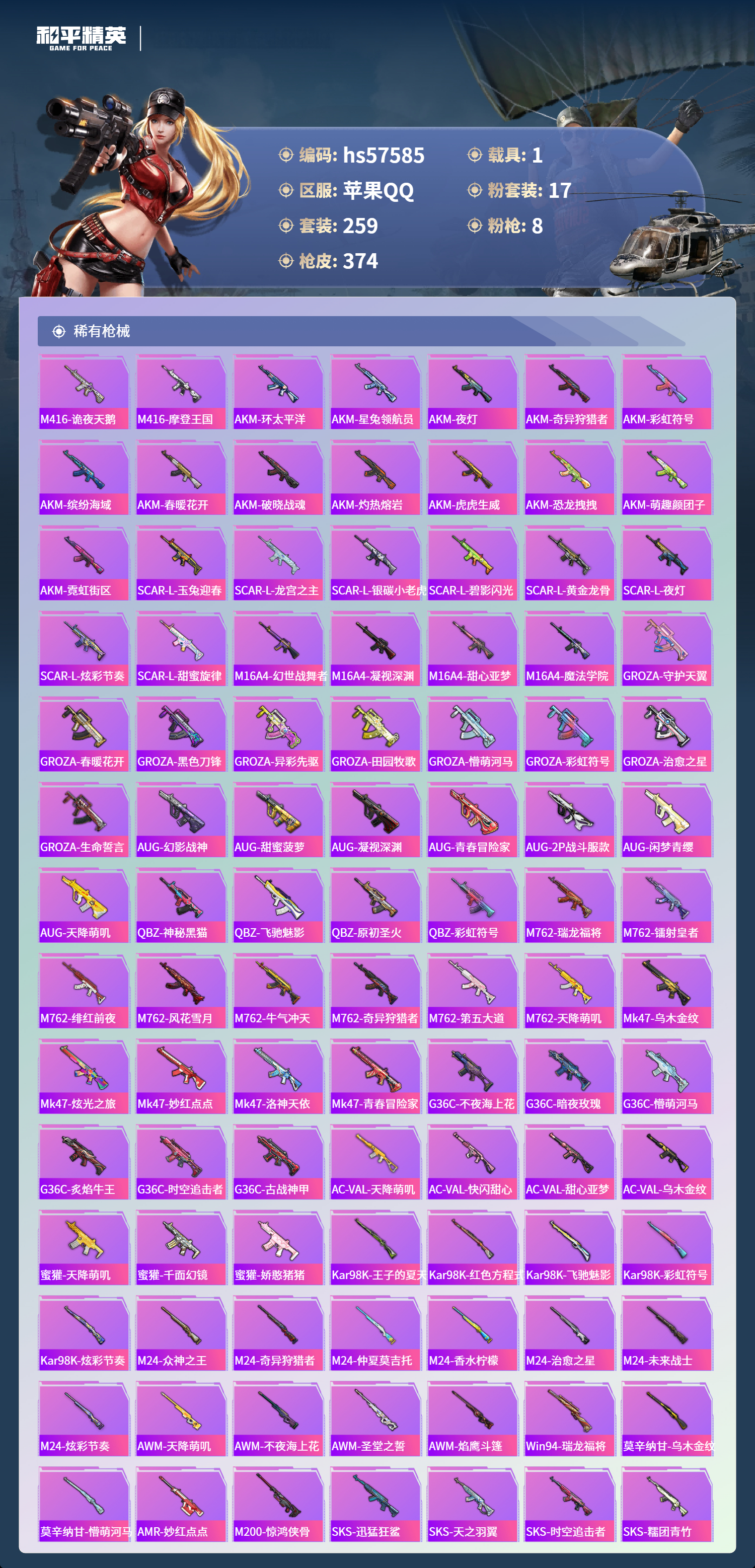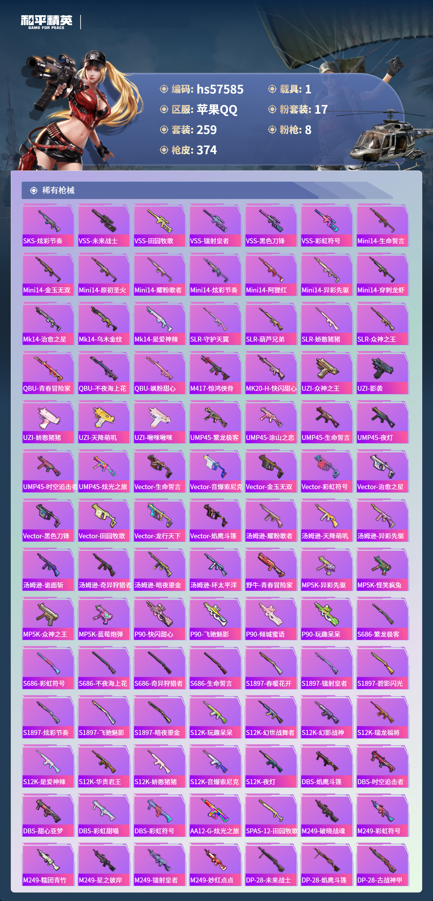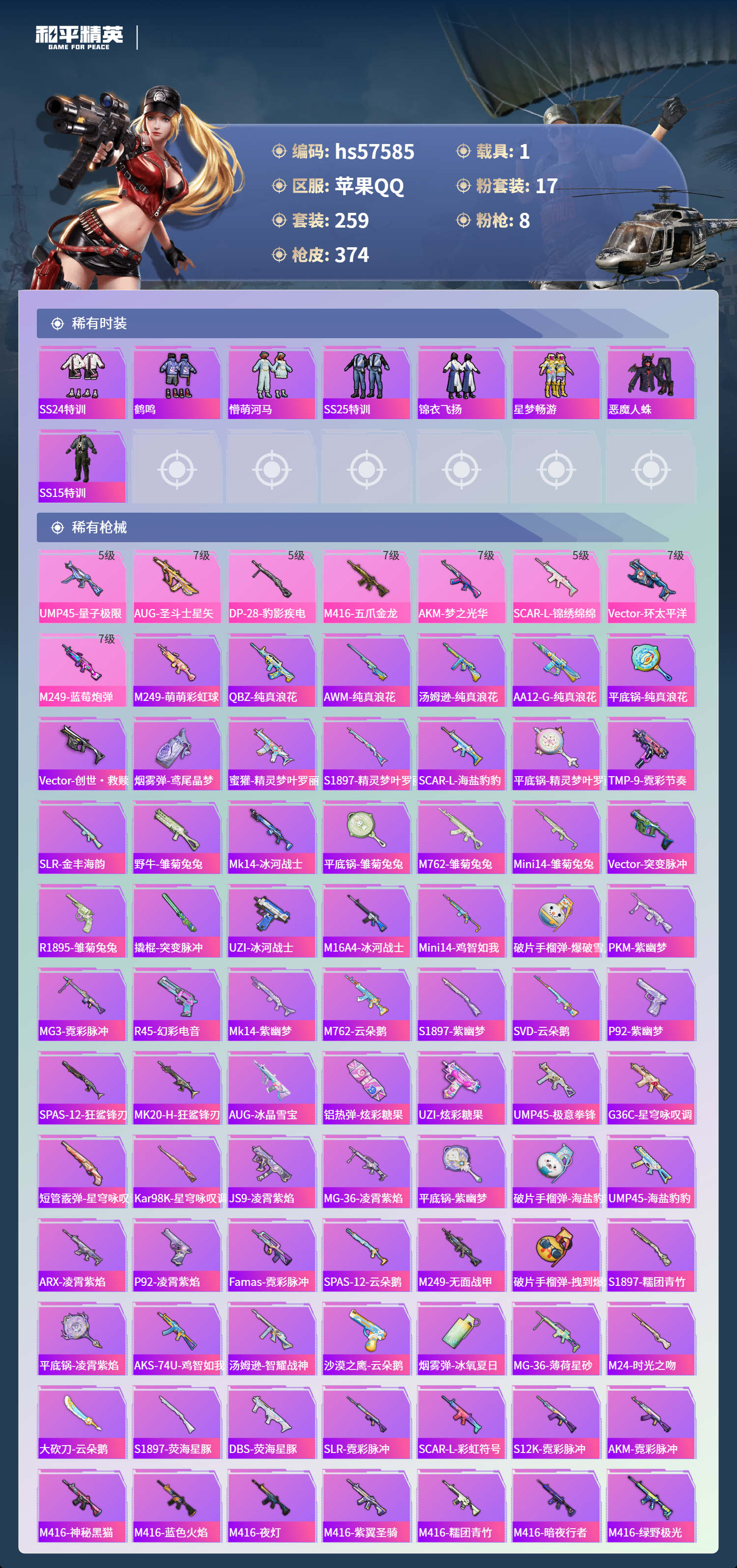 1载具-259套装-374呛皮-hs57585 苹果手q-19王牌印记-17粉装-8特效呛-1载具-热力值-259套装-374呛皮-7卓越印记-3传奇印记【17粉装】角色-初号机款机体服套装-翡翠骑士套装-繁龙极客套装-飓风飞鹰套装-梦幻火箭角色-绯穹魔姬套装-暗夜玫瑰套装-灵感创作师套装-绚金战神套装-暗夜鎏金角色-光极星套装-新星烈龙角色-异瞳寒姬角色-萨利娅套装-莲影清波角色-复