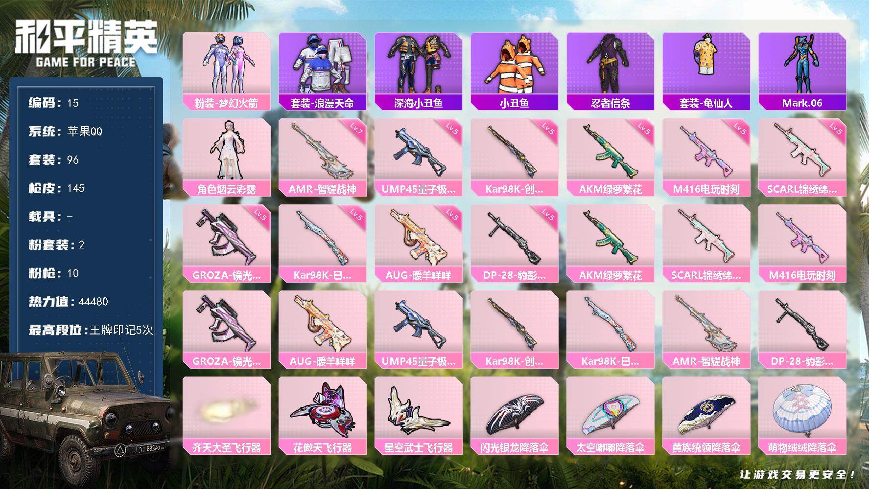 [15667736]【编号87426 可秒换绑】【极品升级呛号!10把升级呛根本用不完!】 苹果 手q-2粉装-10特效呛-0载具-4粉色飞行器-44480热力值-5王牌印记-96套装-145呛皮 【热门品类】:粉装-梦幻火箭,套装-浪漫天命,套装-深海小丑鱼,套装-小丑鱼,套装-忍者信条,套装-龟仙人,角色-mark.06 【粉色套装】:粉装-梦幻火箭,角色-烟云彩露 【粉色呛皮等级】:akm-绿萝繁花五级,scar-l-锦绣绵绵五级,m416-电玩时刻五级,groza-镜光银凌五级,aug-暖羊咩咩五级,ump45-量子极限五级,kar98k-创世·救赎五级,kar98k-巳巳如意五级,amr-智耀战神七级,dp-28-豹影疾电五级 【粉色呛皮】:akm-绿萝繁花,scar-l-锦绣绵绵,m416-电玩时刻,groza-镜光银凌,aug-暖羊咩咩,ump45-量子极限,kar98k-创世·救赎,kar98k-巳巳如意,amr-智耀战神,dp-28-豹影疾电 【粉色飞行器】:齐天大圣飞行器,花傲天飞行器,星空武士飞行器 【粉色降落伞】:闪光银龙降落伞,太空嘟嘟降落伞,黄族统领降落伞,萌物绒绒降落伞,圣堂之誓降落伞,繁龙极客降落伞,喜羊羊与灰太狼降落伞,异瞳寒姬降落伞 【稀有套装】:套装-龟仙人,角色-临安公主,套装-燕燕于飞,套装-鱼渊荷华,角色-海琴烟,套装-朱霞炽焰,套装-凌霄紫焰 【稀有呛皮】:akm-彩虹符号,akm-影袭,akm-缤纷海域,akm-胡桃卫兵,akm-霓虹街区,akm-龙的传人,m16a4-幻世战舞者,scar-l-炫彩节奏,scar-l-玉兔迎春,scar-l-黄金龙骨,m416-糯团青竹,m416-蓝色火焰,groza-2b战斗服款,groza-影袭,groza-懵萌河马,aug-天降萌叽,aug-幻影战神,aug-甜蜜菠萝,q-神秘黑猫,m762-天降萌叽,g36c-六号树人,g36c-懵萌河马,ac-val-天降萌叽,ac-val-快闪甜心,蜜獾-天降萌叽,蜜獾-娇憨猪猪,arx-凌霄紫焰,uzi-啾咪啾咪,uzi-天降萌叽,uzi-娇憨猪猪,ump45-夜灯,ump45-涂山之恋,ump45-生命誓言,vect-焰鹰斗篷,汤姆逊-天降萌叽,汤姆逊-幻影战神,js9-凌霄紫焰,p90-快闪甜心,kar9