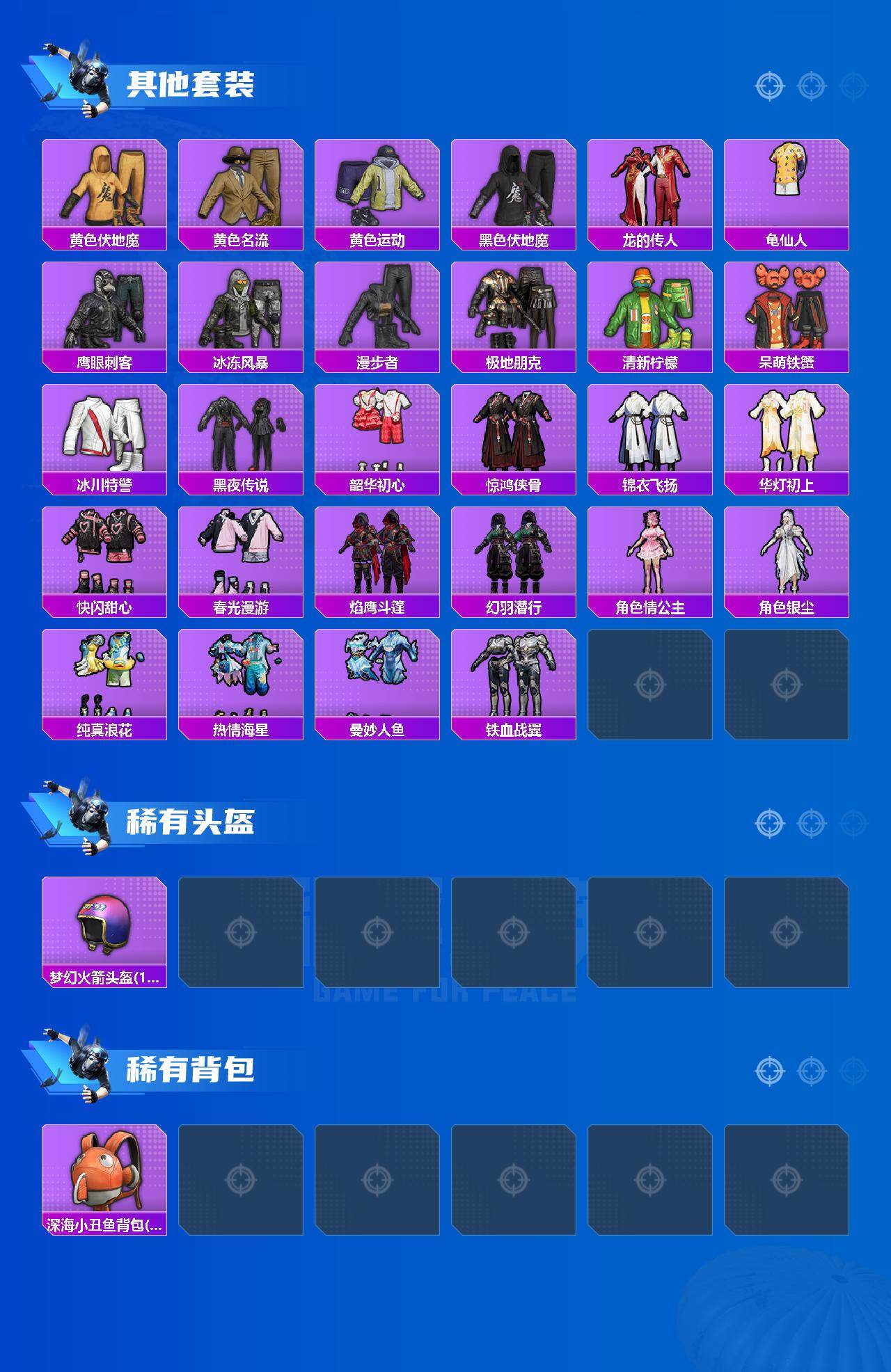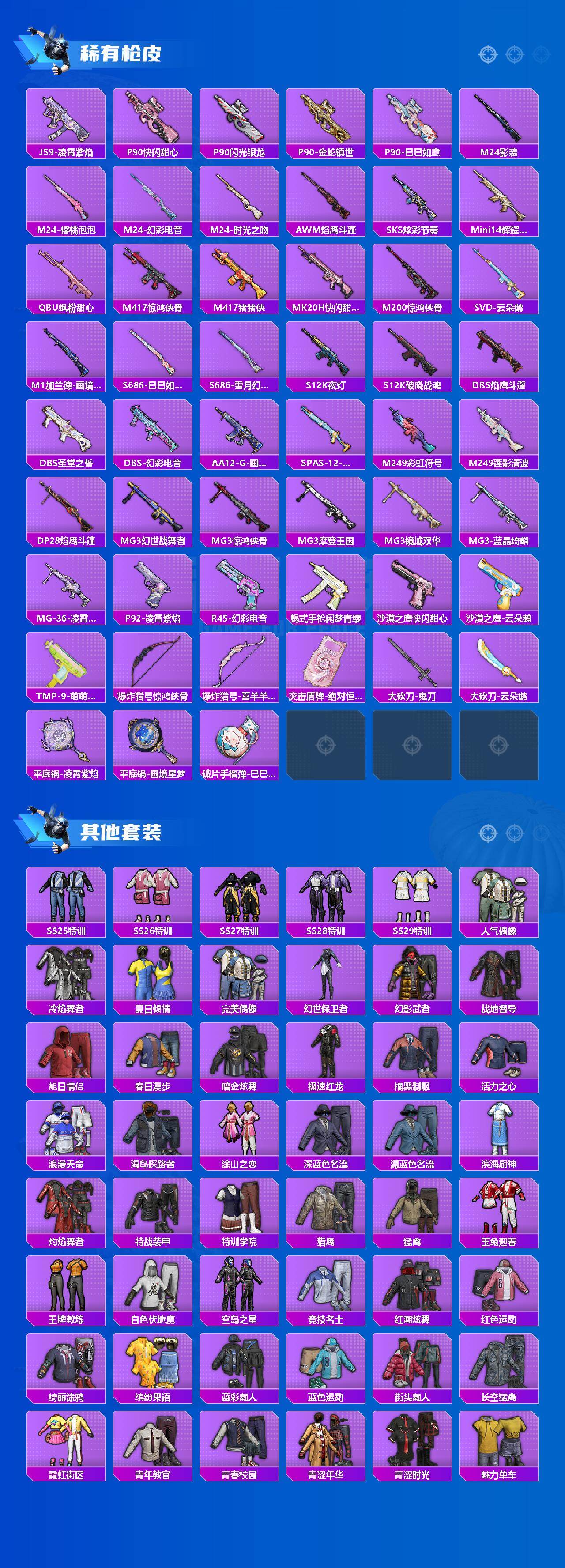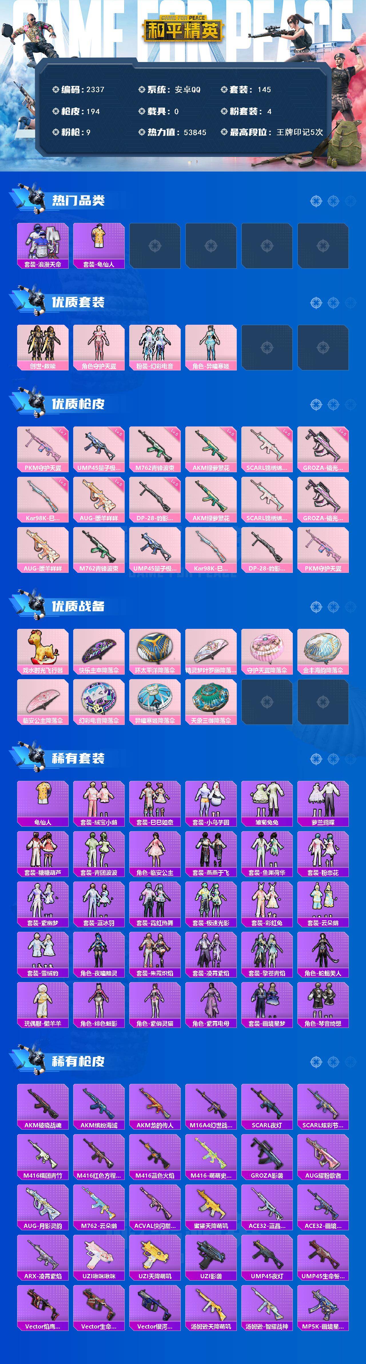 0载具-145套装-194呛皮-145套装/呛械9/装备251/战备135/王牌印记5/热力值53845/五级akm-绿萝繁花/五级scar-l-锦绣绵绵/五级groza-镜光银凌/五级aug-暖羊咩咩/五级m762-青锋波束/五级ump45-量子极限/五级kar98k-巳巳如意/五级dp-28-豹影疾电/七级pkm-守护天翼/套装-浪漫天命/套装-龟仙人/创世·救赎/守护天翼/粉装-幻彩电音/角色-异瞳寒姬/akm-绿萝繁