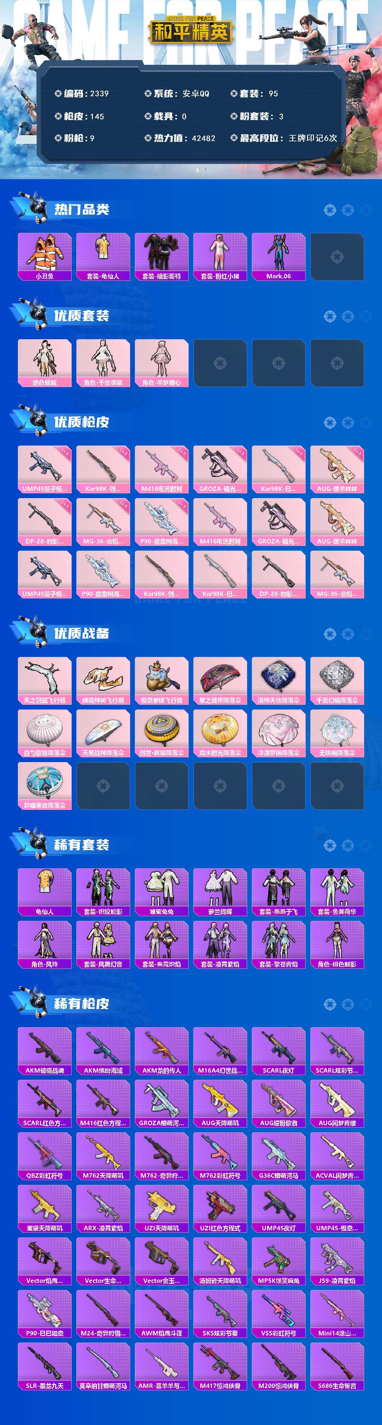 0载具-95套装-145呛皮-95套装/呛械9/装备185/战备103/王牌印记6/热力值42482/五级m416-电玩时刻/五级groza-镜光银凌/五级aug-暖羊咩咩/五级ump45-量子极限/三级p90-魔童闹海 敖丙/五级kar98k-创世·救赎/五级kar98k-巳巳如意/五级dp-28-豹影疾电/五级mg-36-沧焰双生/小丑鱼/套装-龟仙人/套装-暗影哥特/套装-粉红小猪/角色-mark.06/绝色倾城/千