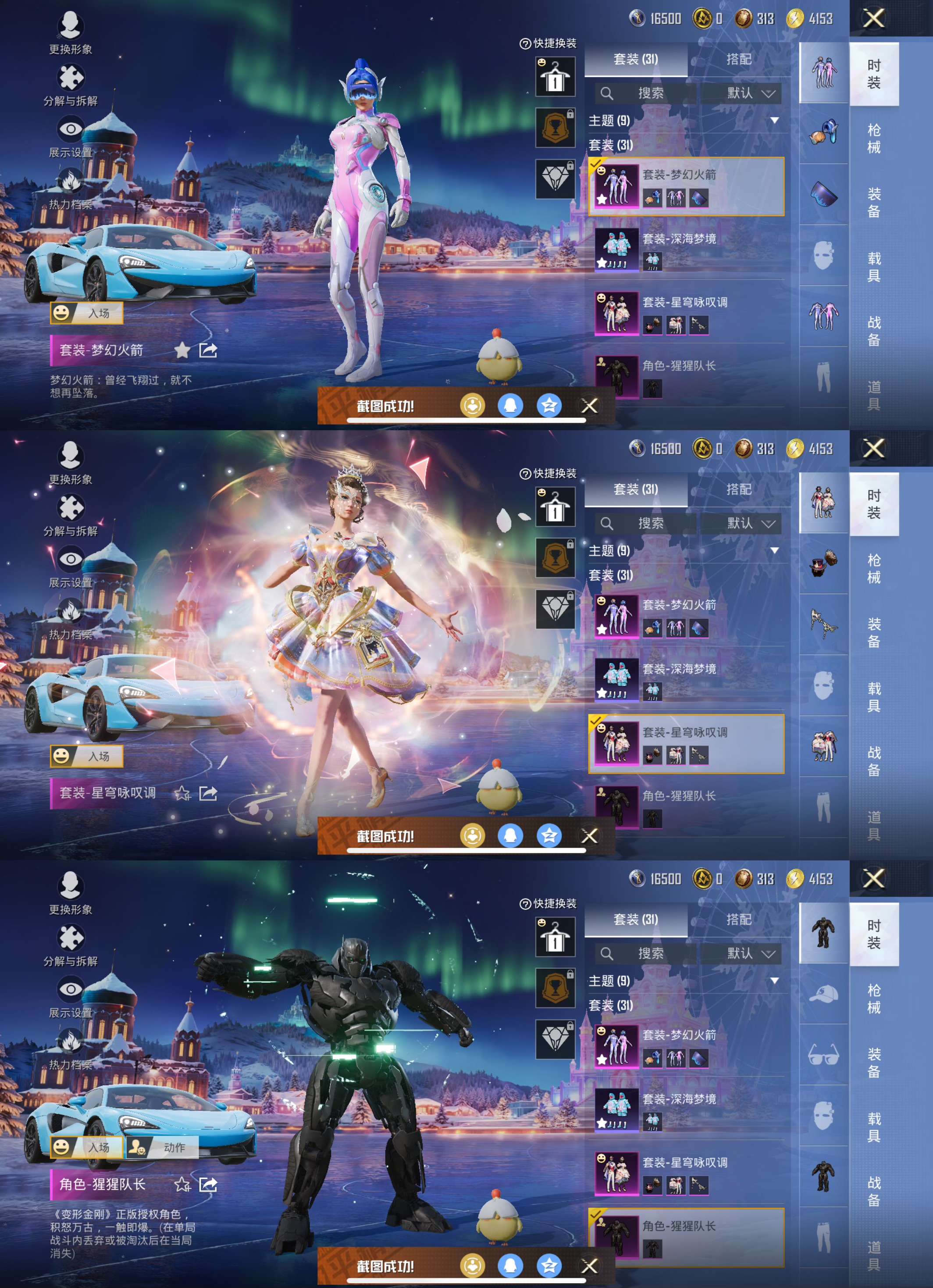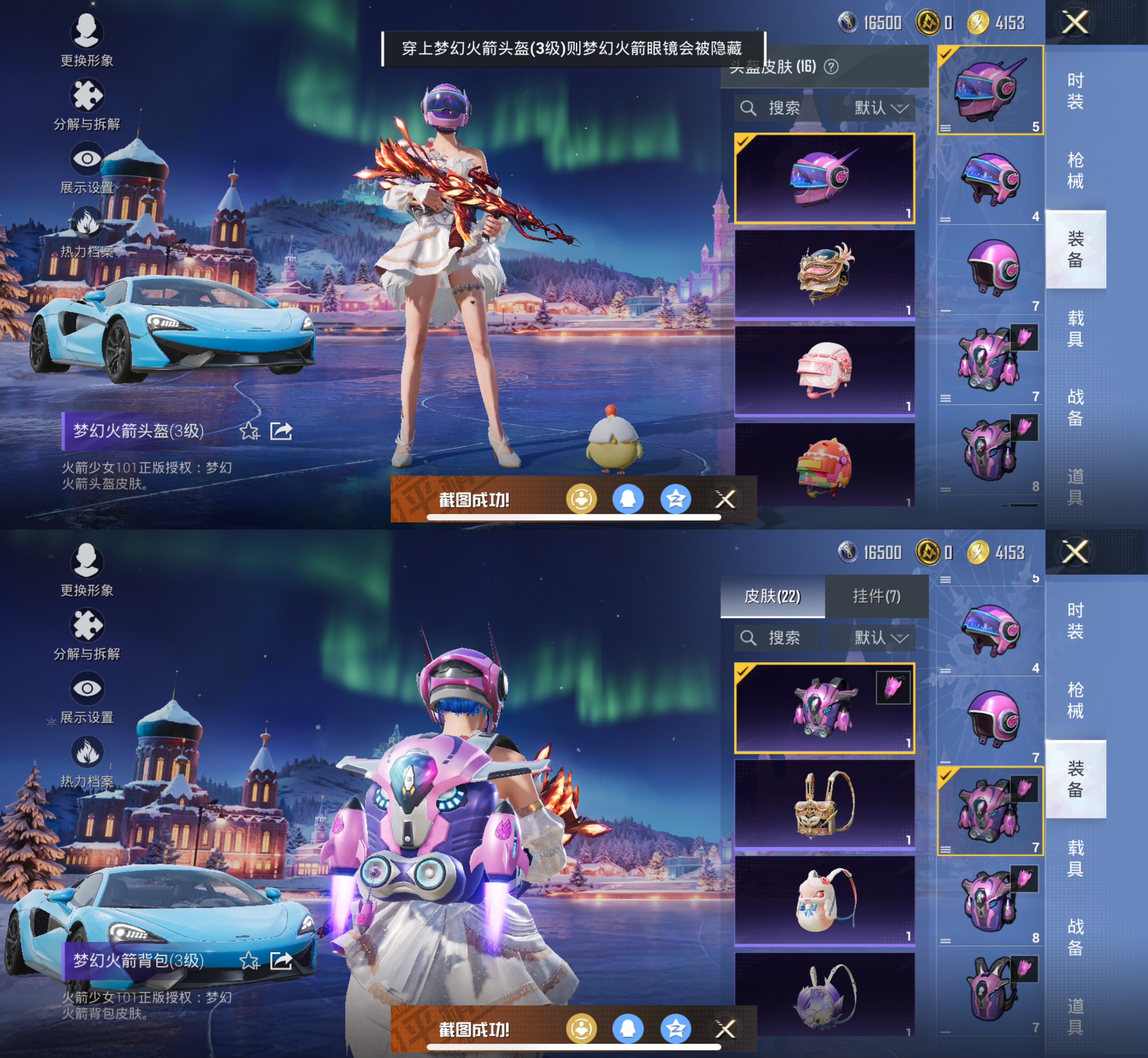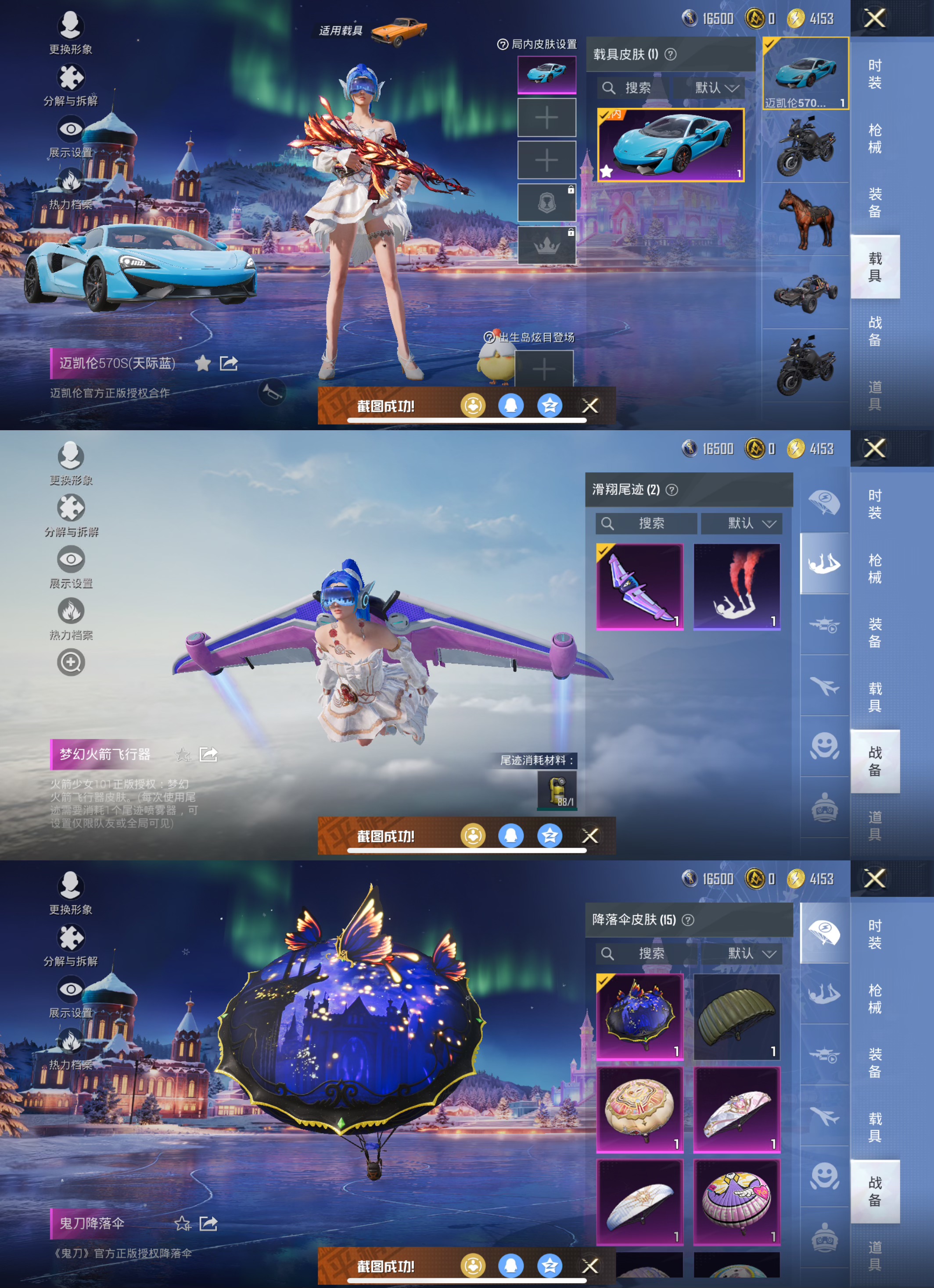 1载具-31套装-54呛皮-【1载具2特效呛3粉装 梦幻火箭 5级风花雪月】苹果q-1王牌印记-3粉装-2特效呛-54呛皮-31套装-1载具 【1载具】 迈凯伦570s天际蓝 【3粉装】 星穹咏叹调 猩猩队长 梦幻火箭 【2特效呛】 kar98k-巳巳如意 m416-风花雪月 【2飞行器】 粉色滑翔尾迹 梦幻火箭飞行器 【4头盔】 星穹咏叹调头盔3级 香桃花海头盔3级 炫光之旅头盔3级