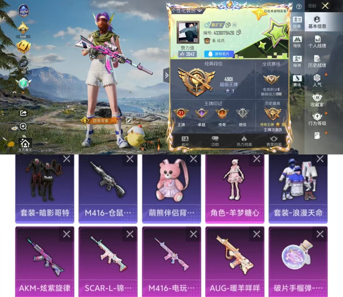 _2393781-实名:可修改时装数:799呛械数:261战备数:176热门装扮:鹰眼刺客好奇恐龙羊梦糖心稀有呛皮:akm炫紫旋律scar-l-锦绣绵绵m416电玩时刻groza-镜光银凌kar98k-巳巳如意aug-暖羊咩咩破片手留单-瓶中星球mk14-甜梦熊击dp-28-豹影疾电mg-36-沧焰双生