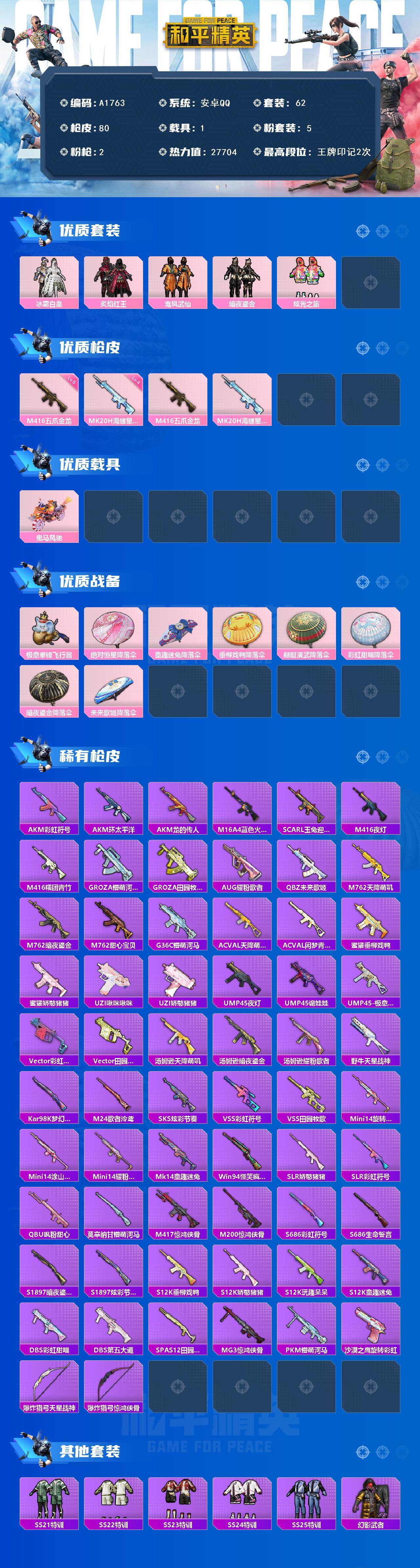 [15366081]安卓【小号 粉装-冰霜白皇/m416-五爪金龙五级/鬼马风驰/5粉装-2特效呛-1载具-1粉色飞行器】 手q27704热力值-2王牌印记-62套装-80呛皮 【热门品类】:套装-龟仙人 【粉色套装】:粉装-冰霜白皇,粉装-炙焰红王,粉装-鸾凤武仙,粉装-暗夜鎏金,粉装-炫光之旅 【粉色呛皮等级】:m416-五爪金龙五级,mk20-h-海螺星光四级 【粉色载具】:鬼马风驰 【粉色呛皮】:m416-五爪金龙,mk20-h-海螺星光 【粉色飞行器】:极意拳锋飞行器 【粉色降落伞】:绝对恒星降落伞,童趣迷兔降落伞,垂柳戏鸭降落伞,翩跹演武降落伞,彩虹甜喵降落伞,暗夜鎏金降落伞,未来歌姬降落伞 【稀有套装】:套装-龟仙人,套装-雪国风尚 【稀有呛皮】:akm-彩虹符号,akm-环太平洋,akm-龙的传人,m16a4-蓝色火焰,scar-l-玉兔迎春,m416-夜灯,m416-糯团青竹,groza-懵萌河马,groza-田园牧歌,aug-耀粉歌者,q-未来歌姬,m762-天降萌叽,m762-暗夜鎏金,m762-甜心宝贝,g36c-懵萌河马,ac-val-天降萌叽,ac-val-闲梦青缨,蜜獾-垂柳戏鸭,蜜獾-娇憨猪猪,uzi-啾咪啾咪,uzi-娇憨猪猪,ump45-夜灯,ump45-诡娃娃,ump45-极意拳锋,vect-彩虹符号,vect-田园牧歌,汤姆逊-天降萌叽,汤姆逊-暗夜鎏金,汤姆逊-耀粉歌者,野牛-天星战神,kar98k-梦幻火箭,m24-歌者泠鸢,sks-炫彩节奏,vss-彩虹符号,vss-田园牧歌,mini14-旋转彩虹,mini14-涂山之恋,mini14-耀粉歌者,mk14-童趣迷兔,win94-怪笑疯兔,slr-娇憨猪猪,slr-彩虹符号,qbu-飒粉甜心,莫辛纳甘-懵萌河马,m417-惊鸿侠骨,m200-惊鸿侠骨,s686-彩虹符号,s686-生命誓言,s1897-暗夜鎏金,s1897-炫彩节奏,s12k-玩趣呆呆,s12k-童趣迷兔,s12k-垂柳戏鸭,s12k-娇憨猪猪,dbs-彩虹甜喵,dbs-第五大道,spas-12-田园牧歌,mg3-惊鸿侠骨,pkm-懵萌河马,沙墨之鹦-旋转彩虹,爆炸猎弓-天星战神,爆炸猎弓-惊鸿侠骨 【其他套装】:套装-ss21特训,套装-ss22特训,套装-ss23特训,套装-ss24特训,