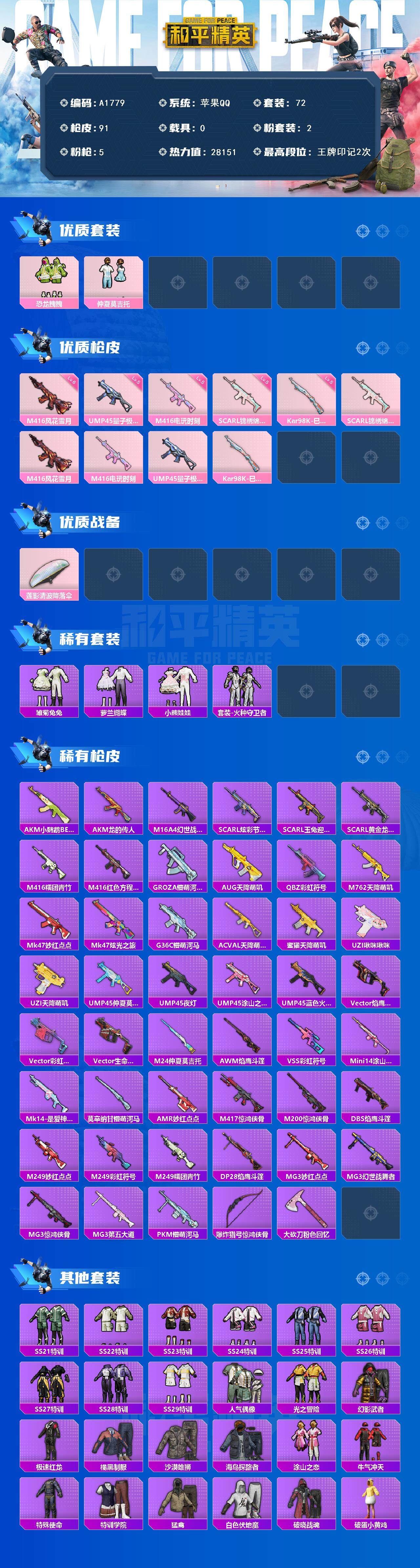 [15365577]苹果【小号 粉螳螂m416-风花雪月六级//2粉装-5特效呛】 手q28151热力值-2王牌印记-72套装-91呛皮 【热门品类】:套装-龟仙人,角色-8号机 【粉色套装】:粉装-恐龙拽拽,粉装-仲夏莫吉托 【粉色呛皮等级】:scar-l-锦绣绵绵五级,m416-风花雪月六级,m416-电玩时刻五级,ump45-量子极限五级,kar98k-巳巳如意五级 【粉色呛皮】:scar-l-锦绣绵绵,m416-风花雪月,m416-电玩时刻,ump45-量子极限,kar98k-巳巳如意 【粉色降落伞】:莲影清波降落伞 【稀有套装】:套装-龟仙人,套装-雏菊兔兔,套装-萝兰蝴蝶,套装-小熊娃娃,套装-火种守卫者 【稀有呛皮】:akm-小鹦鹉bebe,akm-龙的传人,m16a4-幻世战舞者,scar-l-炫彩节奏,scar-l-玉兔迎春,scar-l-黄金龙骨,m416-糯团青竹,m416-红色方程式,groza-懵萌河马,aug-天降萌叽,q-彩虹符号,m762-天降萌叽,mk47-妙红点点,mk47-炫光之旅,g36c-懵萌河马,ac-val-天降萌叽,蜜獾-天降萌叽,uzi-啾咪啾咪,uzi-天降萌叽,ump45-仲夏莫吉托,ump45-夜灯,ump45-涂山之恋,ump45-蓝色火焰,vect-焰鹰斗篷,vect-彩虹符号,vect-生命誓言,m24-仲夏莫吉托,awm-焰鹰斗篷,vss-彩虹符号,mini14-涂山之恋,mk14-是爱神辣,莫辛纳甘-懵萌河马,amr-妙红点点,m417-惊鸿侠骨,m200-惊鸿侠骨,dbs-焰鹰斗篷,m249-妙红点点,m249-彩虹符号,m249-糯团青竹,dp-28-焰鹰斗篷,mg3-妙红点点,mg3-幻世战舞者,mg3-惊鸿侠骨,mg3-第五大道,pkm-懵萌河马,爆炸猎弓-惊鸿侠骨,大砍刀-粉色回忆 【其他套装】:套装-ss21特训,套装-ss22特训,套装-ss23特训,套装-ss24特训,套装-ss25特训,套装-ss26特训,套装-ss27特训,套装-ss28特训,套装-ss29特训,套装-人气偶像,套装-光之冒险,套装-幻影武者,套装-极速红龙,套装-橘黑制服,套装-沙漠雄狮,套装-海岛探路者,套装-涂山之恋,套装-牛气冲天,套装-特殊使命,套装-特训学院,套装-猛禽,套装-