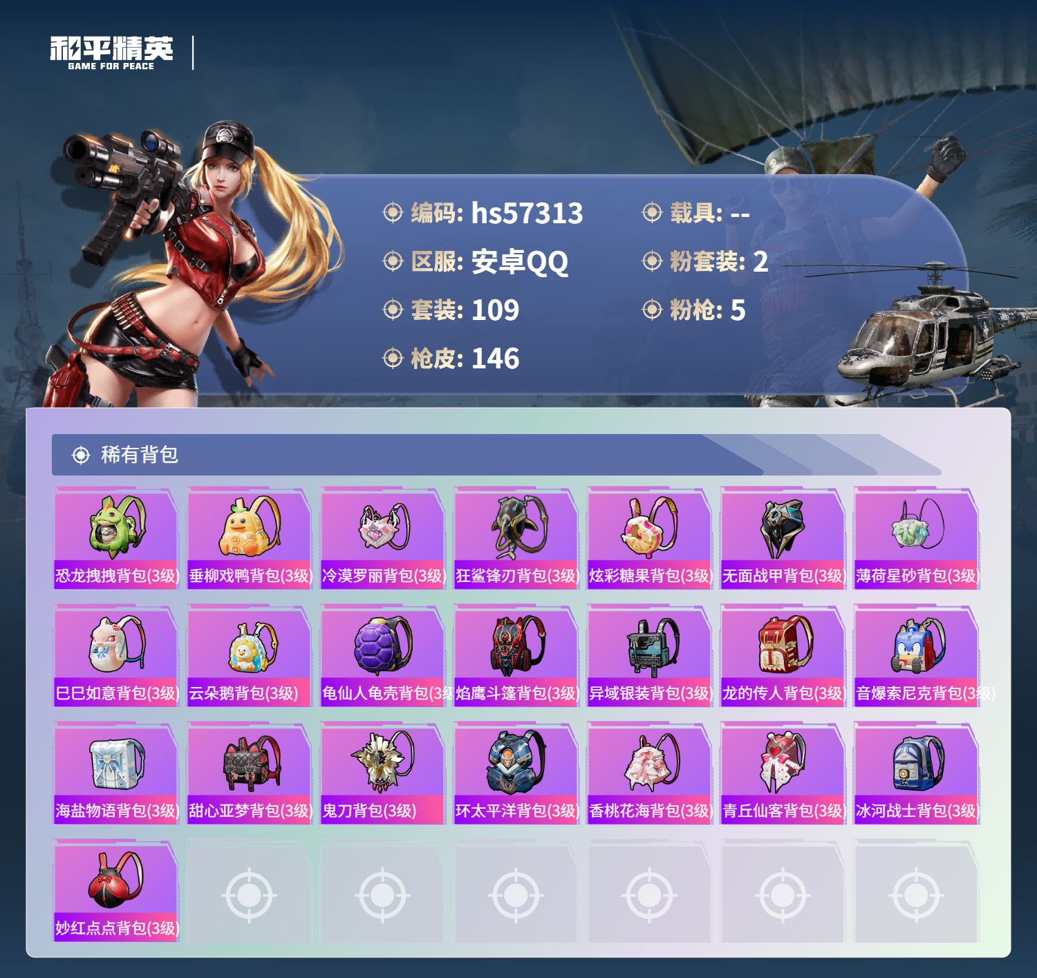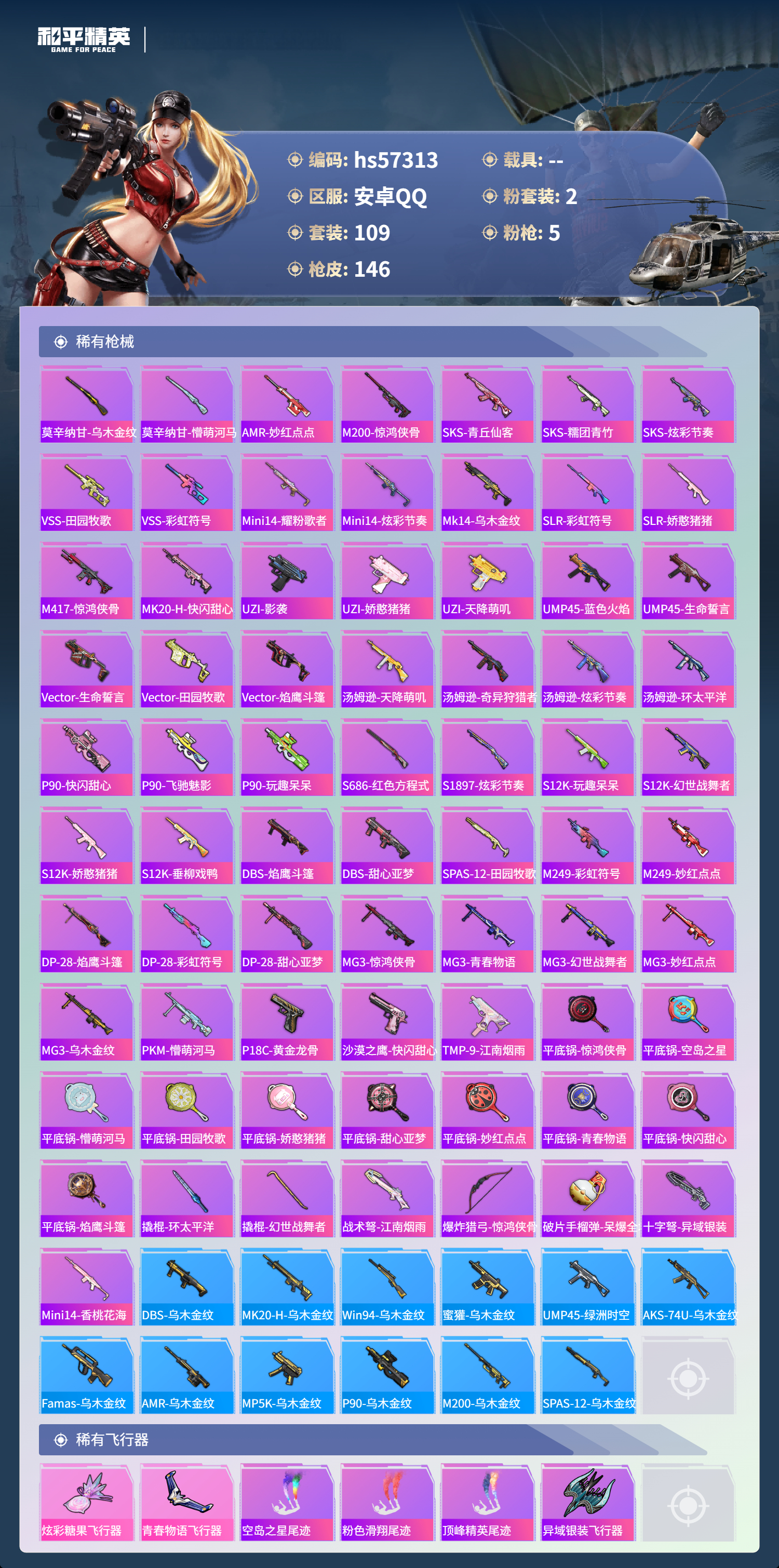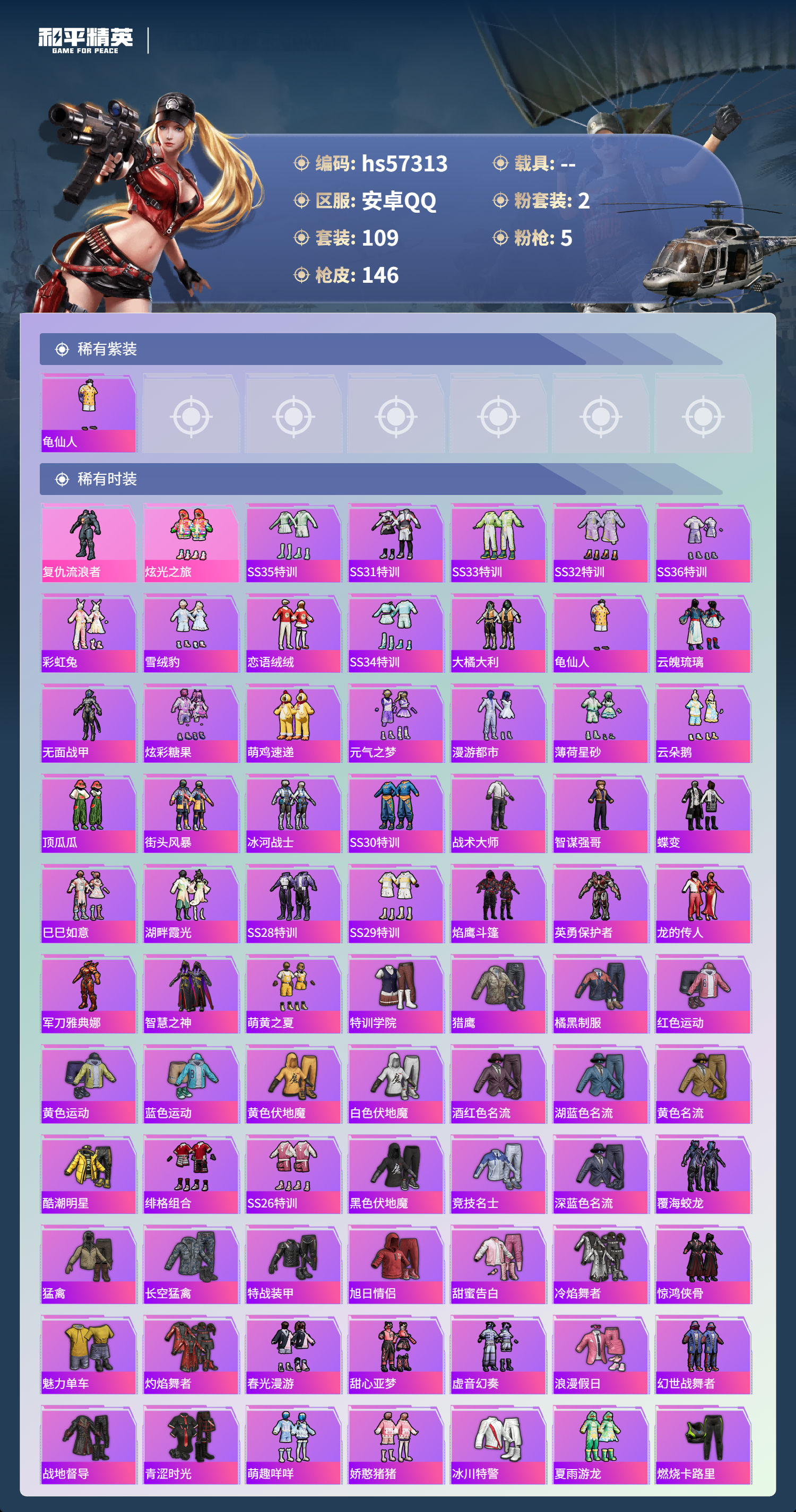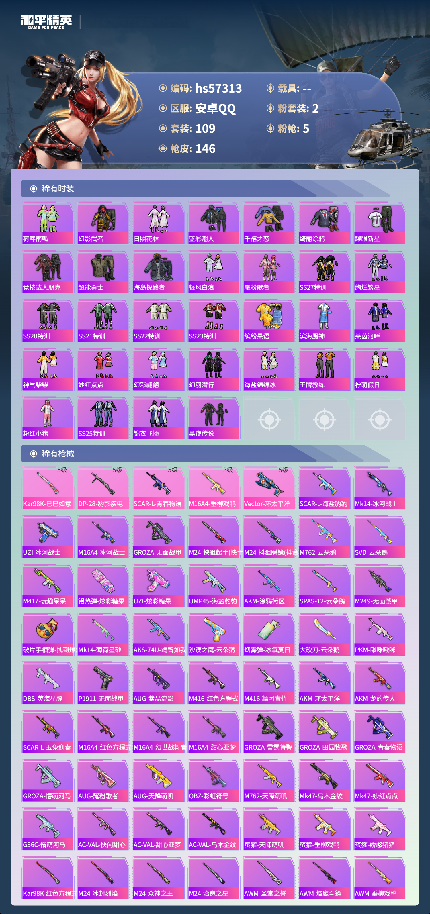 hs57313 安卓手q-1王牌印记-2粉装-5特效呛-43211热力值-109套装-146呛皮-1卓越印记-1传奇印记【2粉装】套装-炫光之旅角色-复仇流浪者【5特效呛】vect-环太平洋/5级kar98k-巳巳如意/5级scar-l-青春物语/5级dp-28-豹影疾电/5级m16a4-垂柳戏鸭/3级【1稀有紫装】龟仙人【109稀有时装】ss35特训ss31特训ss33
