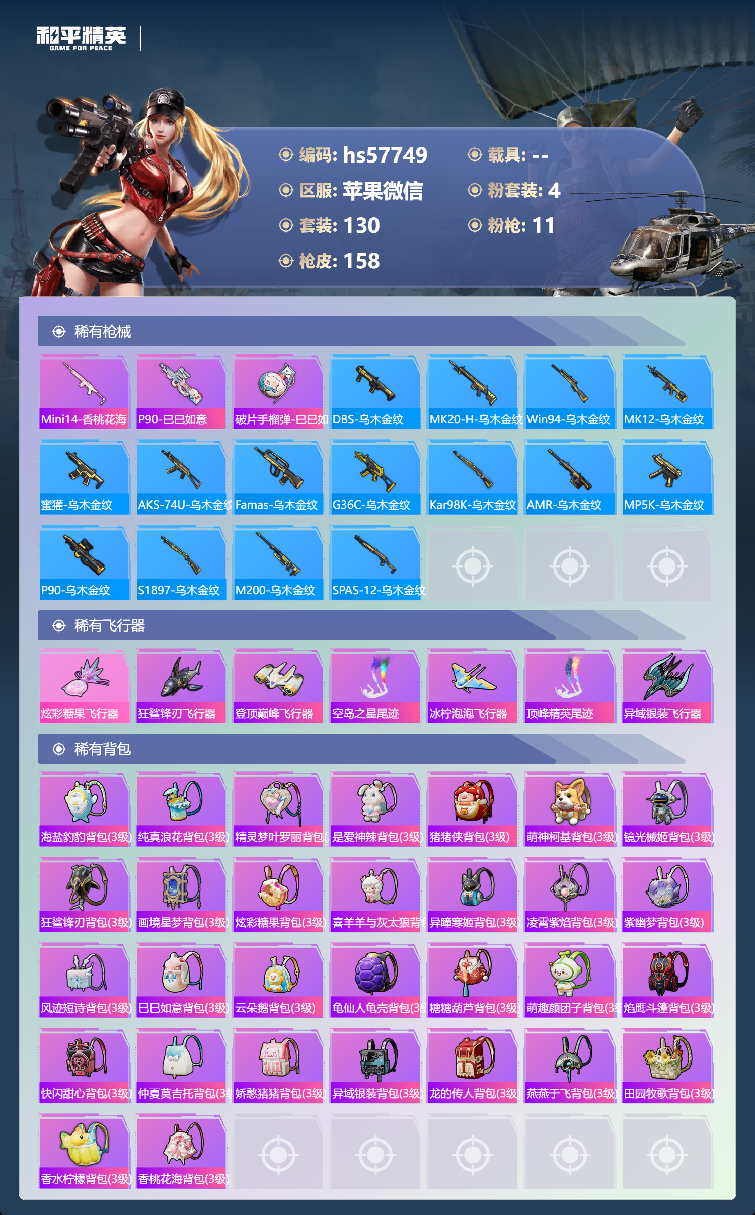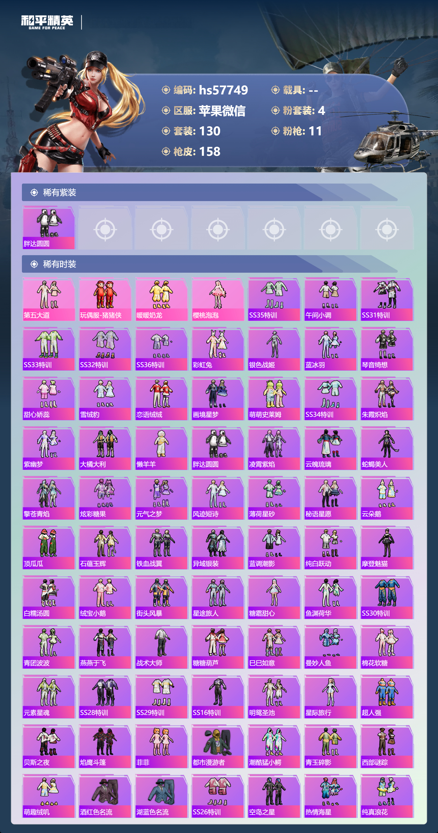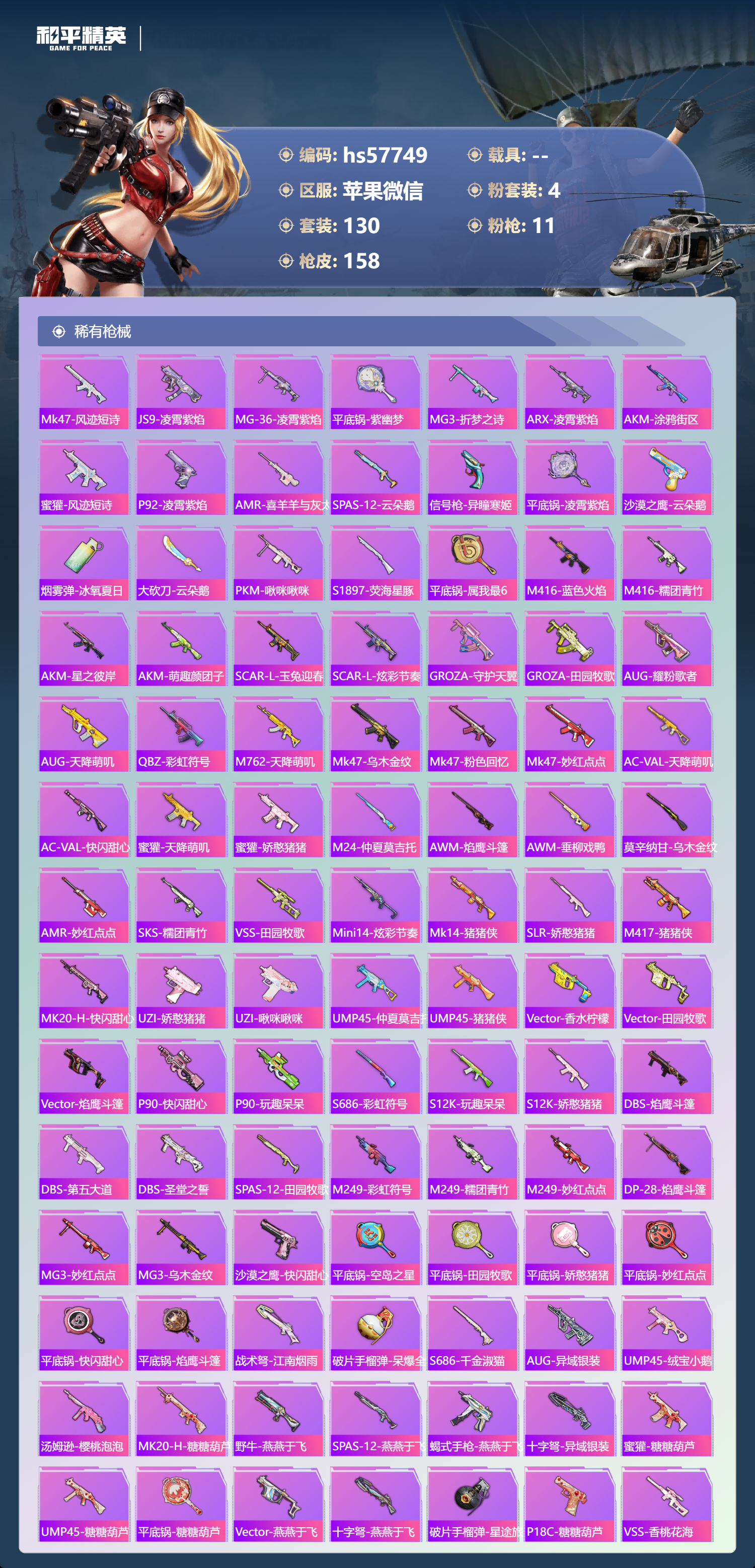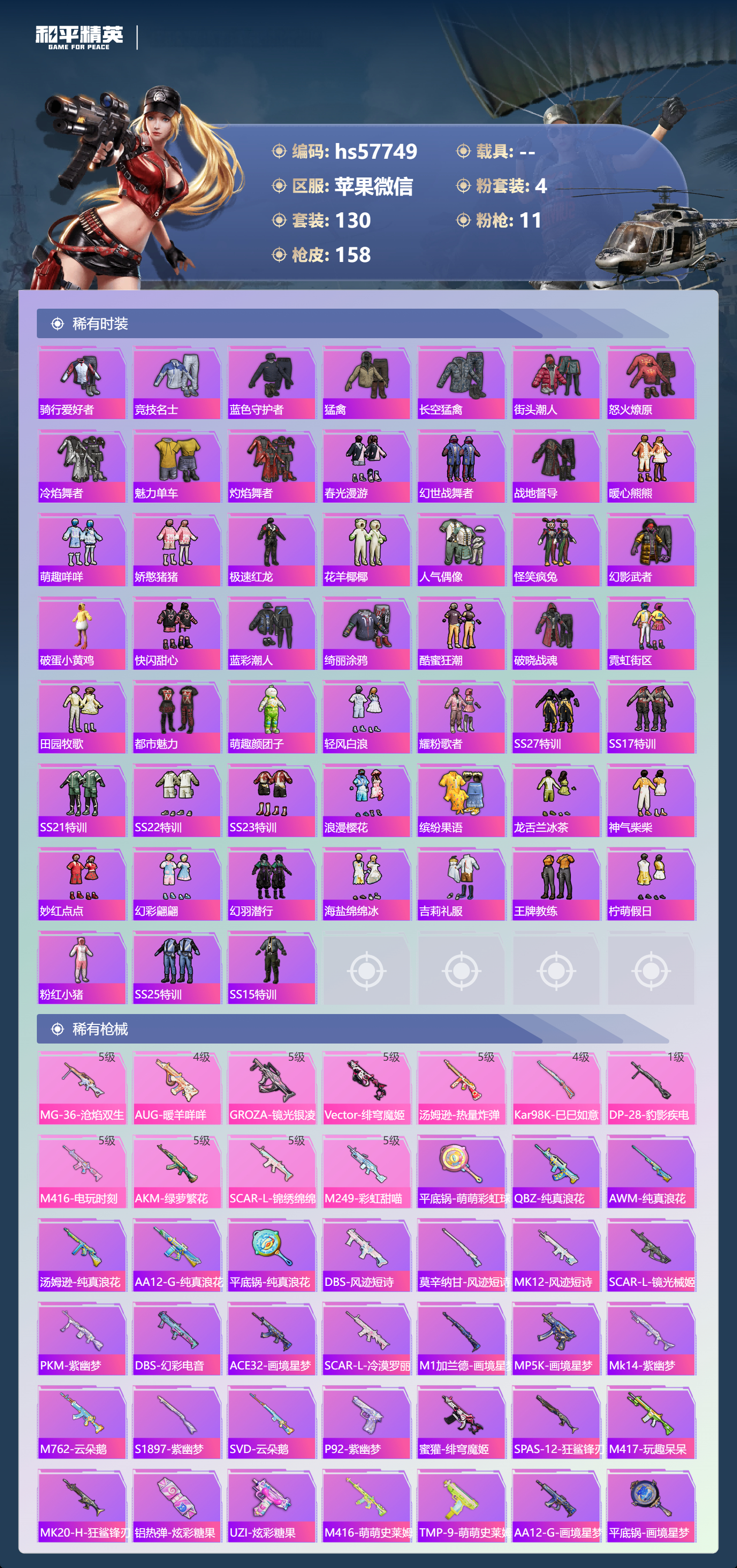 hs57749 苹果微信-14王牌印记-4粉装-11特效呛-54863热力值-130套装-158呛皮【4粉装】套装-第五大道玩偶服-猪猪侠角色-樱桃泡泡套装-暖暖奶龙【11特效呛】vect-绯穹魔姬/5级aug-暖羊咩咩/4级scar-l-锦绣绵绵/5级汤姆逊-热量炸弹/5级kar98k-巳巳如意/4级m249-彩虹甜喵/5级mg-36-沧焰双生/5级akm-绿萝繁花/