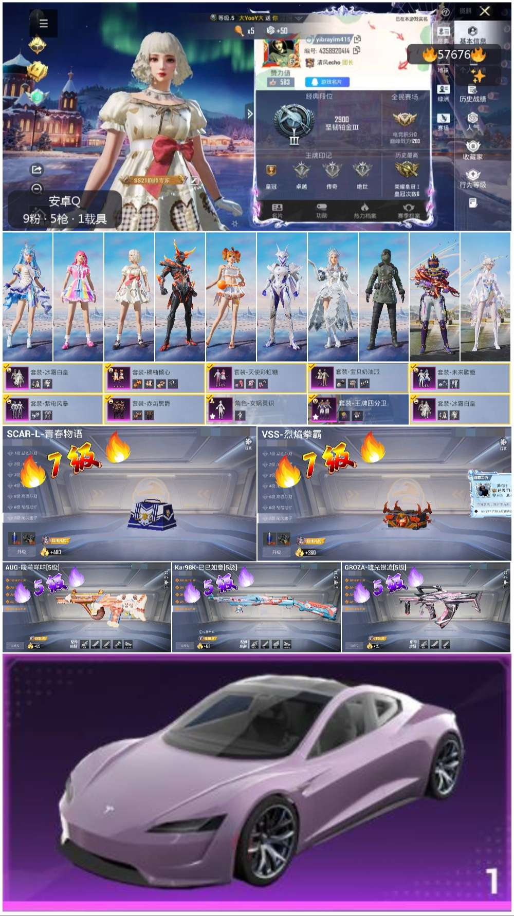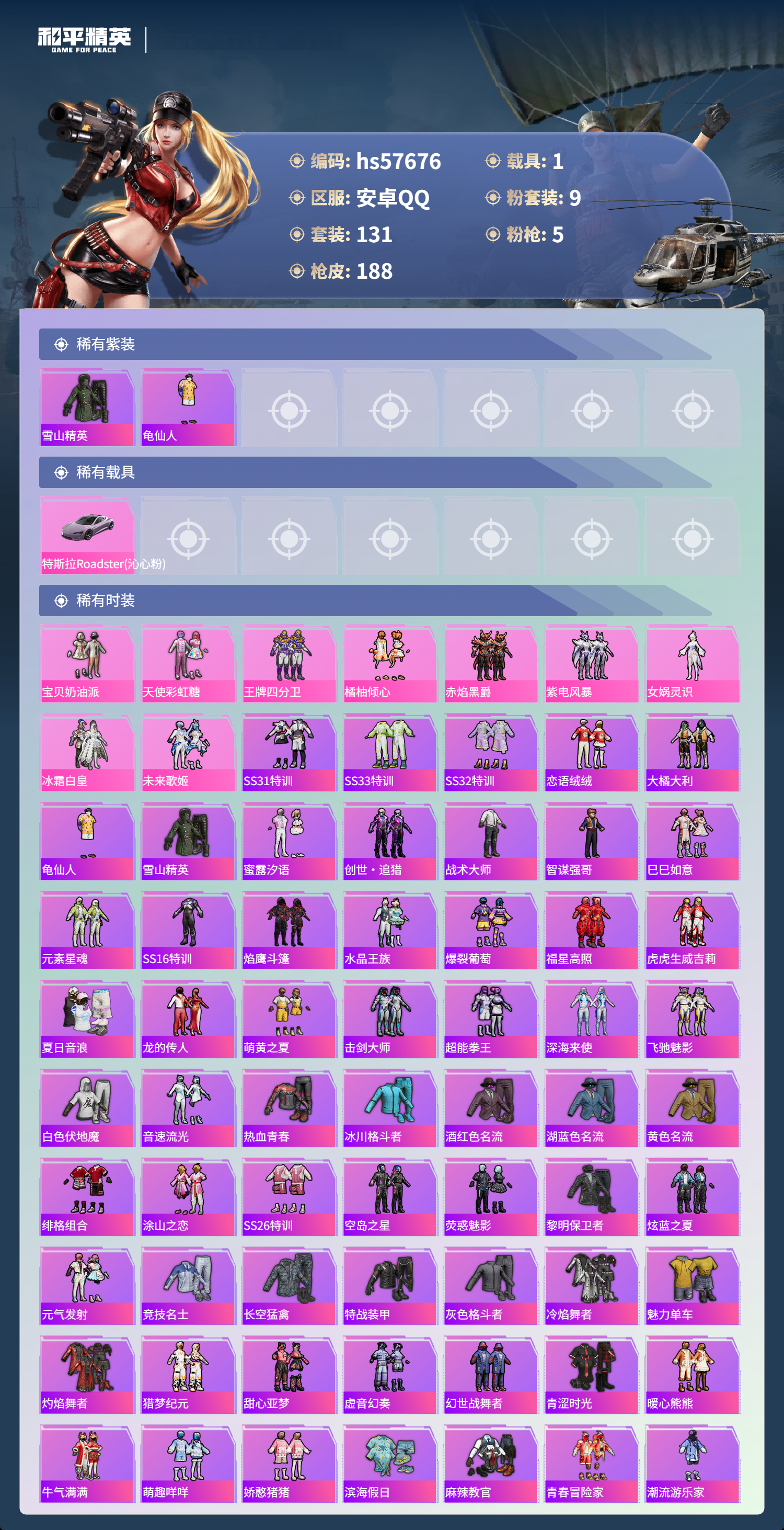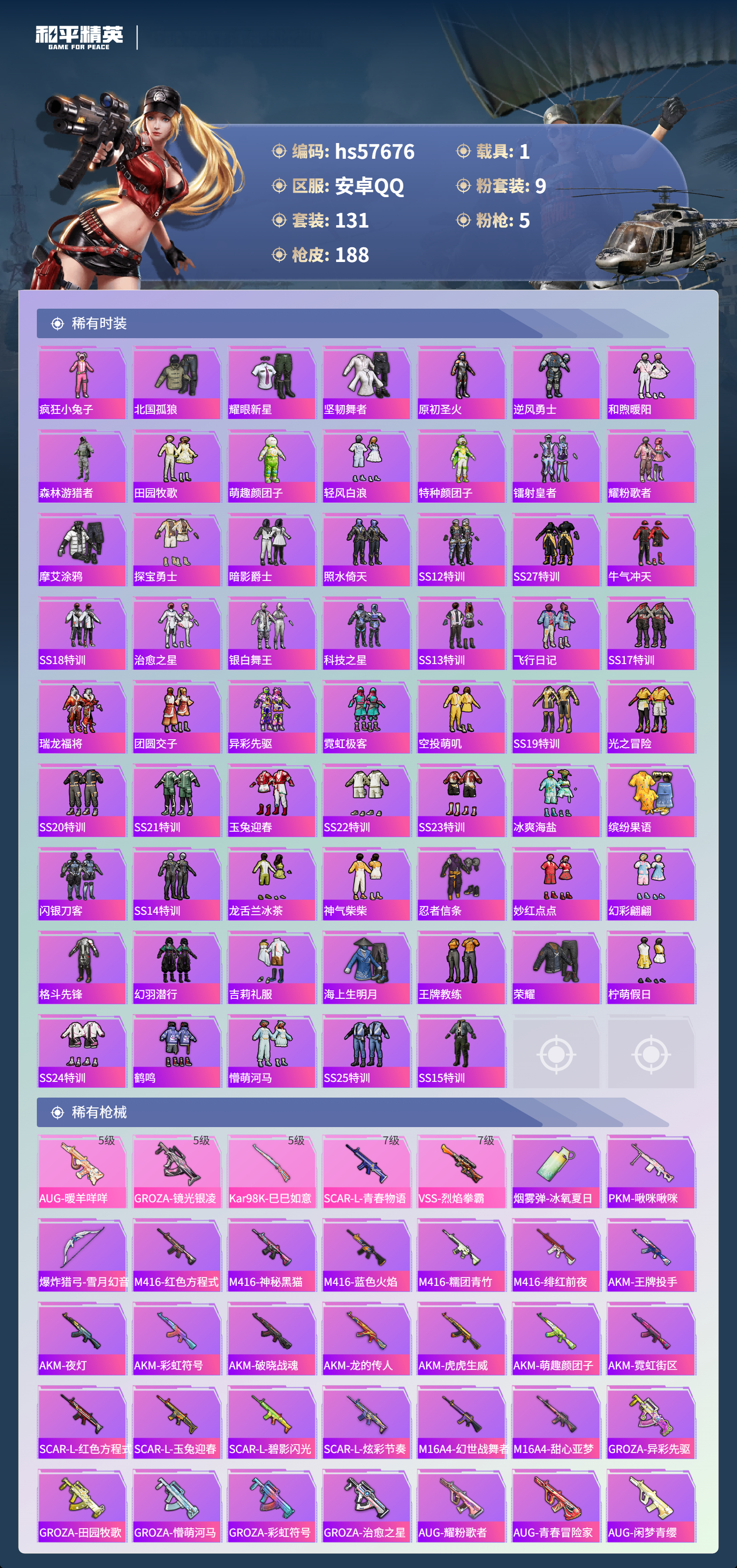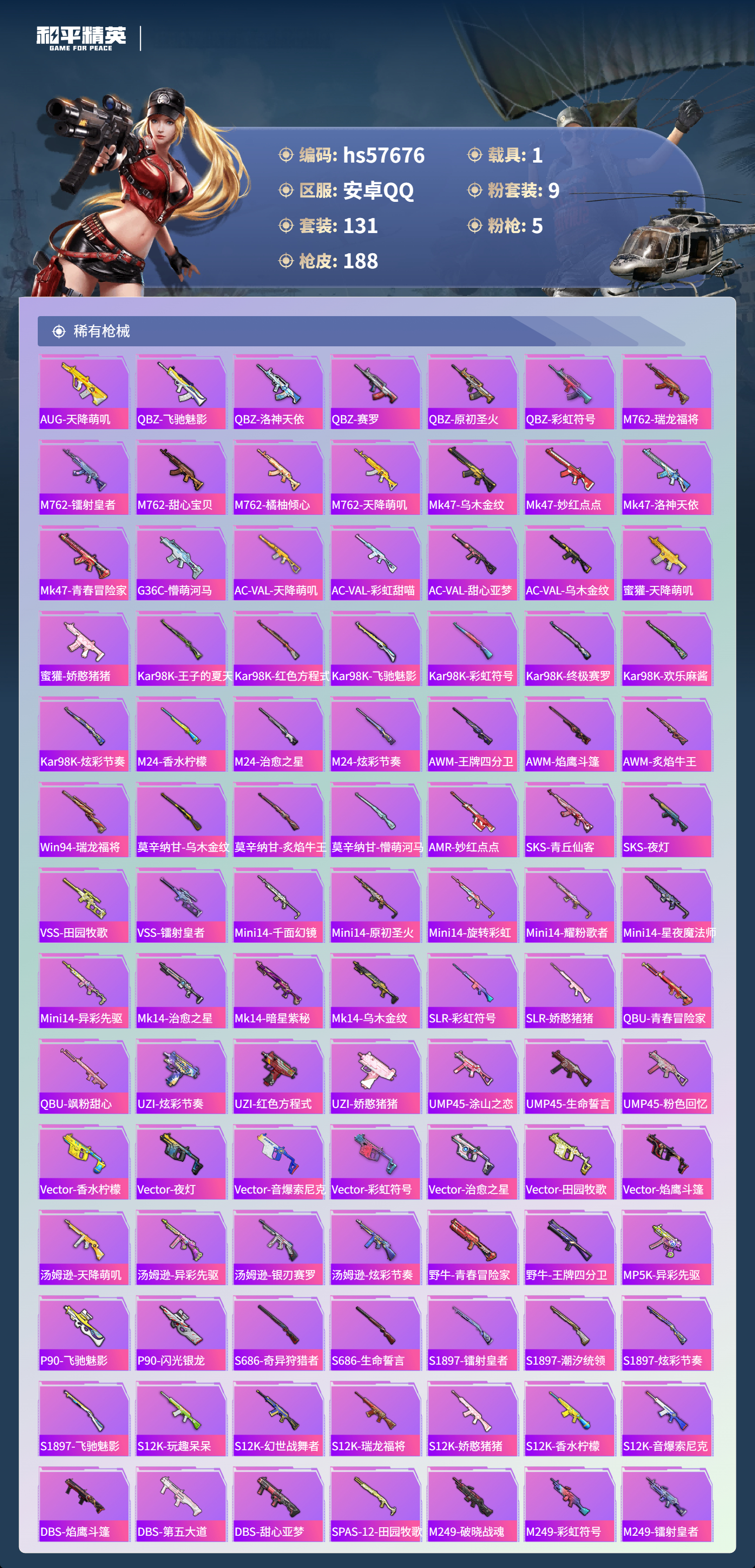1载具-131套装-188呛皮-hs57676 安卓手q-0王牌印记-9粉装-5特效呛-1载具-62571热力值-131套装-188呛皮【9粉装】套装-紫电风暴套装-赤焰黑爵套装-天使彩虹糖套装-橘柚倾心套装-未来歌姬套装-冰霜白皇套装-王牌四分卫角色-女娲灵识套装-宝贝奶油派【5特效呛】scar-l-青春物语/7级aug-暖羊咩咩/5级vss-烈焰拳霸/7级kar98k-巳巳如意/5级groza-
