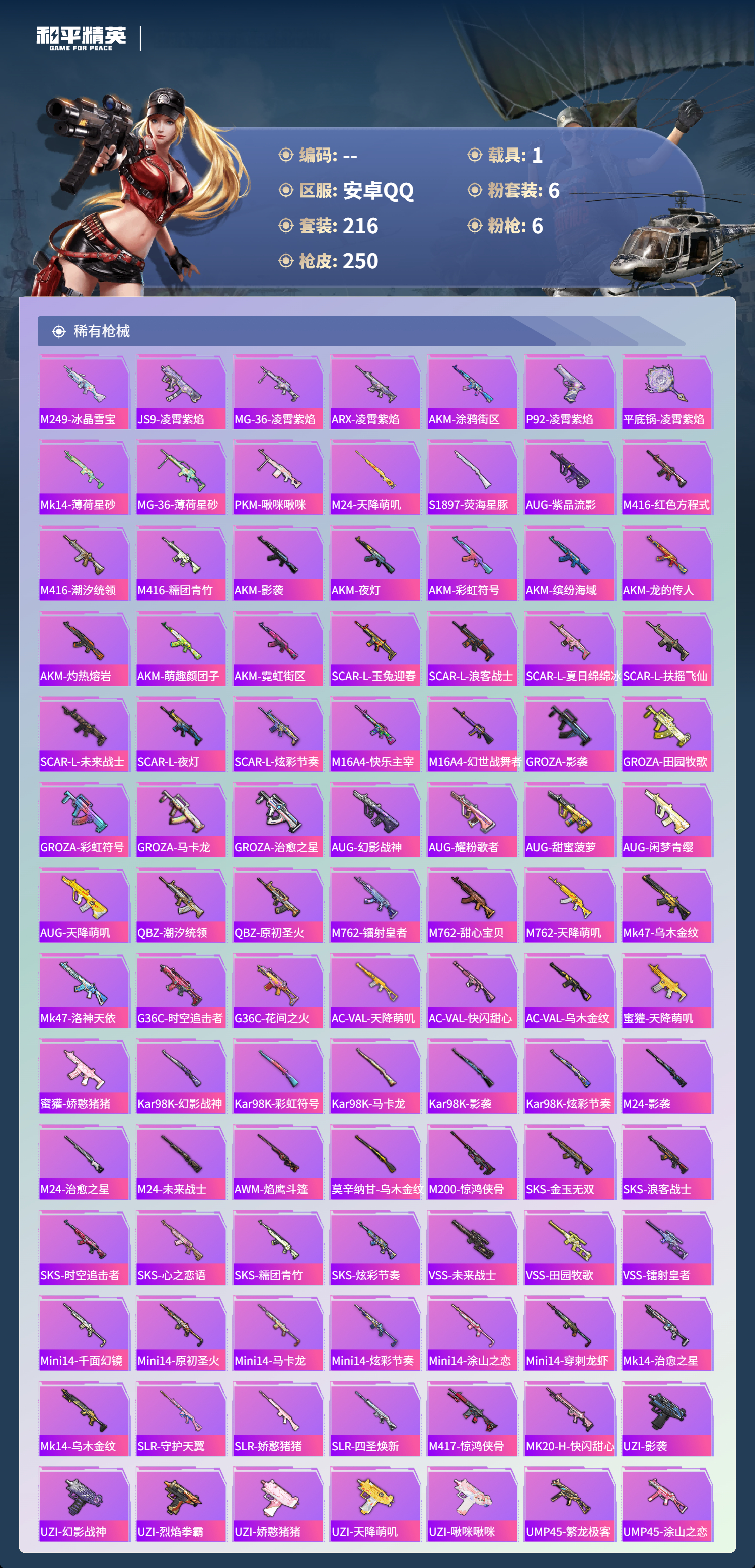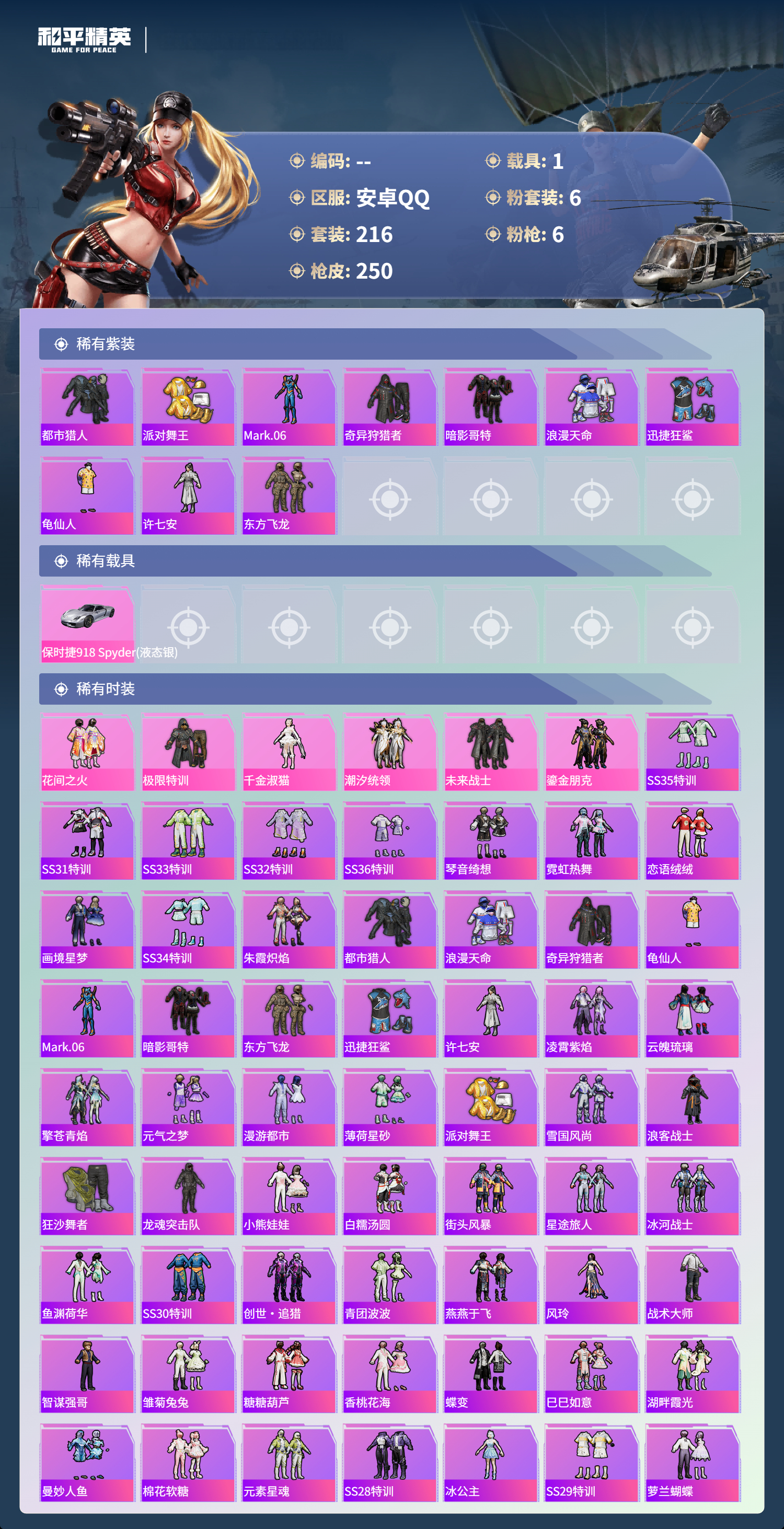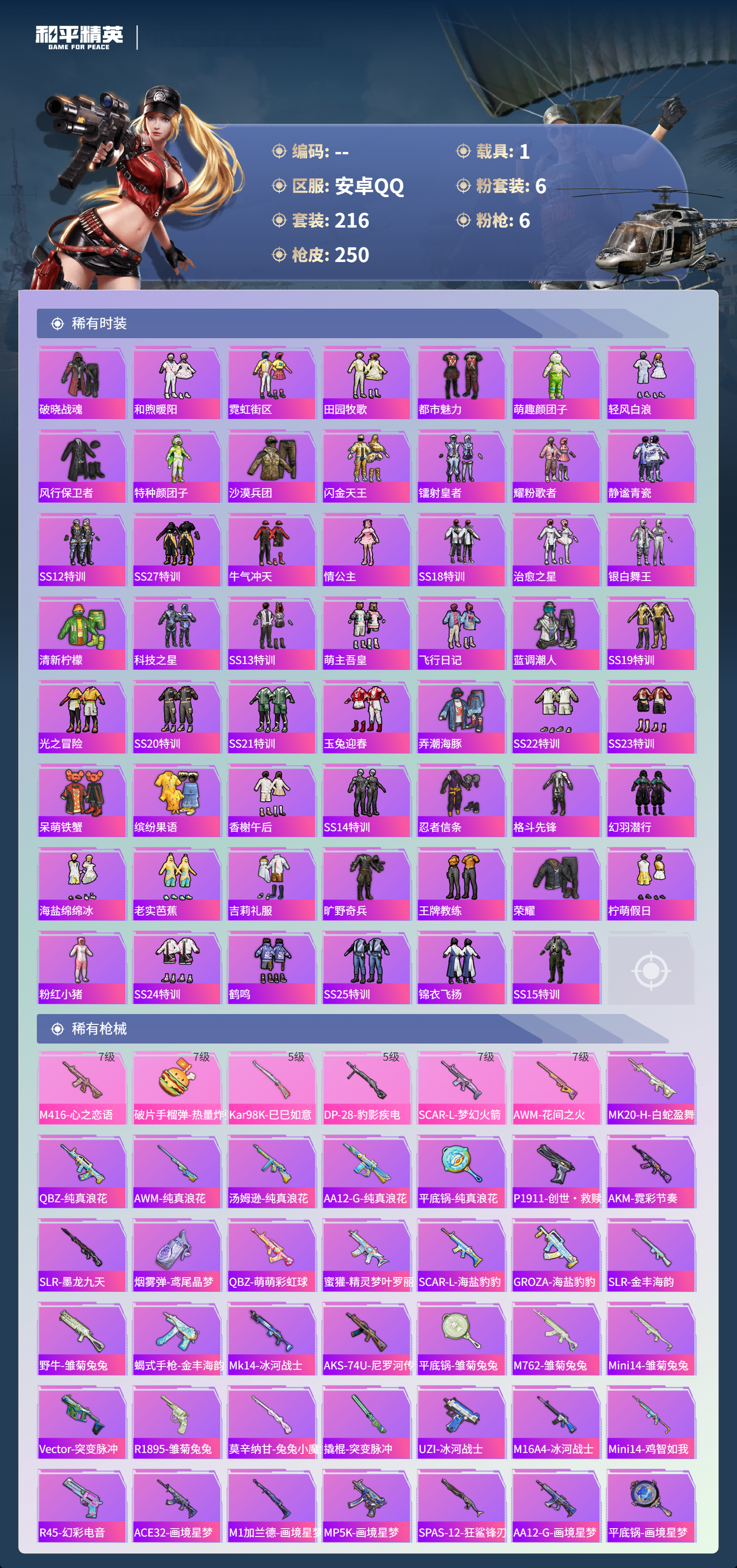 1载具-216套装-250呛皮-hs57680 安卓手q-17王牌印记-有战神框-6粉装-6特效呛-1载具-86562热力值-216套装-250呛皮-6卓越印记-3传奇印记【6粉装】套装-花间之火套装-极限特训套装-鎏金朋克角色-千金淑猫套装-未来战士套装-潮汐统领【6特效呛】dp-28-豹影疾电/5级kar98k-巳巳如意/5级scar-l-梦幻火箭/7级m416-心之恋语/7级awm-花间之火/7级