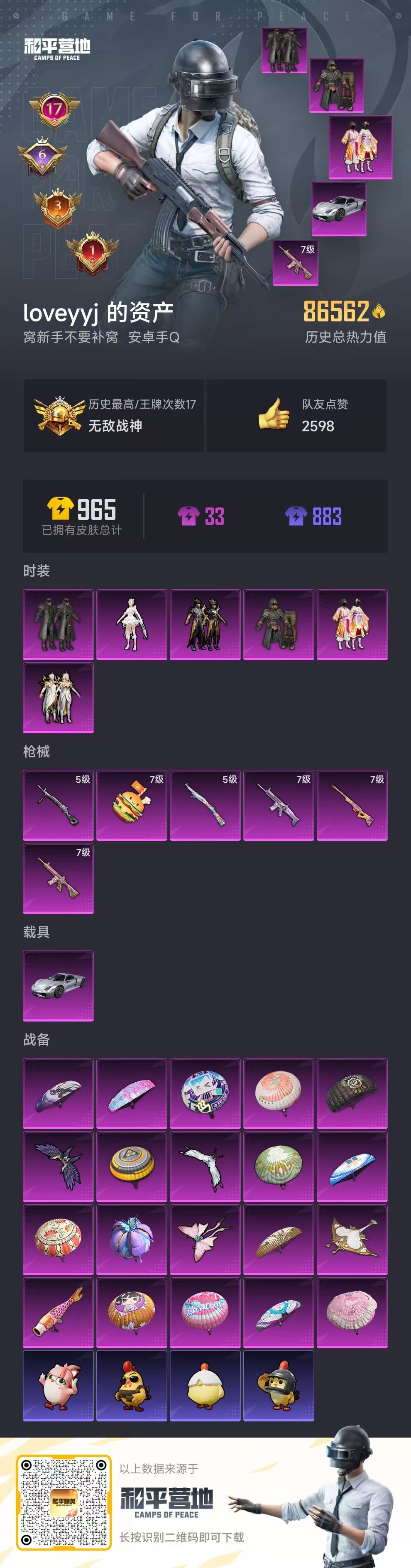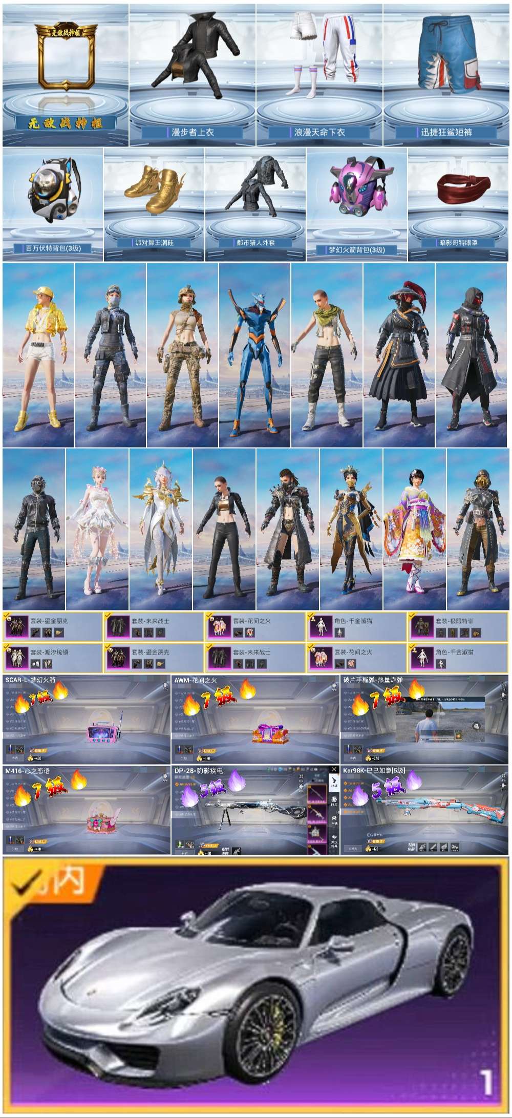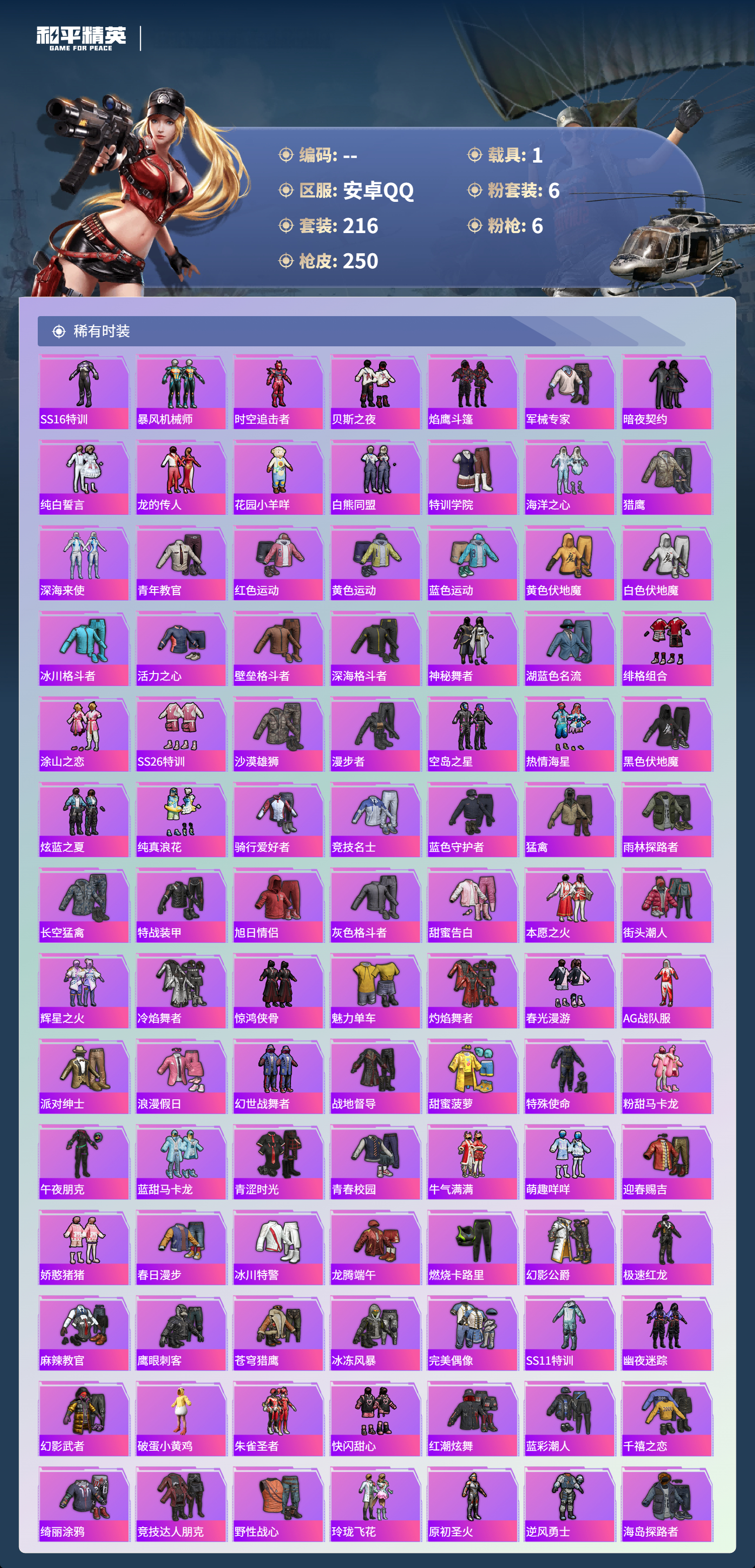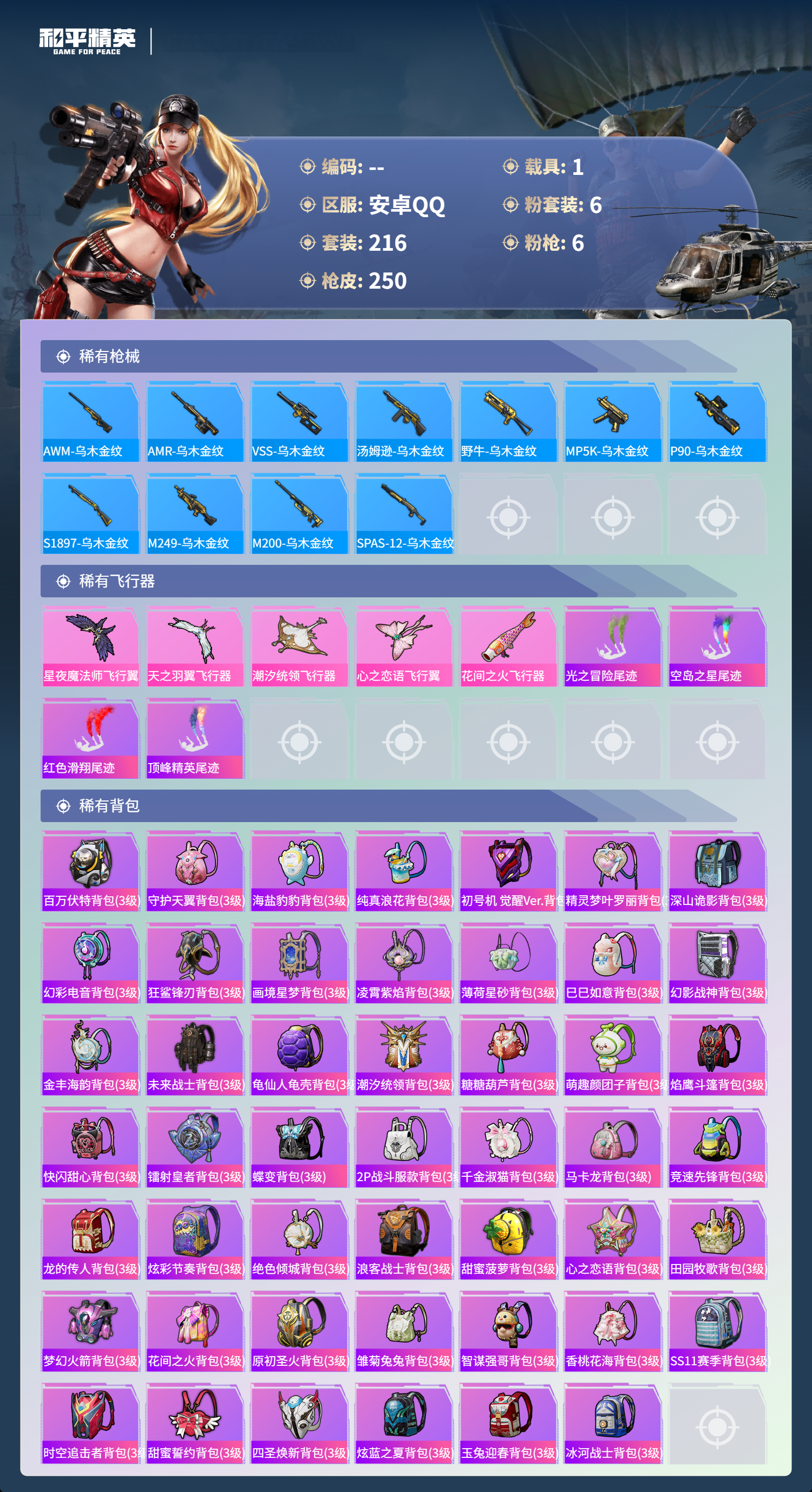 1载具-216套装-250呛皮-hs57680 安卓手q-17王牌印记-有战神框-6粉装-6特效呛-1载具-86562热力值-216套装-250呛皮-6卓越印记-3传奇印记【6粉装】套装-花间之火套装-极限特训套装-鎏金朋克角色-千金淑猫套装-未来战士套装-潮汐统领【6特效呛】dp-28-豹影疾电/5级kar98k-巳巳如意/5级scar-l-梦幻火箭/7级m416-心之恋语/7级awm-花间之火/7级
