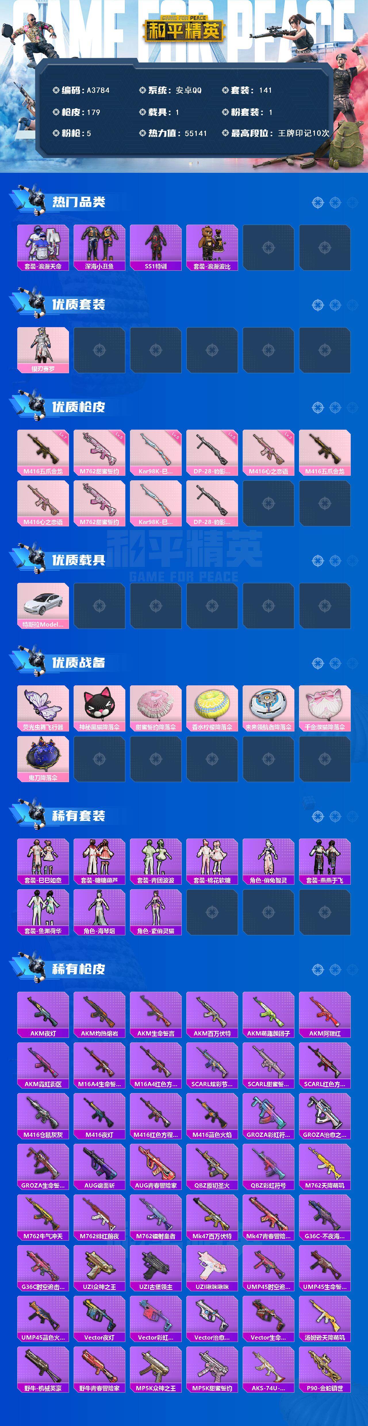 [15691503]安卓【小号 粉装-银刃赛罗/特斯拉model 3(珍珠白)/m416-五爪金龙/m416-心之恋语/m762-甜蜜誓约】 手q-1粉装-5特效呛-1载具-1粉色飞行器-55141热力值-10王牌印记-141套装-179呛皮 【热门品类】:套装-浪漫天命,套装-深海小丑鱼,套装-ss1特训,套装-浪漫波比 【粉色套装】:粉装-银刃赛罗 【粉色呛皮等级】:m416-五爪金龙七级,m416-心之恋语三级,m762-甜蜜誓约五级,kar98k-巳巳如意五级,dp-28-豹影疾电五级 【粉色载具】:特斯拉model 3(珍珠白) 【粉色呛皮】:m416-五爪金龙,m416-心之恋语,m762-甜蜜誓约,kar98k-巳巳如意,dp-28-豹影疾电 【粉色飞行器】:荧光虫舞飞行器 【粉色降落伞】:神秘黑猫降落伞,甜蜜誓约降落伞,香水柠檬降落伞,未来领航者降落伞,千金淑猫降落伞,鬼刀降落伞,炫彩糖果降落伞 【稀有套装】:套装-巳巳如意,套装-雪国风尚,套装-糖糖葫芦,套装-青团波波,套装-棉花软糖,角色-俏兔智灵,套装-燕燕于飞,套装-鱼渊荷华,角色-海琴烟,角色-紫俏灵猫 【稀有呛皮】:akm-夜灯,akm-灼热熔岩,akm-生命誓言,akm-百万伏特,akm-萌趣颜团子,akm-阿狸红,akm-霓虹街区,m16a4-生命誓言,m16a4-红色方程式,scar-l-炫彩节奏,scar-l-甜蜜誓约,scar-l-红色方程式,m416-仓鼠灰灰,m416-夜灯,m416-红色方程式,m416-蓝色火焰,groza-彩虹符号,groza-治愈之星,groza-生命誓言,aug-诡面斩,aug-青春冒险家,q-原初圣火,q-彩虹符号,m762-天降萌叽,m762-牛气冲天,m762-绯红前夜,m762-镭射皇者,mk47-百万伏特,mk47-青春冒险家,g36c-不夜海上花,g36c-时空追击者,uzi-众神之王,uzi-古堡领主,uzi-啾咪啾咪,ump45-时空追击者,ump45-生命誓言,ump45-蓝色火焰,vect-夜灯,vect-彩虹符号,vect-治愈之星,vect-生命誓言,汤姆逊-天降萌叽,野牛-机械英豪,野牛-青春冒险家,mp5k-众神之王,mp5k-甜蜜誓约,aks-74u-鬼刀,p90-金蛇镇世,p90-巳巳如意,