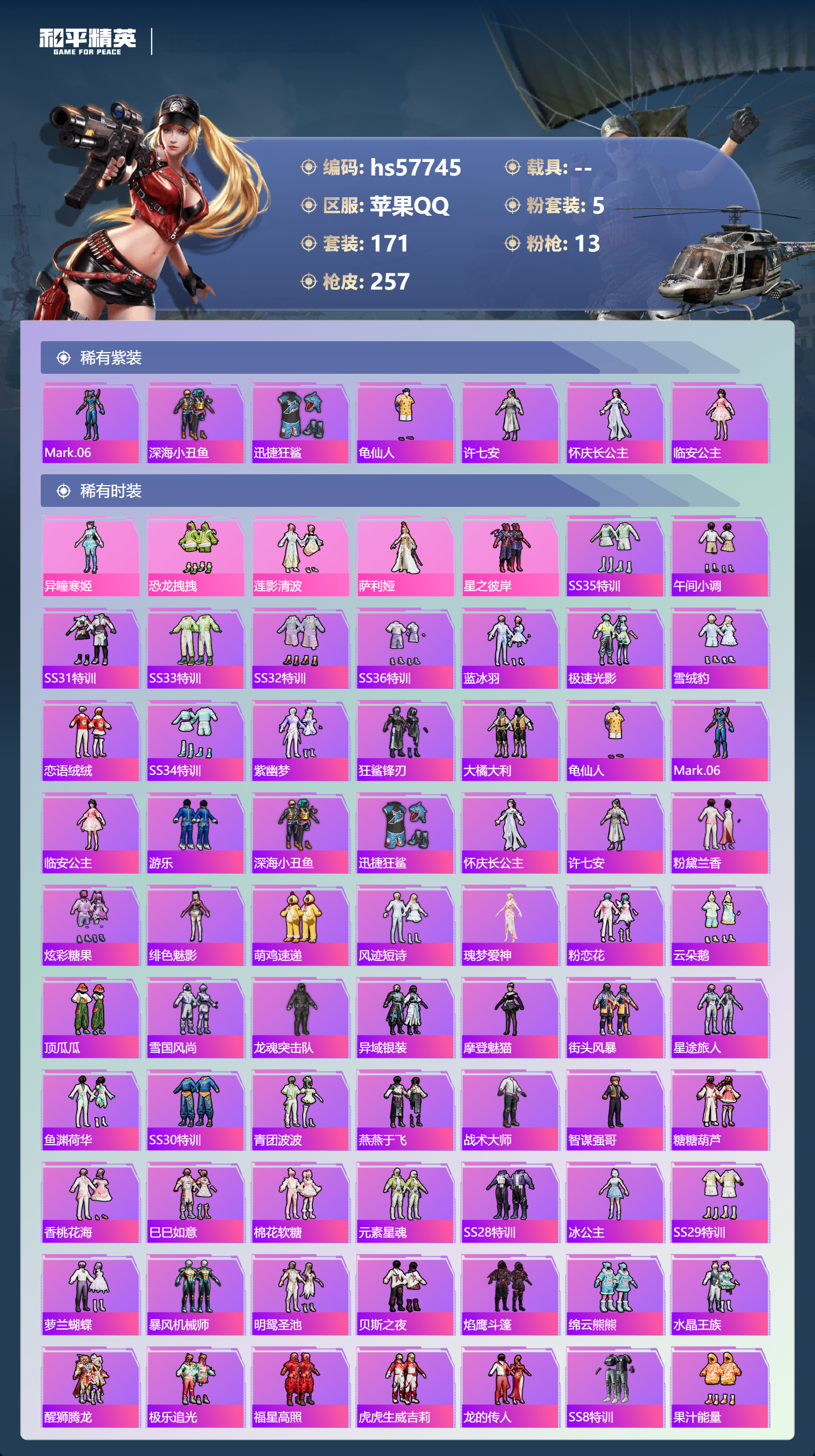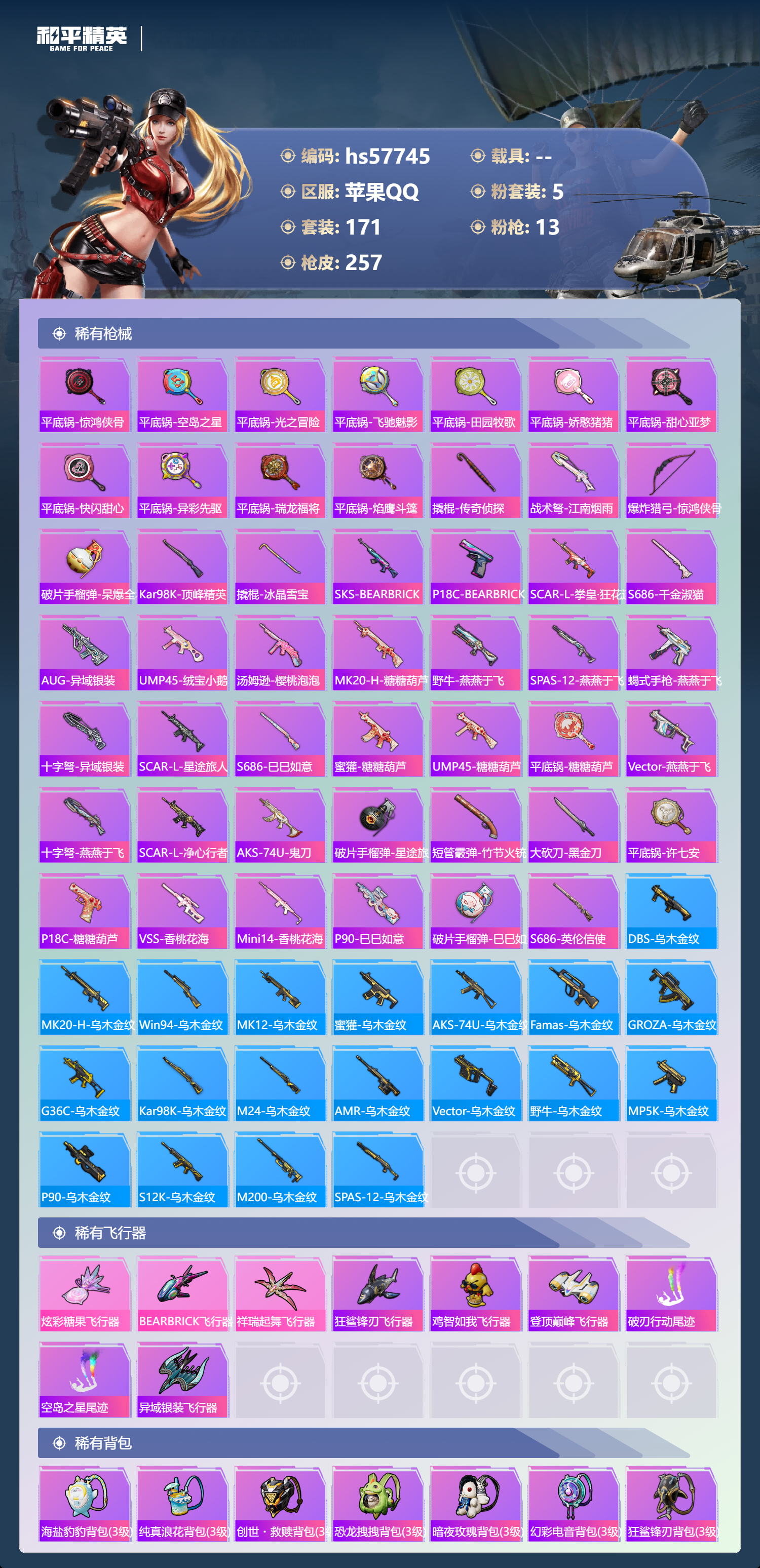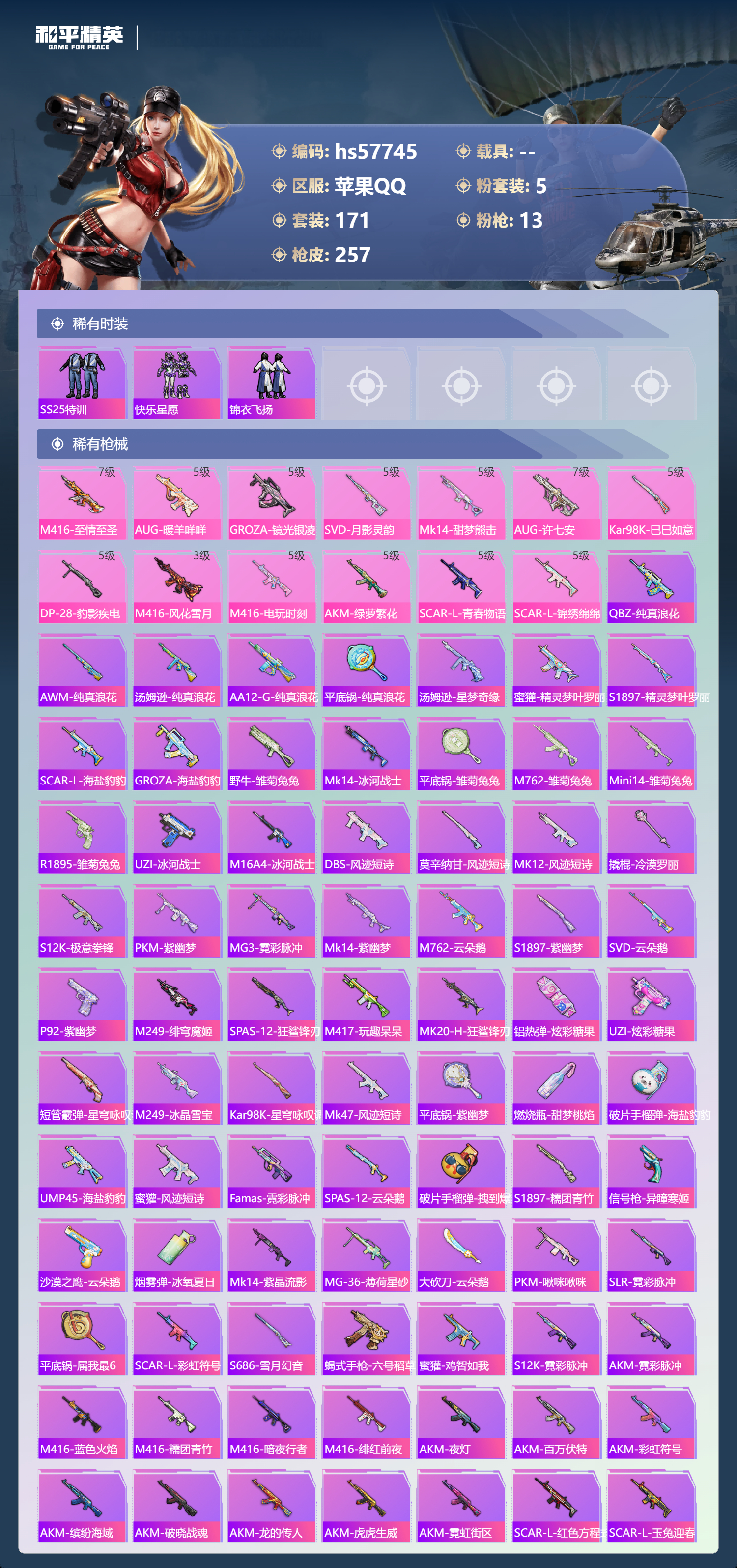 0载具-171套装-257呛皮-hs57745 苹果手q-17王牌印记-5粉装-13特效呛-79952热力值-171套装-257呛皮-4卓越印记【5粉装】套装-恐龙拽拽套装-莲影清波套装-星之彼岸角色-萨利娅角色-异瞳寒姬【13特效呛】m416-电玩时刻/5级m416-至情至圣/7级m416-风花雪月/3级dp-28-豹影疾电/5级akm-绿萝繁花/5级mk14-甜梦熊击/5级kar98k-巳巳如意/5级