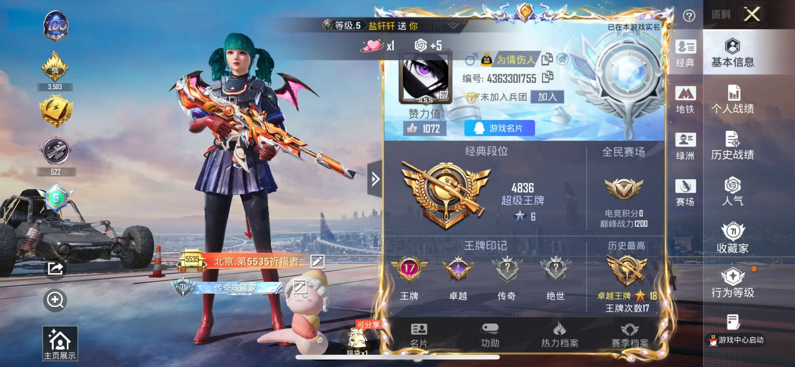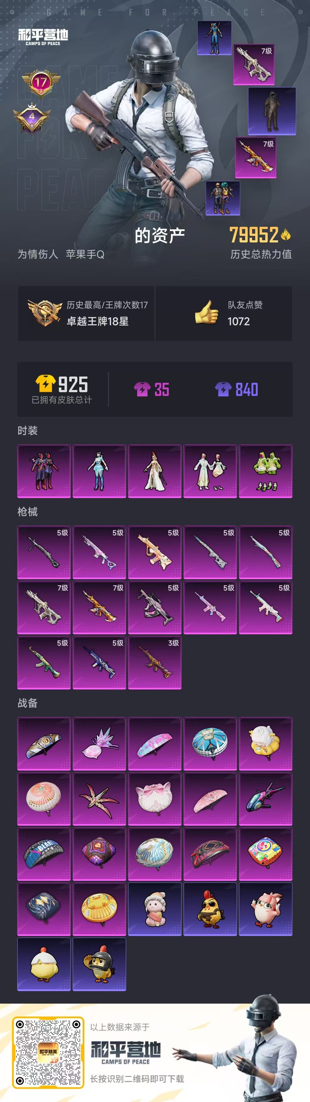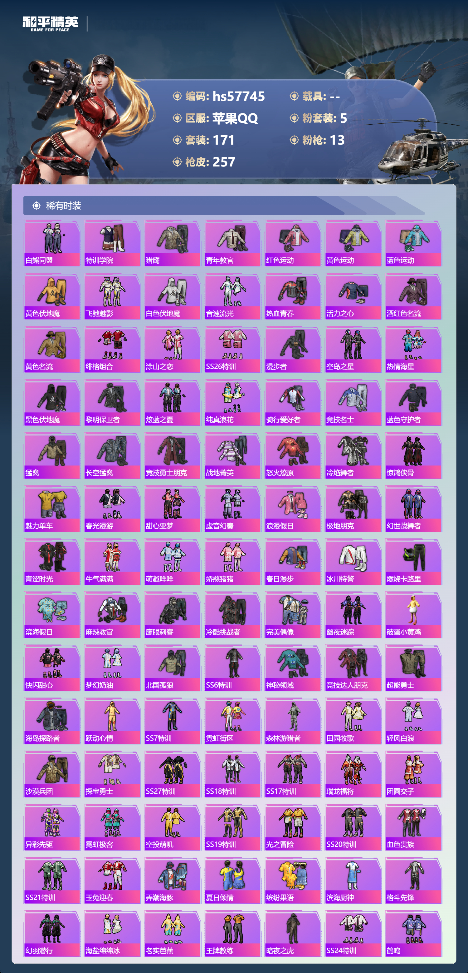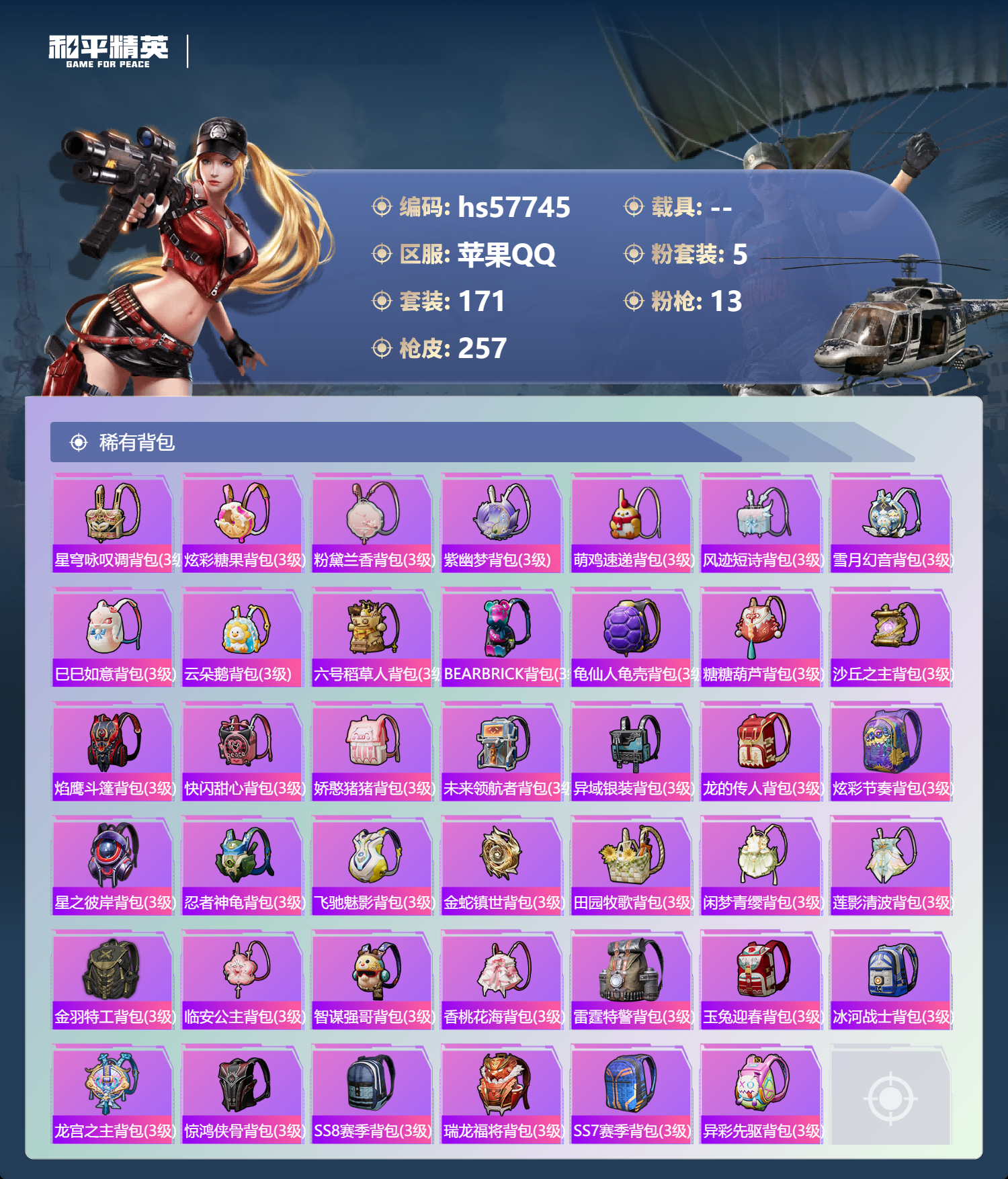 0载具-171套装-257呛皮-hs57745 苹果手q-17王牌印记-5粉装-13特效呛-79952热力值-171套装-257呛皮-4卓越印记【5粉装】套装-恐龙拽拽套装-莲影清波套装-星之彼岸角色-萨利娅角色-异瞳寒姬【13特效呛】m416-电玩时刻/5级m416-至情至圣/7级m416-风花雪月/3级dp-28-豹影疾电/5级akm-绿萝繁花/5级mk14-甜梦熊击/5级kar98k-巳巳如意/5级