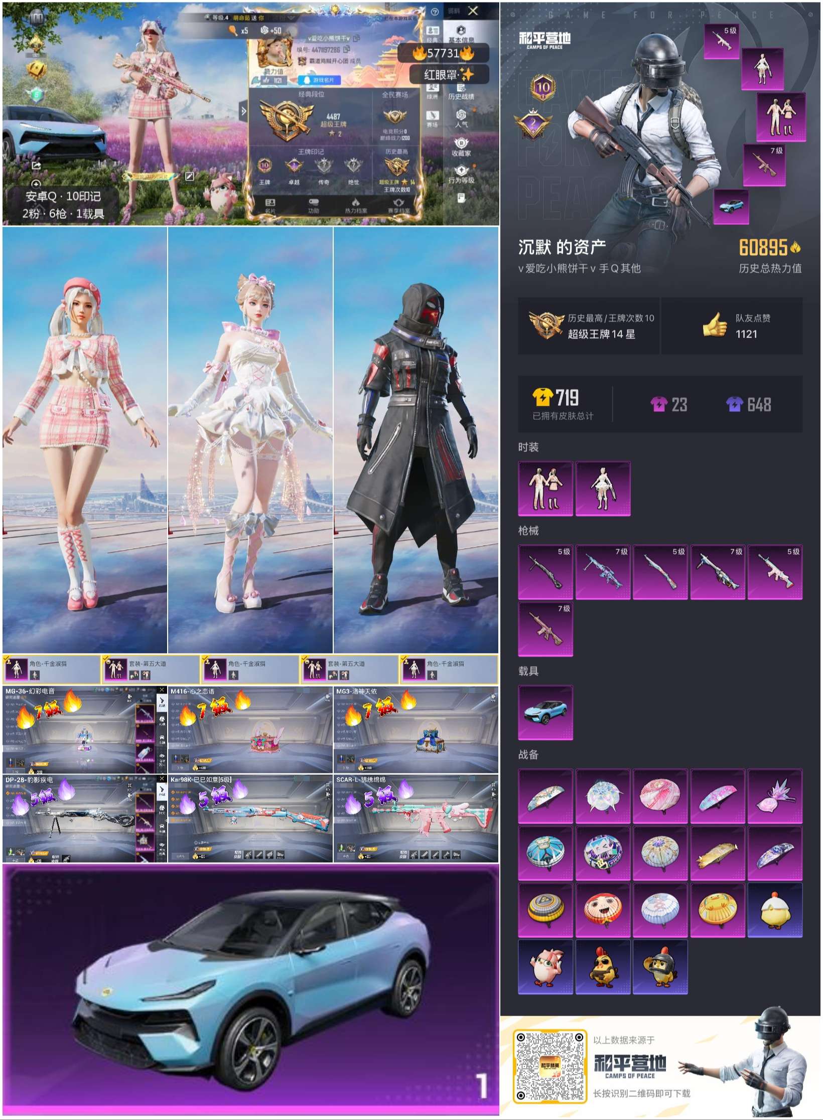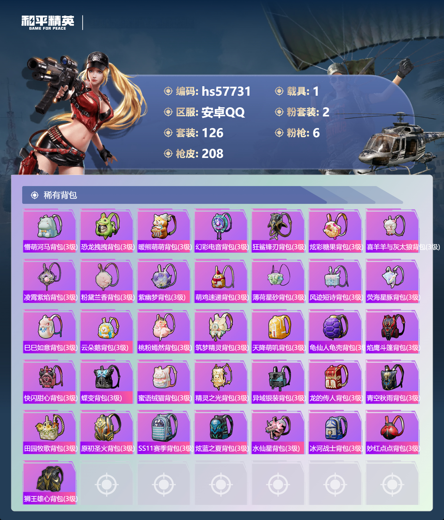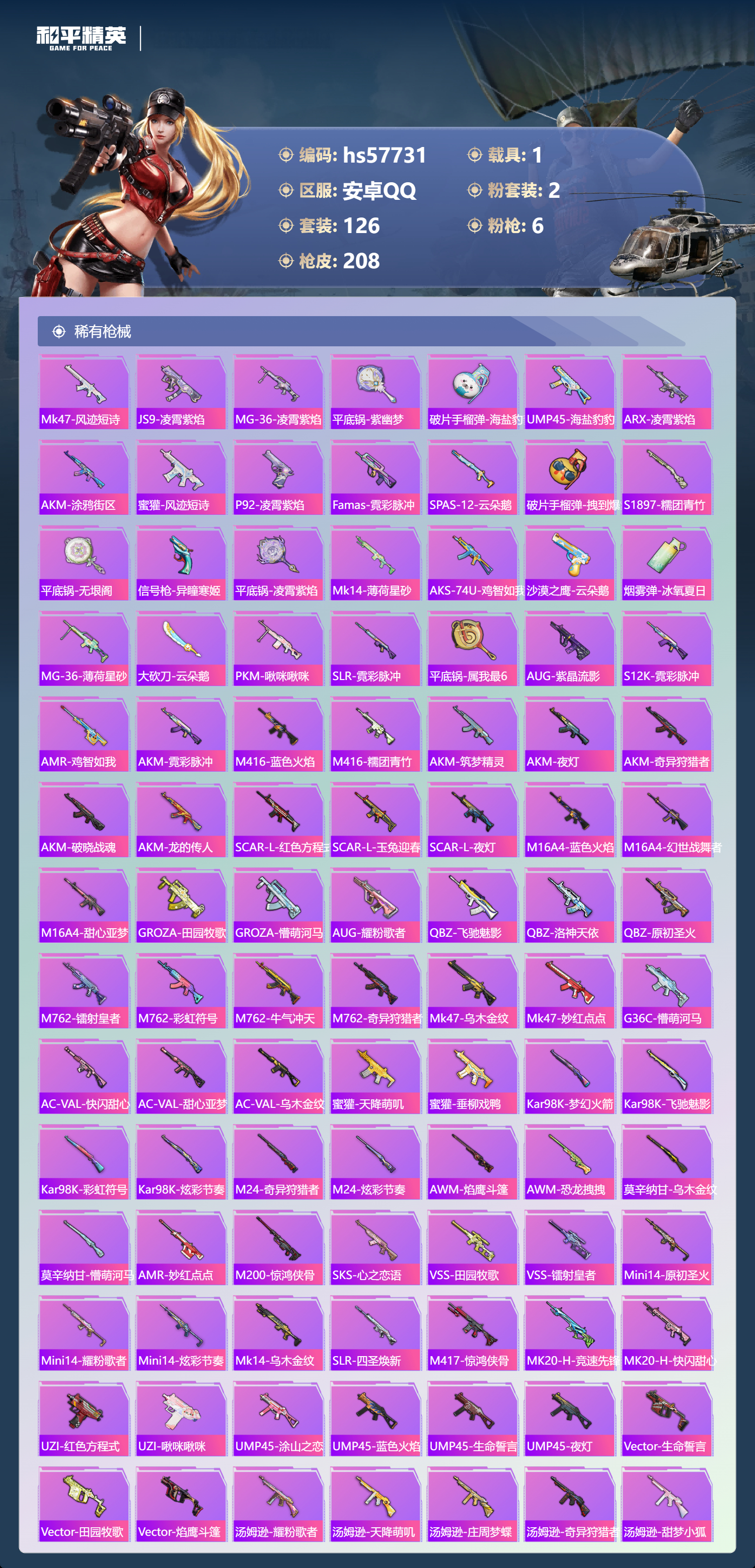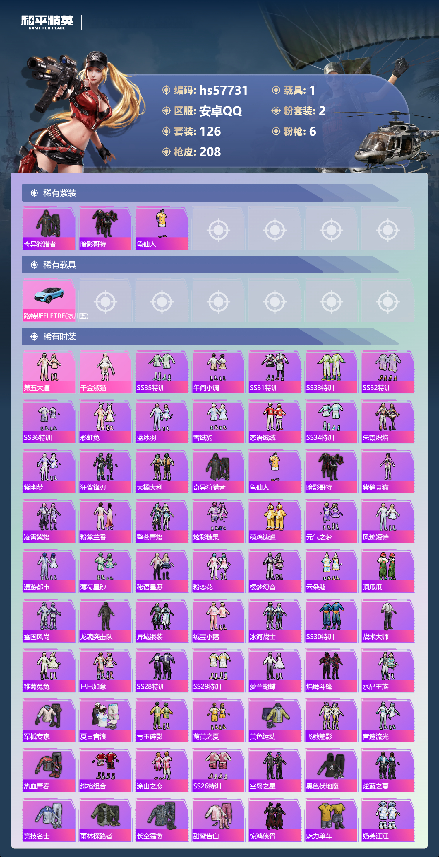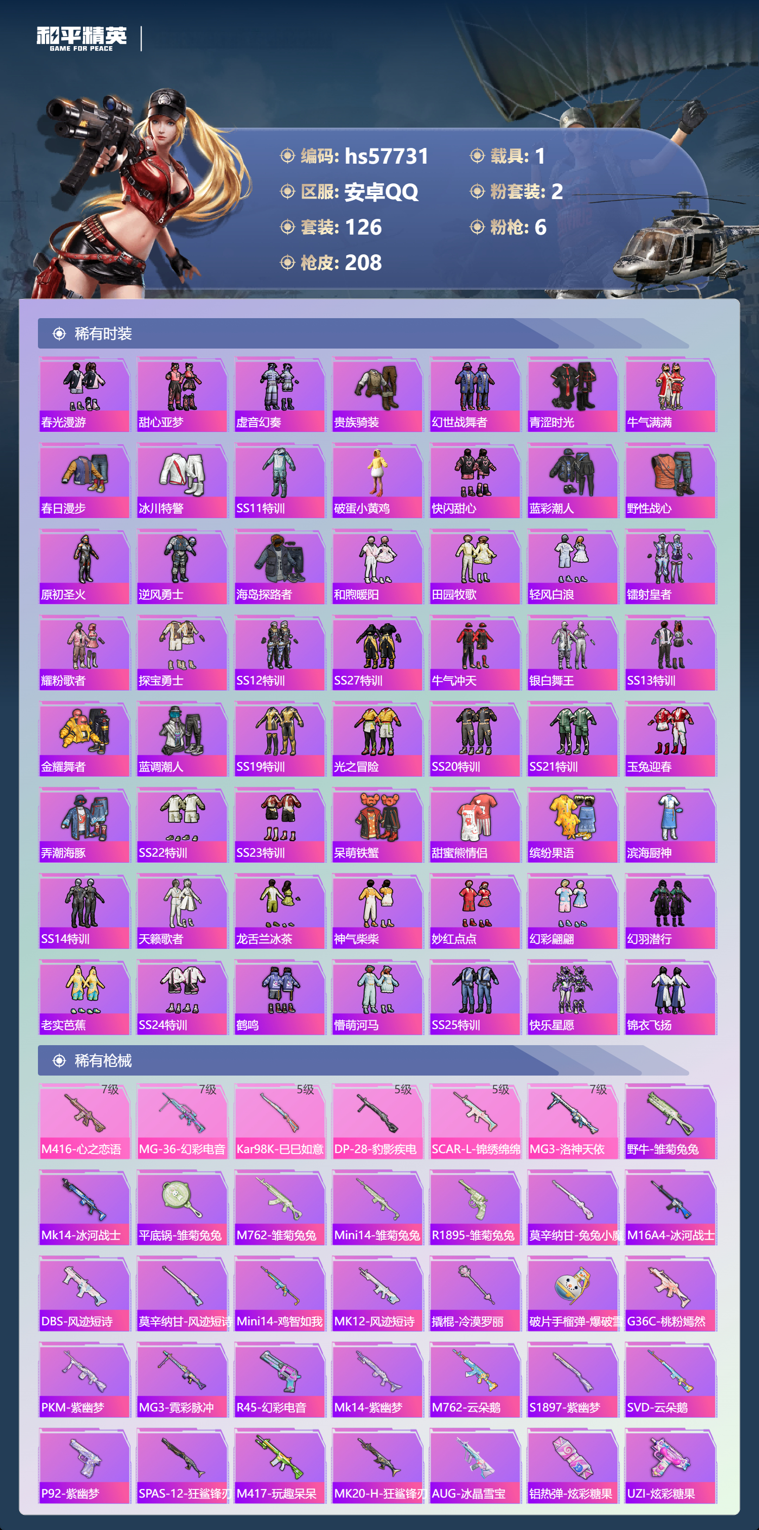 1载具-126套装-208呛皮-hs57731 安卓手q-10王牌印记-2粉装-6特效呛-1载具-60895热力值-126套装-208呛皮-2卓越印记【2粉装】套装-第五大道角色-千金淑猫【6特效呛】mg3-洛神天依/7级m416-心之恋语/7级scar-l-锦绣绵绵/5级mg-36-幻彩电音/7级dp-28-豹影疾电/5级kar98k-巳巳如意/5级【3稀有紫装】奇异狩猎者暗影哥特龟仙人【1稀有载具】路