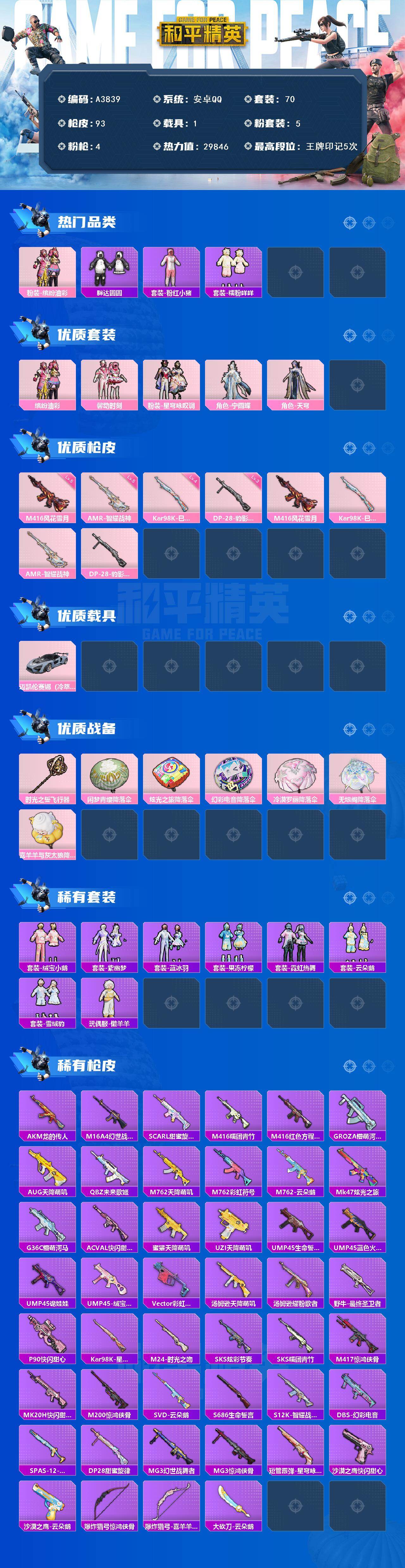 [15694899]安卓【小号 粉装-缤纷油彩/粉装-馨动时刻/迈凯伦塞纳(冷萃蓝)/m416-风花雪月/kar98k-巳巳如意/粉装-星穹咏叹调】 手q-5粉装-4特效呛-1载具-1粉色飞行器-29846热力值-5王牌印记-70套装-93呛皮 【热门品类】:粉装-缤纷油彩,套装-胖达圆圆,套装-粉红小猪,套装-糯粉咩咩 【粉色套装】:粉装-缤纷油彩,粉装-馨动时刻,粉装-星穹咏叹调,角色-宁雨蝶,角色-天穹 【粉色呛皮等级】:m416-风花雪月五级,kar98k-巳巳如意四级,amr-智耀战神五级,dp-28-豹影疾电三级 【粉色载具】:迈凯伦塞纳(冷萃蓝) 【粉色呛皮】:m416-风花雪月,kar98k-巳巳如意,amr-智耀战神,dp-28-豹影疾电 【粉色飞行器】:时光之誓飞行器 【粉色降落伞】:闲梦青缨降落伞,炫光之旅降落伞,幻彩电音降落伞,冷漠罗丽降落伞,无垠阁降落伞,喜羊羊与灰太狼降落伞 【稀有套装】:套装-绒宝小鹅,套装-紫幽梦,套装-蓝冰羽,套装-果冻柠檬,套装-霓虹热舞,套装-云朵鹅,套装-雪绒豹,玩偶服-懒羊羊 【稀有呛皮】:akm-龙的传人,m16a4-幻世战舞者,scar-l-甜蜜旋律,m416-糯团青竹,m416-红色方程式,groza-懵萌河马,aug-天降萌叽,q-未来歌姬,m762-天降萌叽,m762-彩虹符号,m762-云朵鹅,mk47-炫光之旅,g36c-懵萌河马,ac-val-快闪甜心,蜜獾-天降萌叽,uzi-天降萌叽,ump45-生命誓言,ump45-蓝色火焰,ump45-诡娃娃,ump45-绒宝小鹅,vect-彩虹符号,汤姆逊-天降萌叽,汤姆逊-耀粉歌者,野牛-最终圣卫者,p90-快闪甜心,kar98k-星穹咏叹调,m24-时光之吻,sks-炫彩节奏,sks-糯团青竹,m417-惊鸿侠骨,mk20-h-快闪甜心,m200-惊鸿侠骨,svd-云朵鹅,s686-生命誓言,s12k-智耀战神,dbs-幻彩电音,spas-12-云朵鹅,dp-28-甜蜜旋律,mg3-幻世战舞者,mg3-惊鸿侠骨,短管霰弹-星穹咏叹调,沙墨之鹦-快闪甜心,沙墨之鹦-云朵鹅,爆炸猎弓-惊鸿侠骨,爆炸猎弓-喜羊羊与灰太狼,大砍刀-云朵鹅 【其他套装】:套装-ss23特训,套装-ss25特训,套装-ss26特训,套装-ss27特训,套装-ss28特训