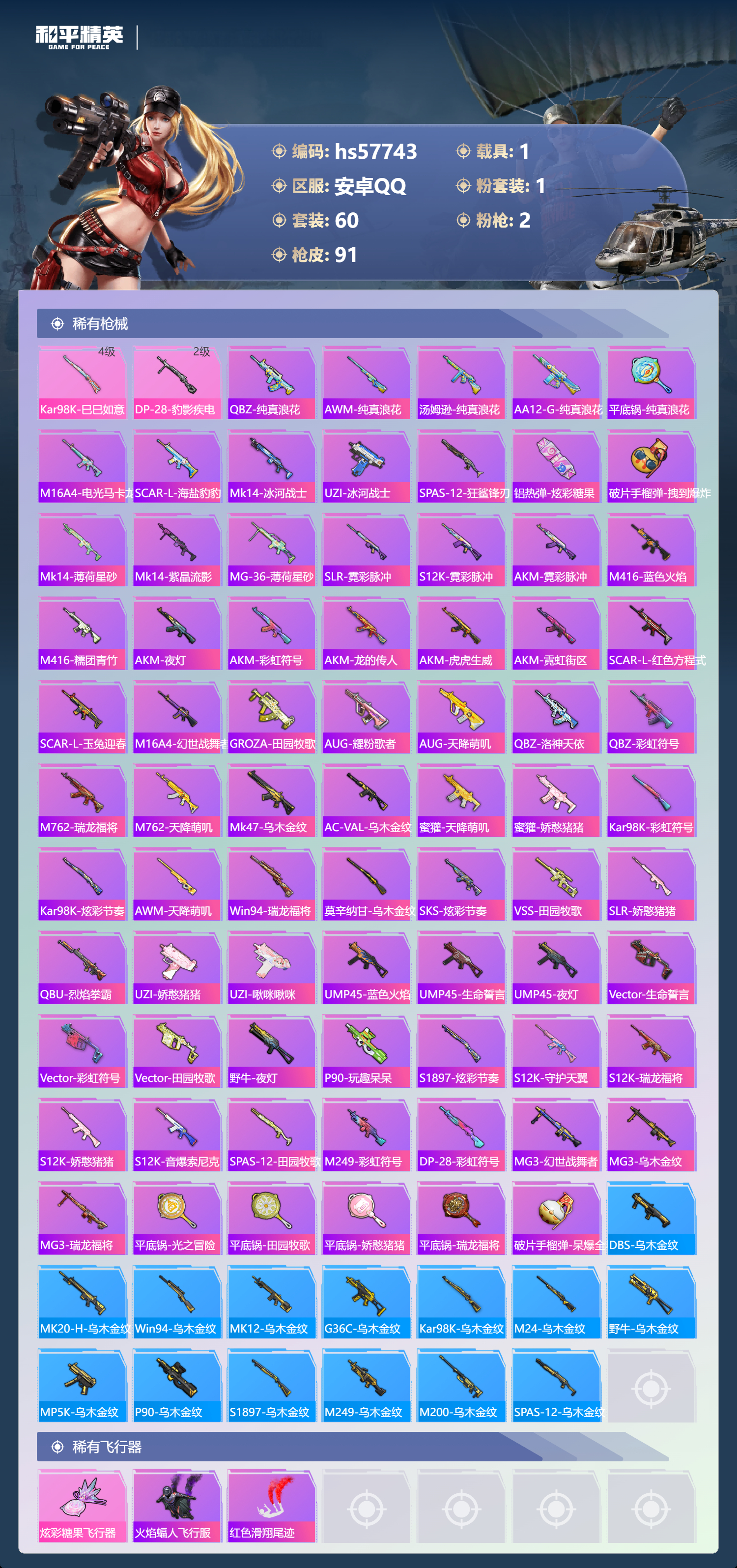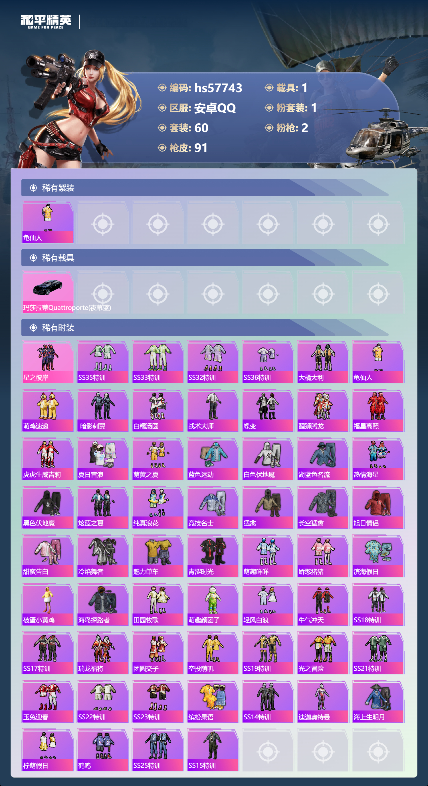 1载具-60套装-91呛皮-hs57743 安卓手q-0王牌印记-1粉装-2特效呛-1载具-28501热力值-60套装-91呛皮【1粉装】套装-星之彼岸【2特效呛】dp-28-豹影疾电/2级kar98k-巳巳如意/4级【1稀有紫装】龟仙人【1稀有载具】玛莎拉蒂quattropte夜幕蓝【60稀有时装】ss35特训ss33特训ss32特训ss36特训大橘大利龟仙人萌鸡速递 暗影刺翼星之彼岸