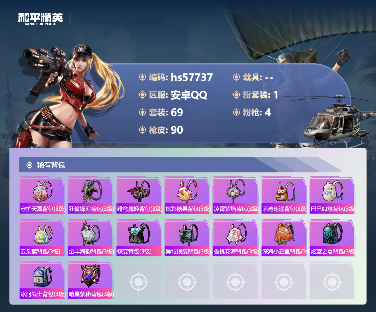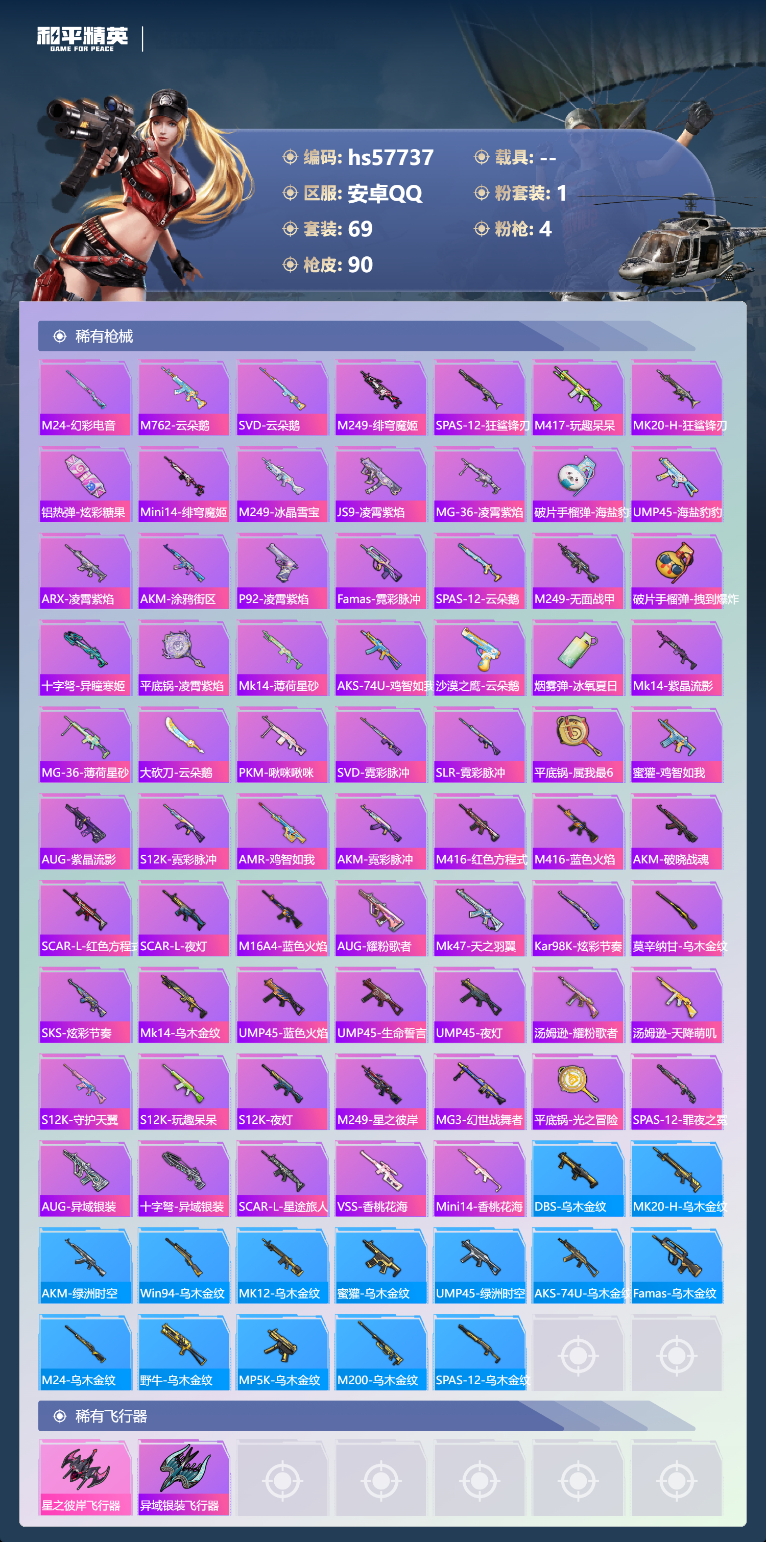 hs57737 安卓手q-1王牌印记-1粉装-4特效呛-23335热力值-69套装-90呛皮-1卓越印记-1传奇印记【1粉装】套装-星穹咏叹调【4特效呛】mg-36-沧焰双生/5级groza-镜光银凌/5级kar98k-巳巳如意/5级dp-28-豹影疾电/5级【3稀有紫装】mark.06暗影哥特浪漫天命【69稀有时装】星穹咏叹调ss35特训ss31特训ss33特训ss32