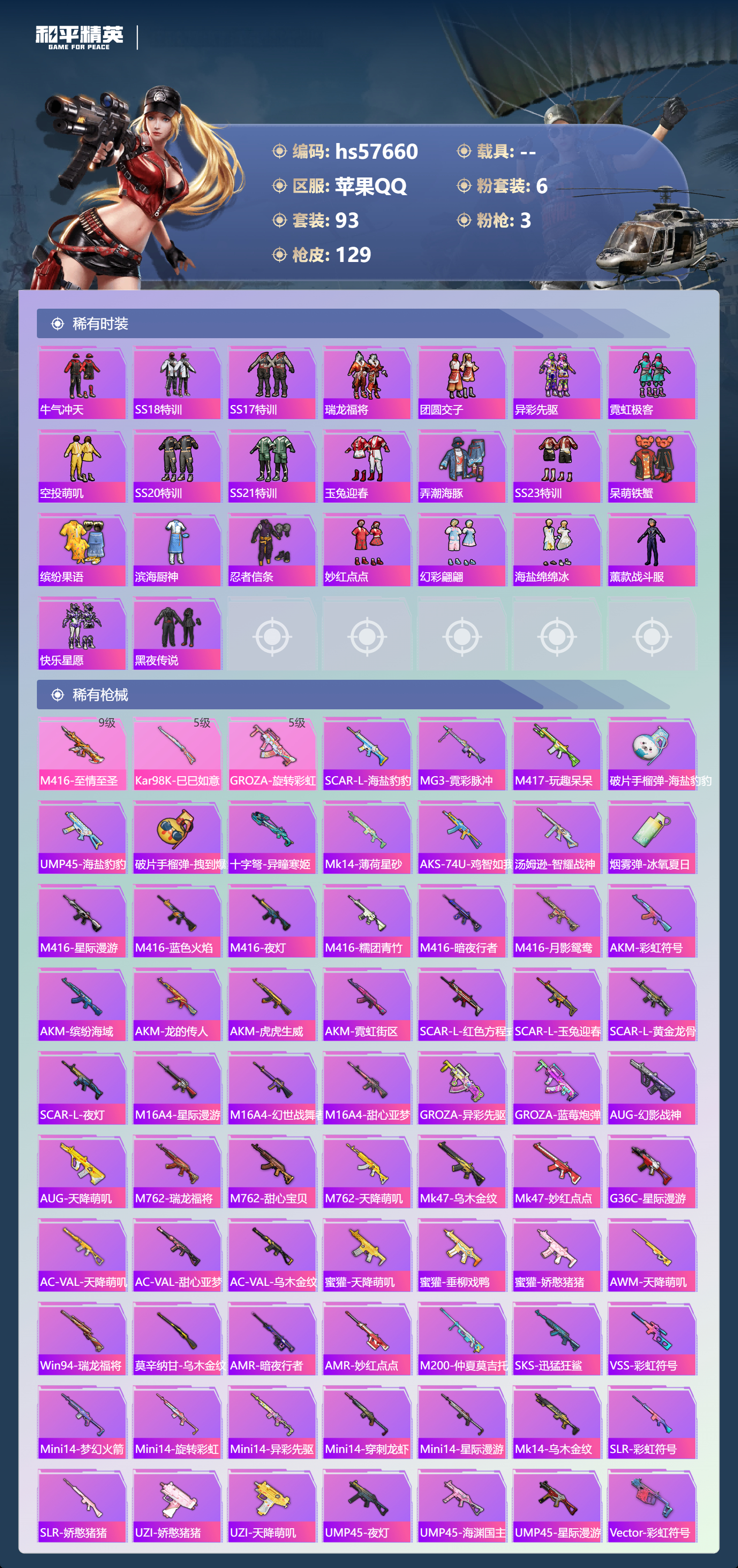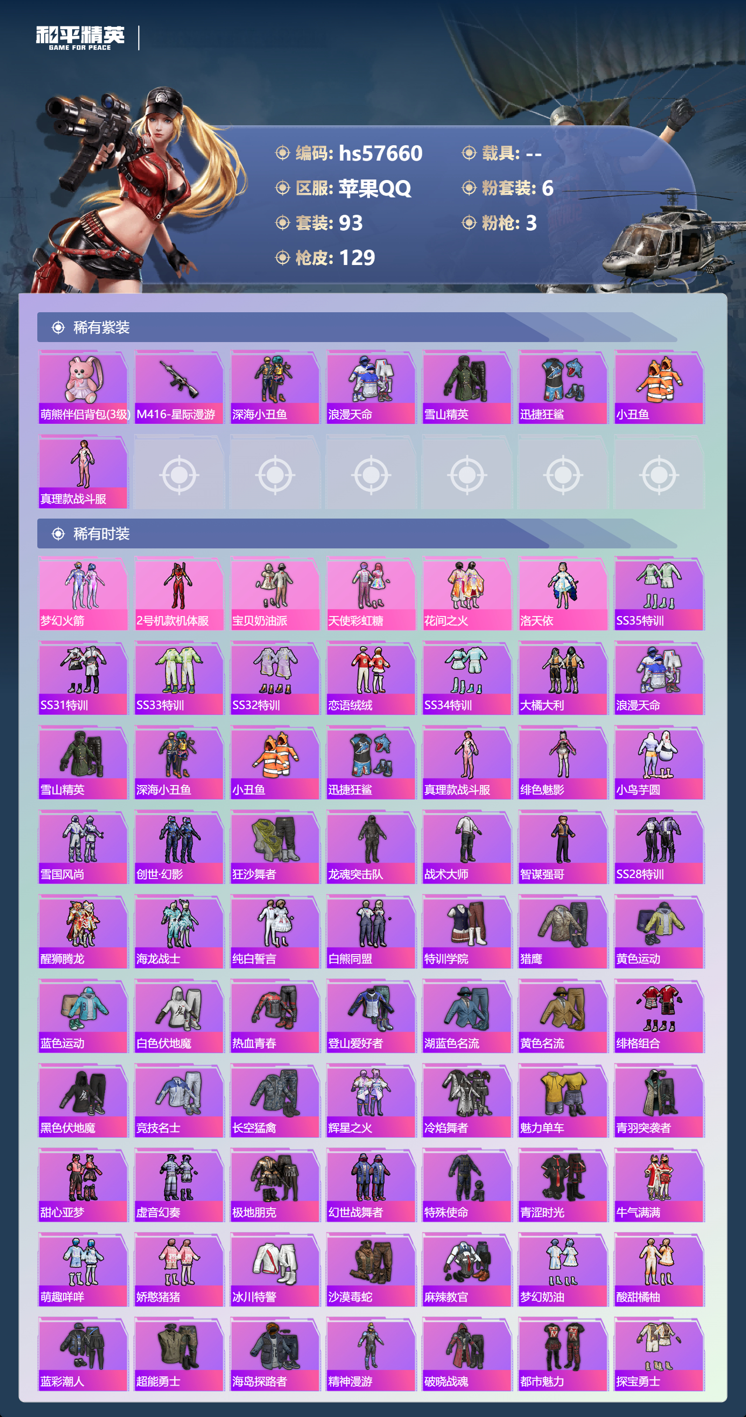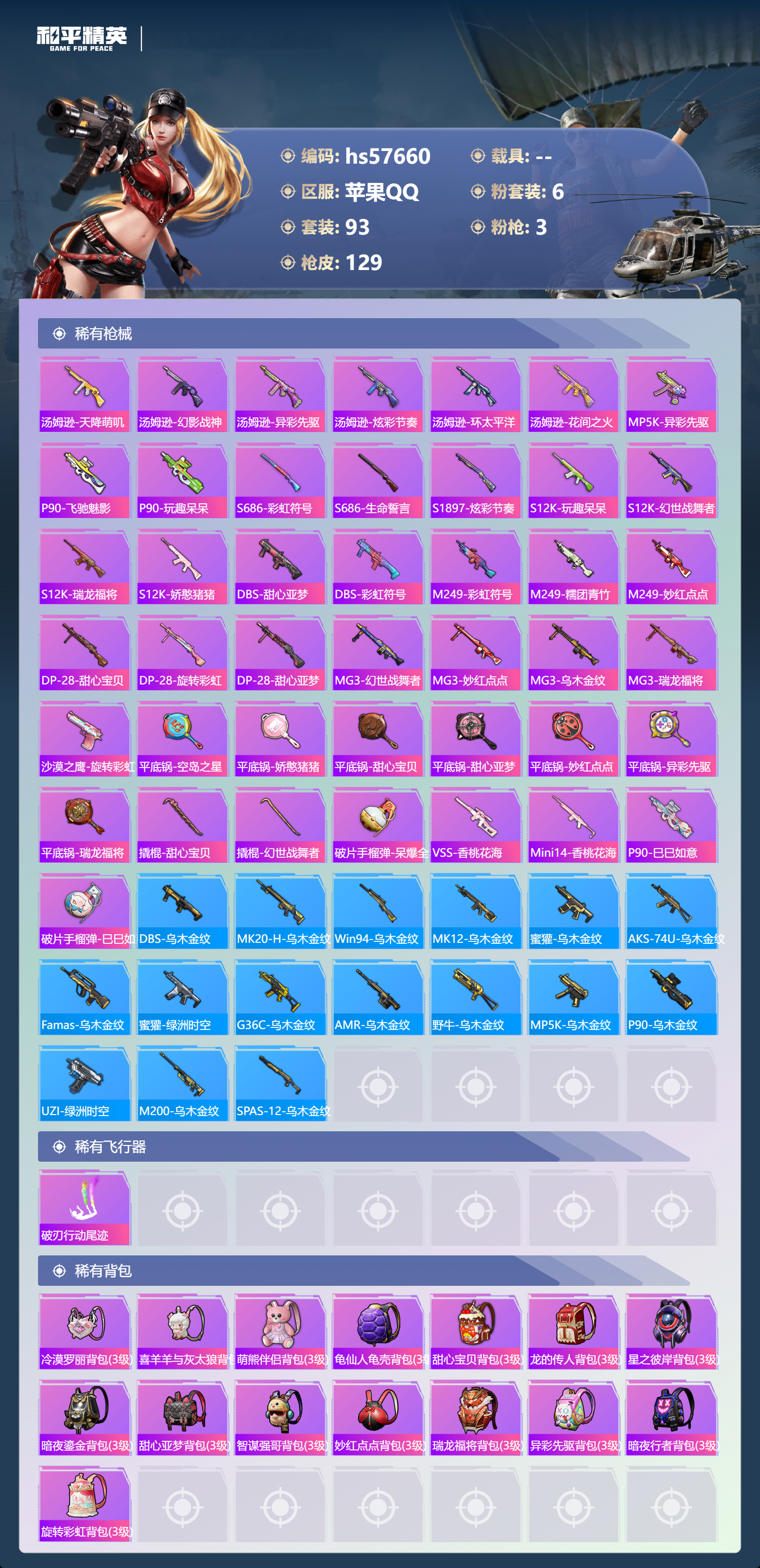 hs57660 苹果手q-7王牌印记-6粉装-3特效呛-38811热力值-93套装-129呛皮【6粉装】套装-花间之火套装-宝贝奶油派角色-洛天依套装-天使彩虹糖角色-2号机款机体服套装-梦幻火箭【3特效呛】kar98k-巳巳如意/5级groza-旋转彩虹/5级m416-至情至圣/9级【8稀有紫装】萌熊伴侣背包3级m416-星际漫游深海小丑鱼浪漫天命雪山精英迅捷狂