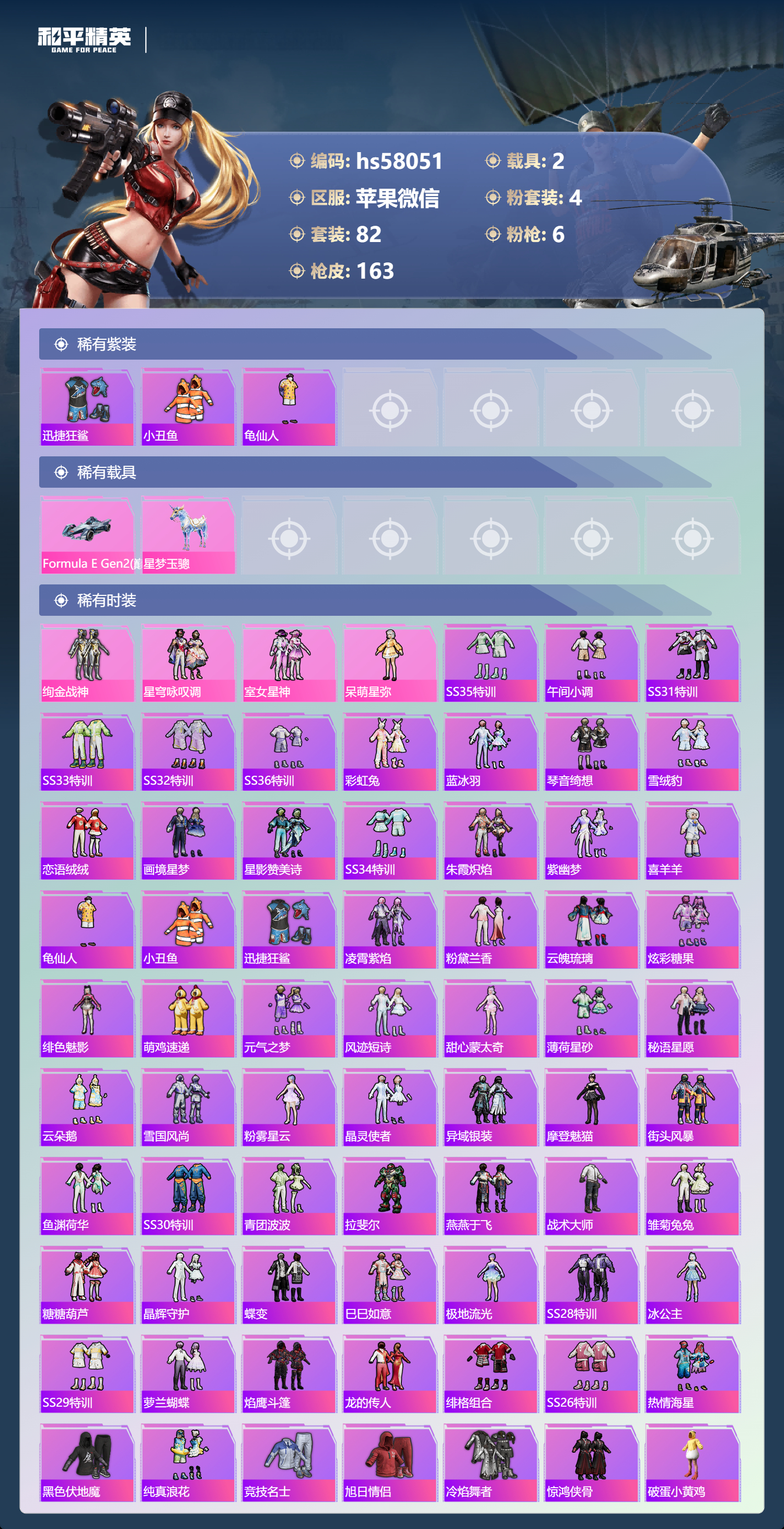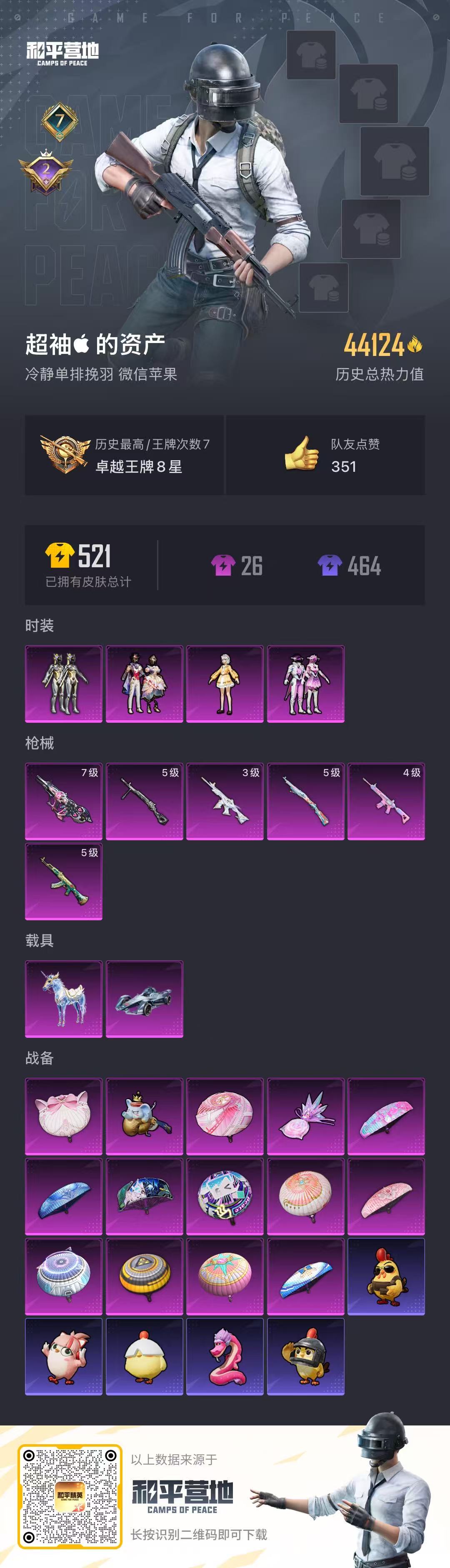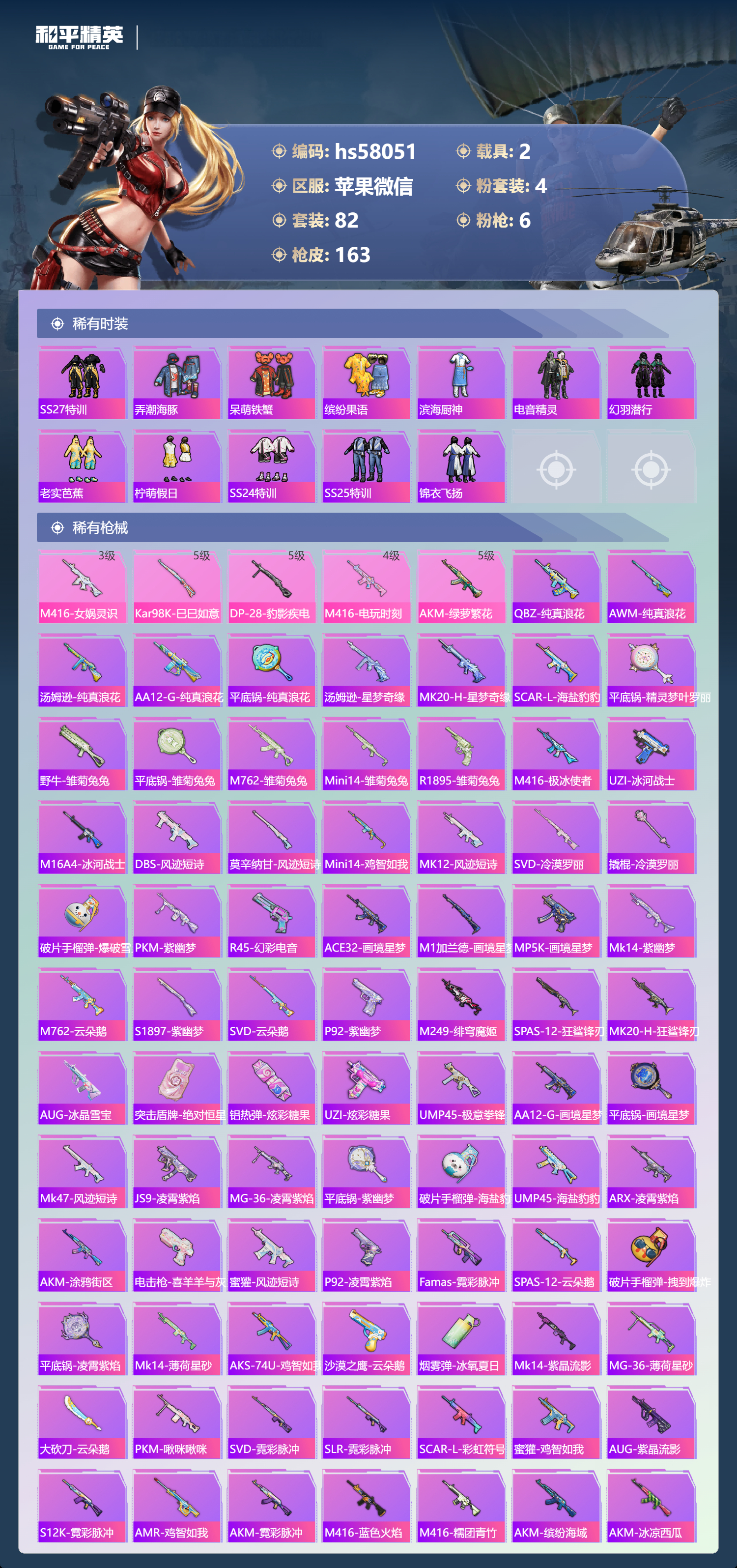 2载具-82套装-163呛皮-hs58051 苹果微信-7王牌印记-4粉装-6特效呛-2载具-44124热力值-82套装-163呛皮-2卓越印记【4粉装】套装-室女星神套装-绚金战神角色-呆萌星弥套装-星穹咏叹调【6特效呛】akm-绿萝繁花/5级dp-28-豹影疾电/5级kar98k-巳巳如意/5级m416-电玩时刻/4级aug-罪夜之冕/7级m416-女娲灵识/3级【3稀有紫装】迅捷狂鲨小丑鱼龟仙人
