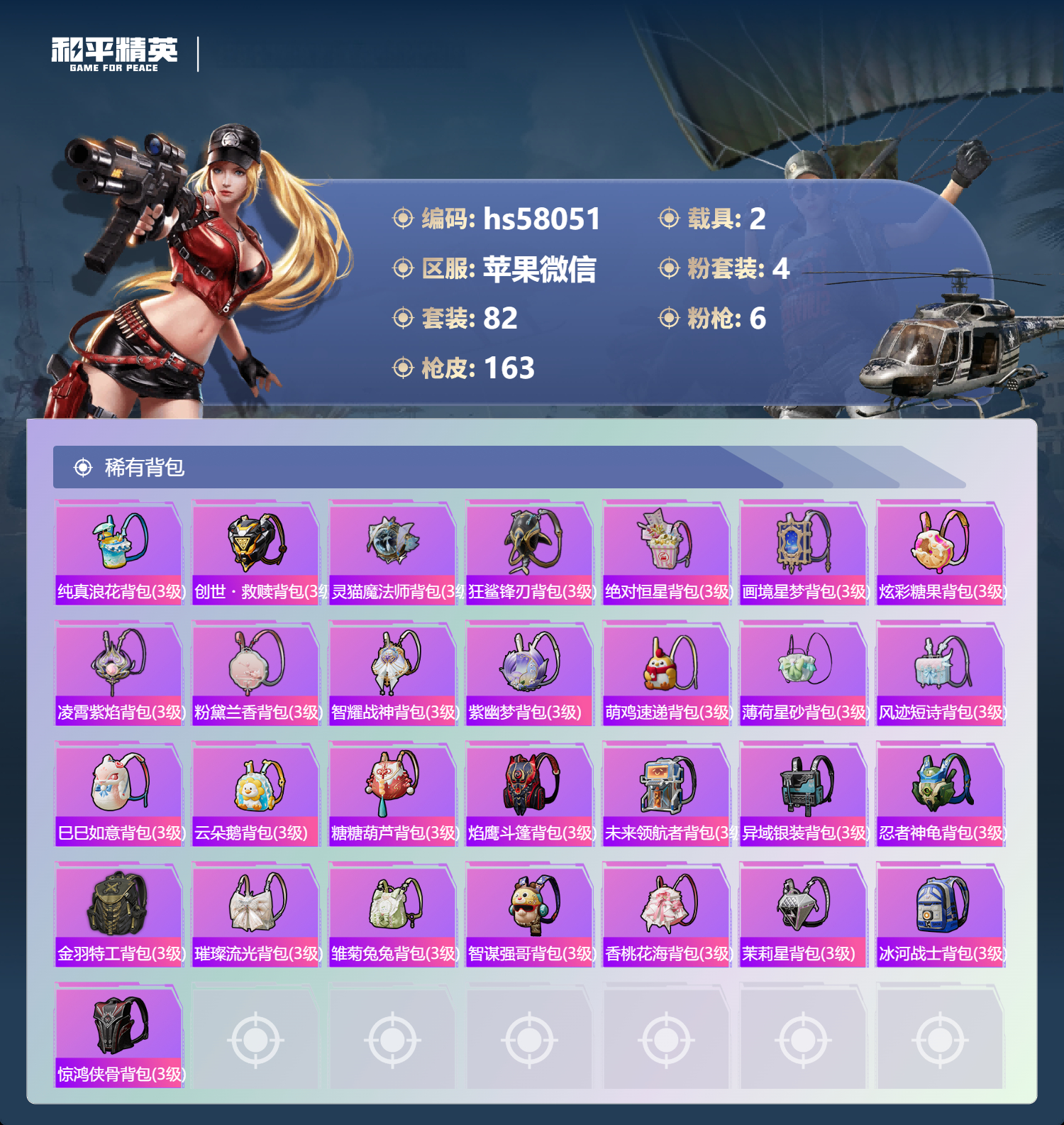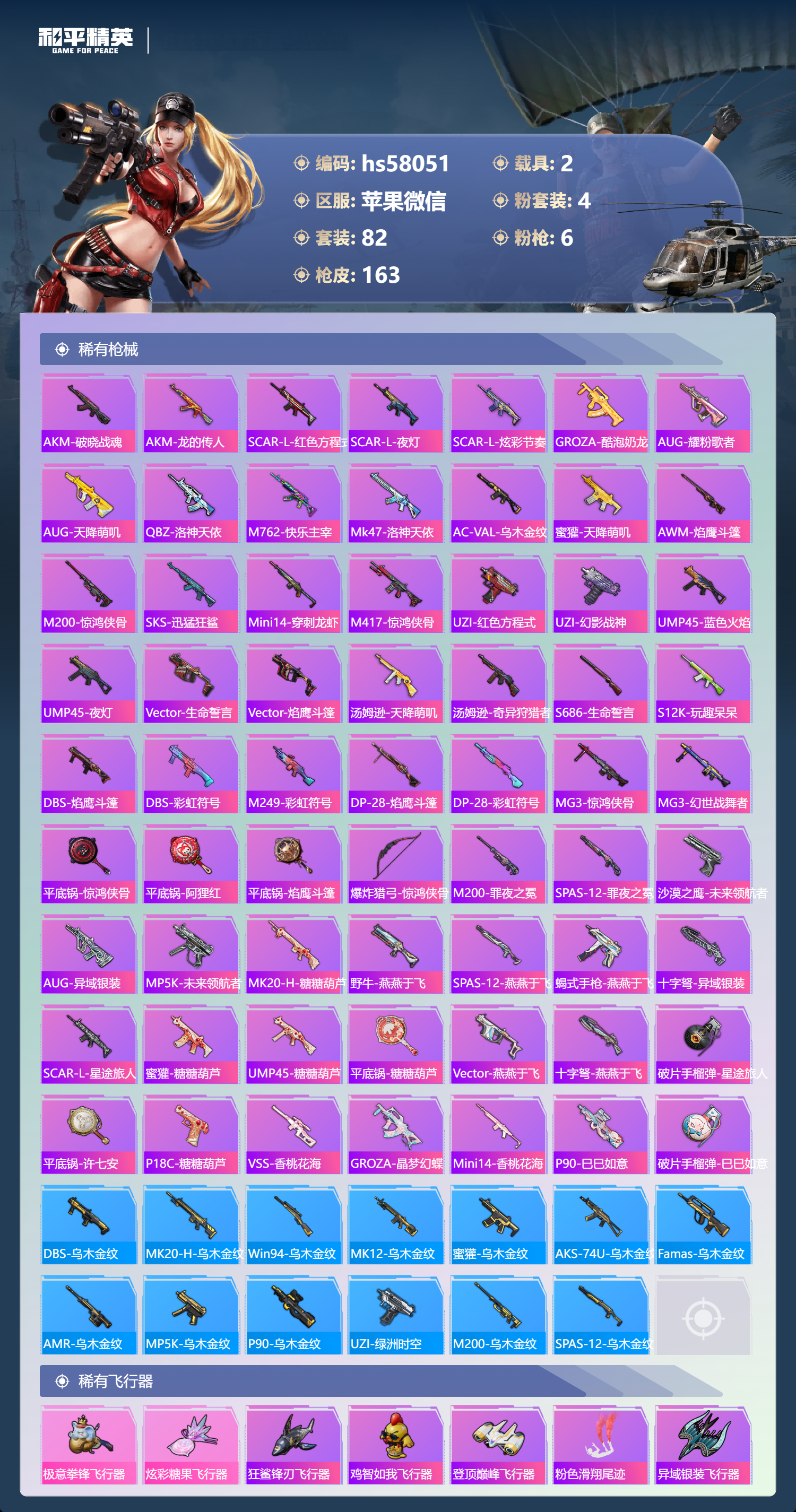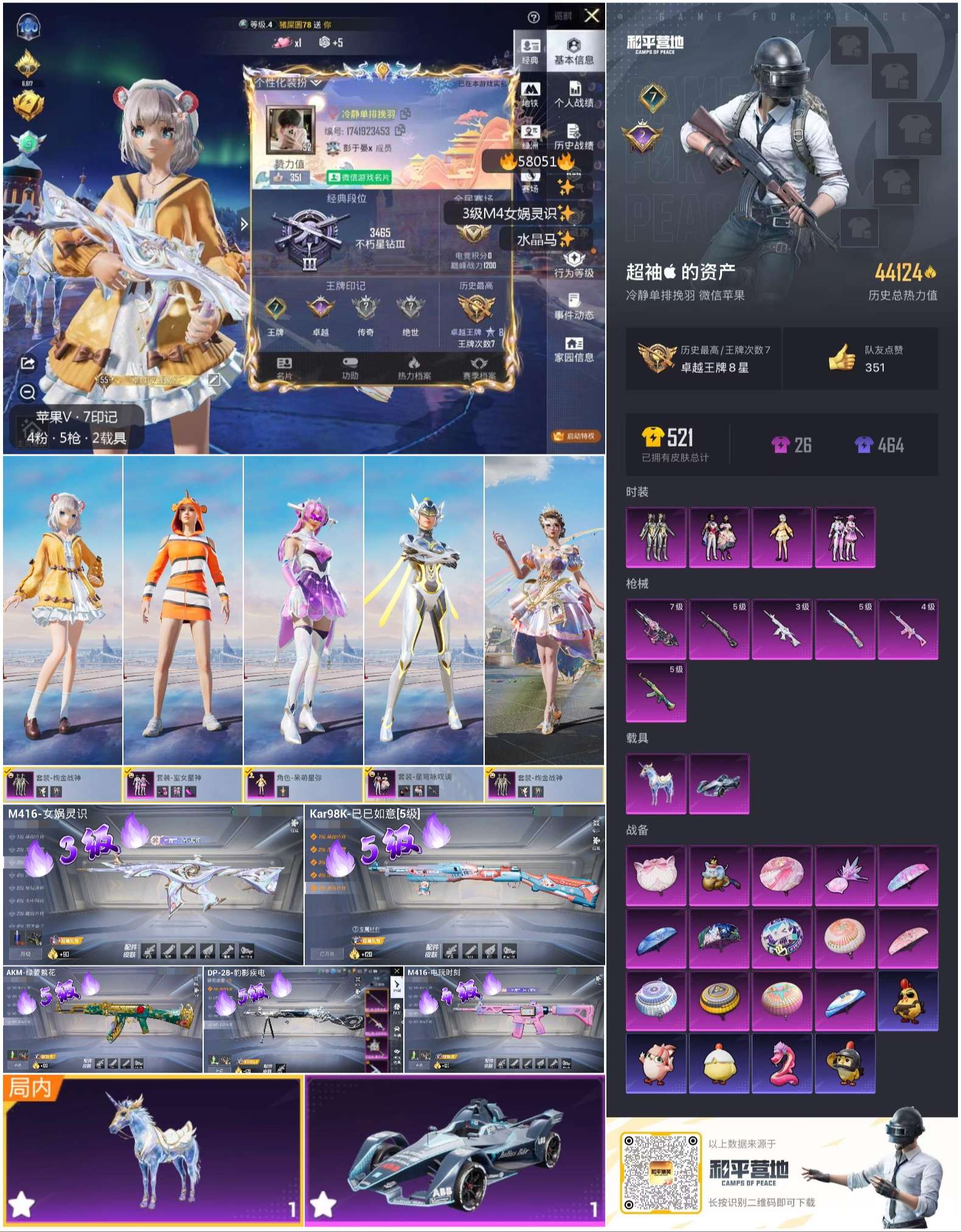 2载具-82套装-163呛皮-hs58051 苹果微信-7王牌印记-4粉装-6特效呛-2载具-44124热力值-82套装-163呛皮-2卓越印记【4粉装】套装-室女星神套装-绚金战神角色-呆萌星弥套装-星穹咏叹调【6特效呛】akm-绿萝繁花/5级dp-28-豹影疾电/5级kar98k-巳巳如意/5级m416-电玩时刻/4级aug-罪夜之冕/7级m416-女娲灵识/3级【3稀有紫装】迅捷狂鲨小丑鱼龟仙人