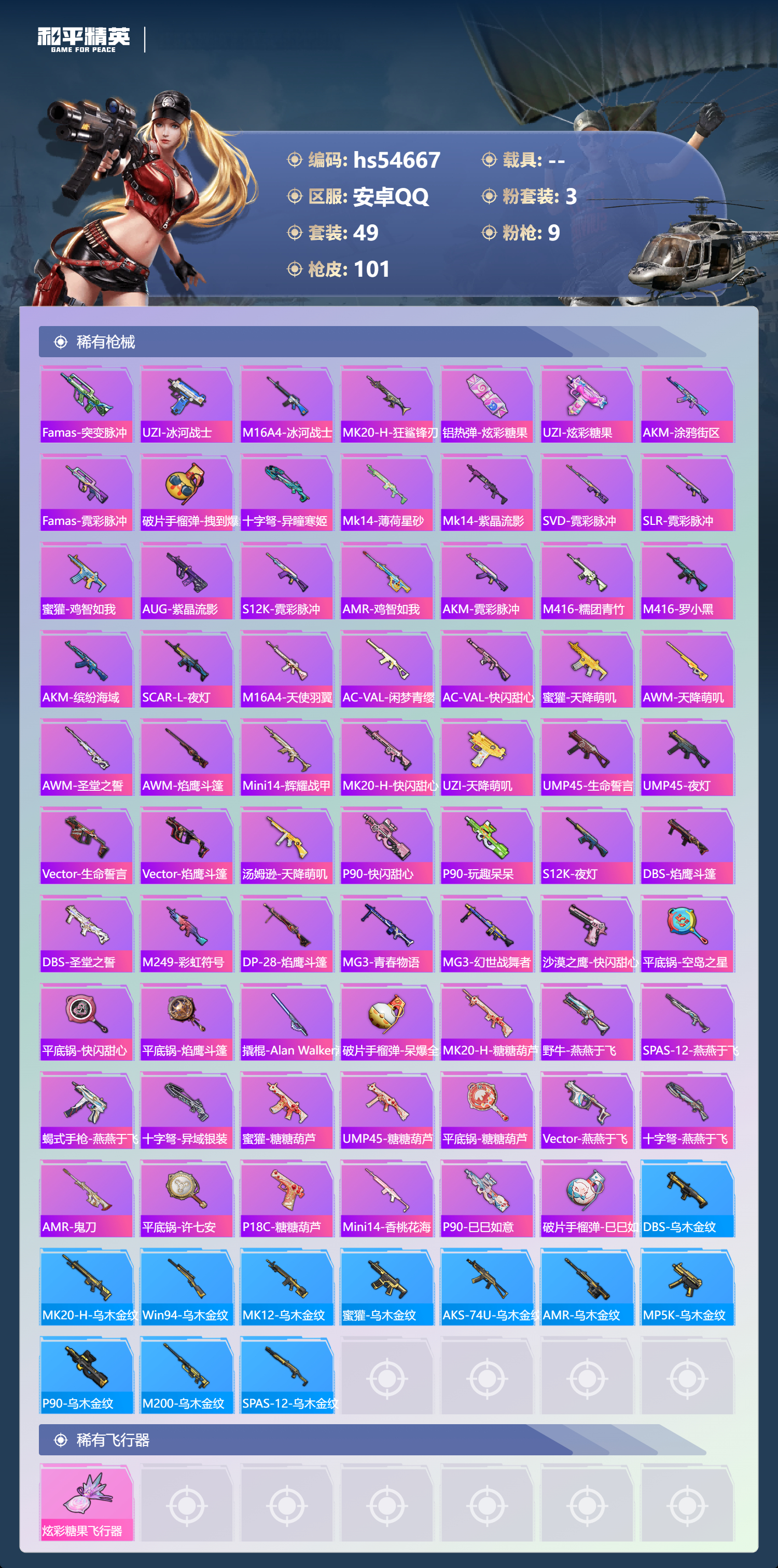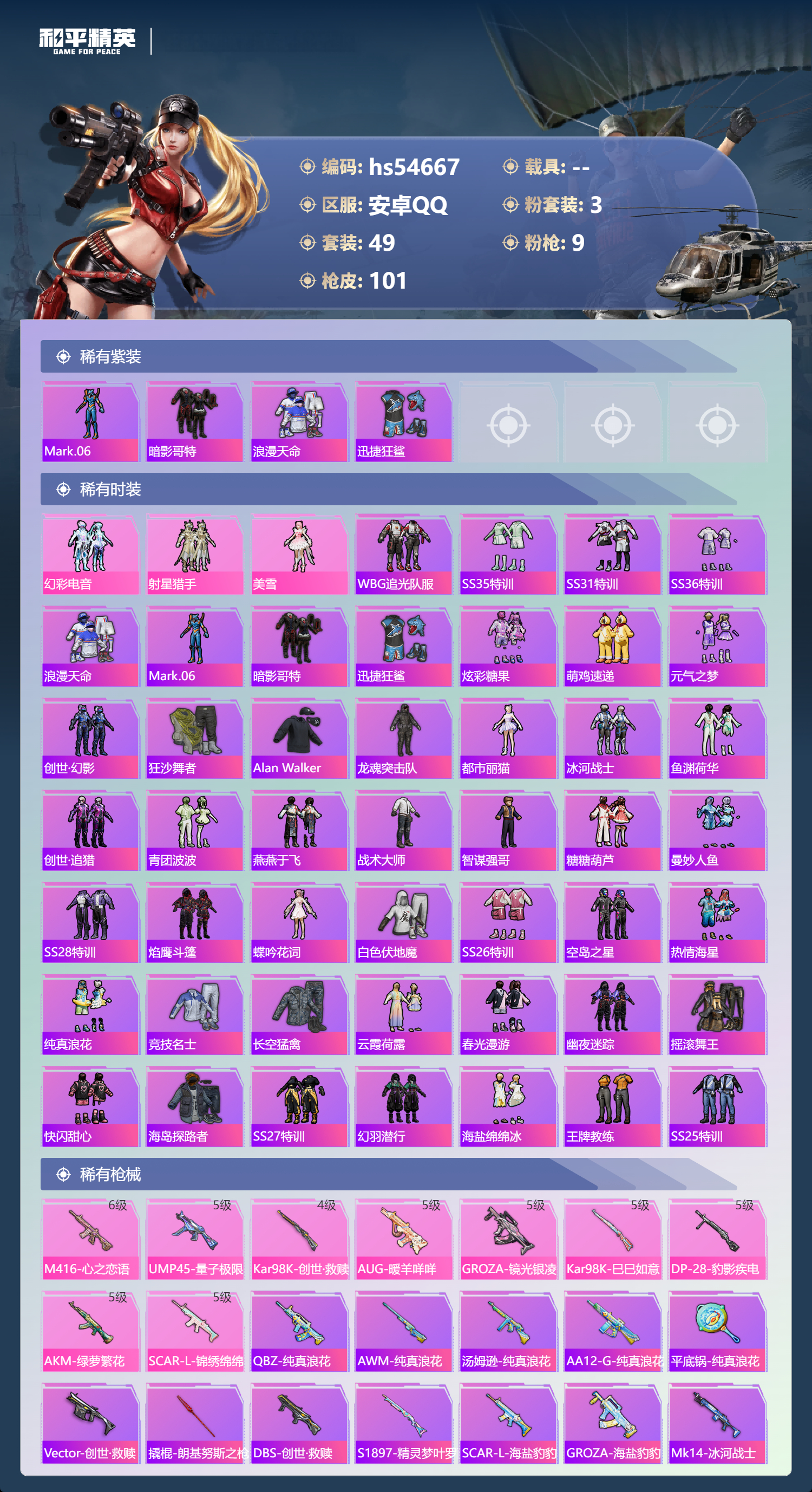 0载具-49套装-101呛皮-hs54667 安卓手q-3王牌印记-3粉装-9特效呛-29602热力值-49套装-101呛皮【3粉装】角色-美雪套装-幻彩电音套装-射星猎手【9特效呛】m416-心之恋语/6级kar98k-巳巳如意/5级akm-绿萝繁花/5级dp-28-豹影疾电/5级ump45-量子极限/5级groza-镜光银凌/5级kar98k-创世·救赎/4级aug-暖羊咩咩/5级scar-l-锦绣