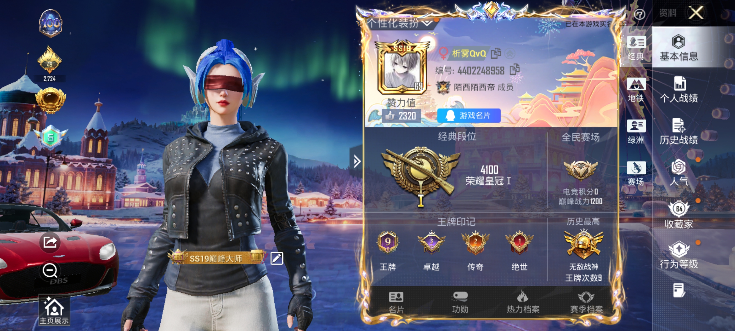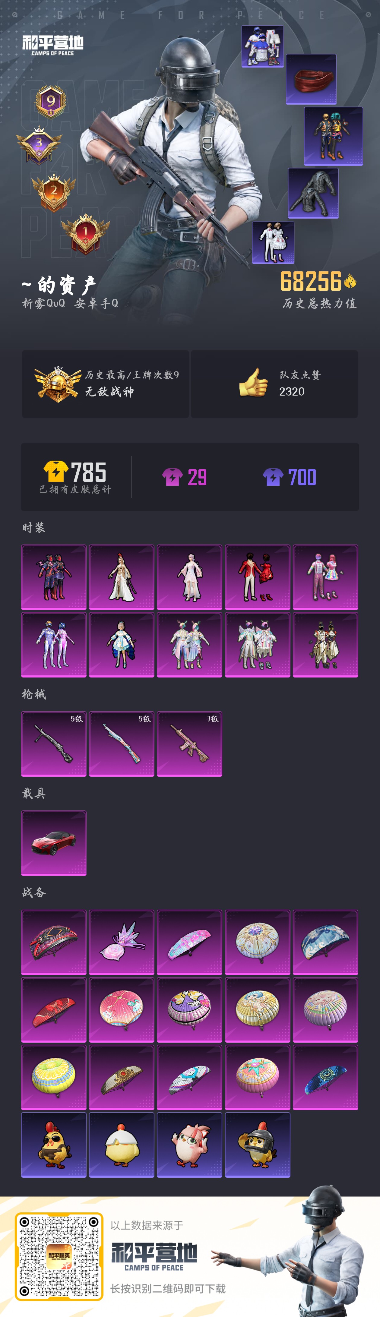 【和平精英】【txhp6209】10粉装,3特效呛,1载具,历史最高段位:无敌战神 王牌印记9次 热力值:68256,158套装,209呛械,280装备,111战备;套装:套装-天使彩虹糖,套装-梦幻火箭,套装-扶摇飞仙,套装-林间仙鹿,套装-山涧鹿灵,角色-洛天依,套装-星之彼岸,套装-苔丝玫瑰,角色-烟云彩露,角色-萨利娅,套装-特训学院,套装-黄色运动,套装-蓝色运动,套装-黄色伏地魔,套装-白色伏地魔,套装-黑色伏地魔,套装-竞技名士,套装-深蓝色名流,套装-酒红色名流,套装-湖蓝色名流,套装-黄色名流,套装-猛禽,套装-长空猛禽,套装-漫步者,套装-竞技勇士朋克,套装-冷焰舞者,套装-灼焰舞者,套装-都市猎人,套装-浪漫天命,套装-特战装甲,套装-战地督导,套装-特殊使命,套装-青春校园,套装-灰色格斗者,套装-鹰眼刺客,套装-冰冻风暴,套装-完美偶像,套装-人气偶像,套装-幻影武者,套装-街头潮人,套装-蓝彩潮人,套装-魅力单车,套装-绮丽涂鸦,套装-竞技达人朋克,套装-破晓战魂,套装-都市魅力,套装-热血青春,套装-幻世战舞者,套装-甜蜜菠萝,套装-暗影哥特,套装-深海小丑鱼,套装-青涩时光,套装-缤纷果语,套装-冰川特警,套装-元素星魂,套装-极速红龙,套装-格斗先锋,套装-麻辣教官,套装-小丑鱼,套装-破蛋小黄鸡,套装-疯狂小兔子,套装-北国孤狼,套装-ss6特训,套装-跃动心情,套装-ss7特训,套装-鹤鸣,套装-霓虹街区,套装-暗夜契约,套装-纯白誓言,套装-ss8特训,套装-众神之王,套装-智慧之神,套装-萌黄之夏,套装-隐空刺,套装-夏日音浪,套装-ss9特训,套装-神秘舞者,套装-丝绸行者,套装-辉星之火,套装-牛气满满,套装-青龙圣者,套装-玄武圣者,套装-骁骑迪迦,套装-原初圣火,套装-逆风勇士,套装-娴静芝兰,套装-战术大师,套装-ss12特训,套装-牛气冲天,套装-ss18特训,套装-银白舞王,套装-耀粉歌者,套装-治愈之星,套装-科技之星,套装-ss13特训,套装-ss14特训,套装-星梦畅游,套装-ss15特训,套装-ss16特训,套装-暗夜傀儡,套装-ss17特训,套装-瑞龙福将,套装-团圆交子,套装-炫光向阳,套装-福星高照,套装-虎虎生威吉莉,套装-缤纷焰火,套装-异彩先驱,套装-霓虹极客,套装-空投萌叽,套装-ss19特训,套装-飞驰魅影,套装-音速流光,套装-炫蓝之夏,套装-ss20特训,套装-圣诞惊喜,套装-ss21特训,套装-萌趣咩咩,套装-娇憨猪猪,套装-夏雨游龙,套装-梦幻奶油,套装-暗夜行者,套装-玉兔迎春,套装-ss22特训,套装-极光玫瑰,套装-艾菲玫瑰,套装-青玉碎影,套装-涂山之恋,套装-ss25特训,套装-焰鹰斗篷,套装-幻羽潜行,套装-ss27特训,套装-恋语绒绒,套装-ss28特训,角色-蝶吟花词,套装-海盐绵绵冰,套装-ss29特训,套装-ss30特训,套装-ss31特训,角色-海琴烟,套装-紫幽梦,套装-巳巳如意,套装-ss32特训,套装-蓝冰羽,套装-狂鲨锋刃,套装-炫彩糖果,玩偶服-喜羊羊,套装-元气之梦,套装-ss34特训,套装-擎苍青焰,套装-朱霞炽焰,套装-凌霄紫焰,套装-薄荷星砂,套装-ss35特训,套装-午间小调,套装-秘语星愿,套装-风迹短诗,套装-ss36特训;呛皮:g36c-镜域双华,g36c-乌木金纹,蜜獾-娇憨猪猪,蜜獾-垂柳戏鸭,蜜獾-风迹短诗,蜜獾-乌木金纹,akm-灼热熔岩,akm-生命誓言,akm-影袭,akm-破晓战魂,akm-霓虹街区,akm-夜灯,akm-四圣焕新,akm-涂鸦街区,akm-星之彼岸,akm-彩虹符号,akm-萌趣颜团子,akm-虎虎生威,akm-乌木金纹,aug-耀粉歌者,aug-异域银装,aug-紫晶流影,mk47-林间仙鹿,mk47-乌木金纹,mk47-风迹短诗,ac-val-乌木金纹,ac-val-天降萌叽,groza-影袭,groza-治愈之星,groza-林间仙鹿,groza-彩虹符号,groza-异彩先驱,groza-乌木金纹,scar-l-红色方程式,scar-l-黄金龙骨,scar-l-扶摇飞仙,scar-l-炫彩节奏,scar-l-玉兔迎春,scar-l-海盐豹豹,scar-l-乌木金纹,q-神秘黑猫,q-原初圣火,q-彩虹符号,q-洛神天依,q-飞驰魅影,q-乌木金纹,7级m416-心之恋语,m416-夜灯,m416-蓝色火焰,m416-红色方程式,m416-暗夜行者,m762-牛气冲天,m762-镭射皇者,m762-瑞龙福将,m762-天降萌叽,m762-乌木金纹,m16a4-蓝色火焰,m16a4-夜灯,m16a4-幻世战舞者,arx-凌霄紫焰,5级kar98k-巳巳如意,kar98k-影袭,kar98k-彩虹符号,kar98k-炫彩节奏,kar98k-飞驰魅影,kar98k-乌木金纹,m24-影袭,m24-众神之王,m24-治愈之星,m24-乌木金纹,amr-暗夜行者,amr-乌木金纹,awm-垂柳戏鸭,awm-天降萌叽,awm-焰鹰斗篷,awm-乌木金纹,win94-瑞龙福将,win94-乌木金纹,m200-乌木金纹,莫辛纳甘-风迹短诗,vss-粉色回忆,vss-镭射皇者,vss-星之彼岸,vss-彩虹符号,vss-乌木金纹,mk14-扶摇飞仙,mk14-治愈之星,mk14-乌木金纹,mk14-紫幽梦,mk14-薄荷星砂,slr-众神之王,slr-四圣焕新,slr-娇憨猪猪,sks-夜灯,sks-心之恋语,sks-炫彩节奏,sks-苔丝玫瑰,mk12-风迹短诗,mk12-乌木金纹,mini14-梦幻火箭,mini14-原初圣火,mini14-炫彩节奏,mini14-马卡龙,mini14-林间仙鹿,mini14-异彩先驱,mini14-旋转彩虹,mk20-h-乌木金纹,qbu-锦绣火鲤,vect-生命誓言,vect-彩虹符号,vect-治愈之星,vect-焰鹰斗篷,vect-乌木金纹,uzi-红色方程式,uzi-影袭,uzi-众神之王,uzi-炫彩节奏,uzi-娇憨猪猪,uzi-炫彩糖果,ump45-夜灯,ump45-生命誓言,ump45-乌木金纹,p90-飞驰魅影,p90-玩趣呆呆,p90-巳巳如意,p90-乌木金纹,mp5k-甜蜜誓约,mp5k-众神之王,mp5k-异彩先驱,mp5k-乌木金纹,汤姆逊-耀粉歌者,汤姆逊-异彩先驱,汤姆逊-天降萌叽,汤姆逊-乌木金纹,aks-74u-乌木金纹,js9-凌霄紫焰,野牛-扶摇飞仙,野牛-乌木金纹,spas-12-太空嘟嘟,spas-12-苔丝玫瑰,spas-12-狂鲨锋刃,spas-12-乌木金纹,dbs-彩虹符号,dbs-焰鹰斗篷,dbs-风迹短诗,dbs-乌木金纹,s1897-镭射皇者,s1897-炫彩节奏,s1897-碧影闪光,s1897-飞