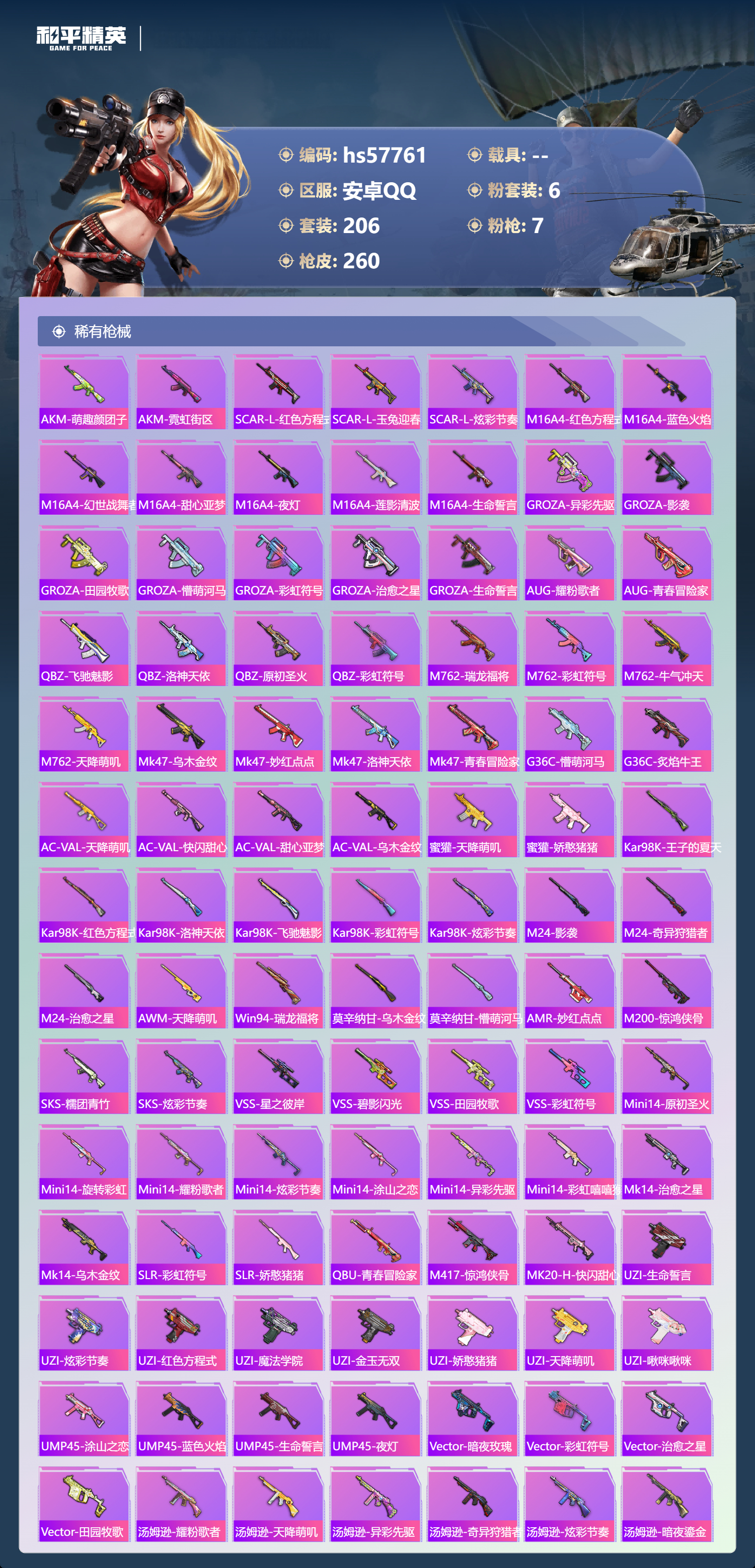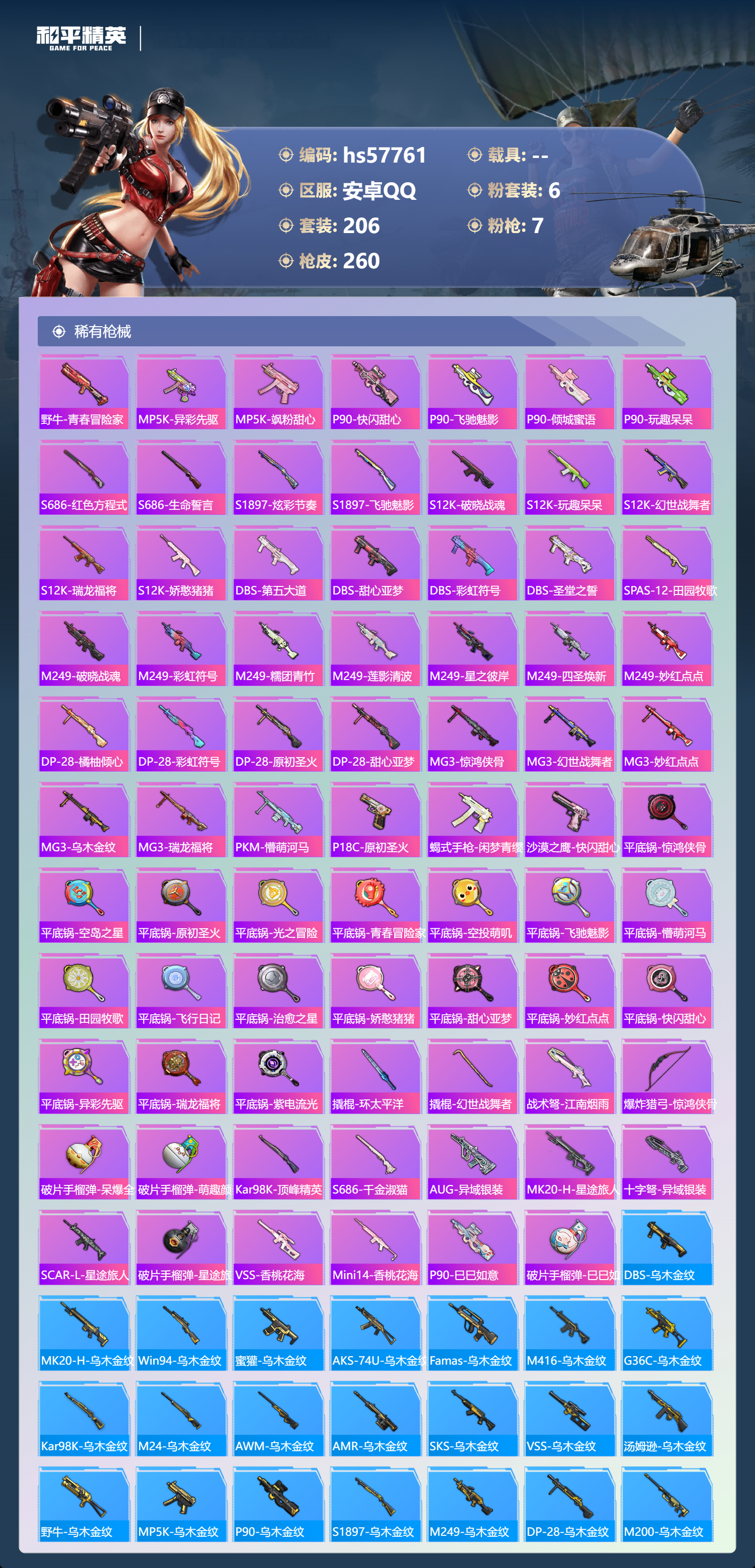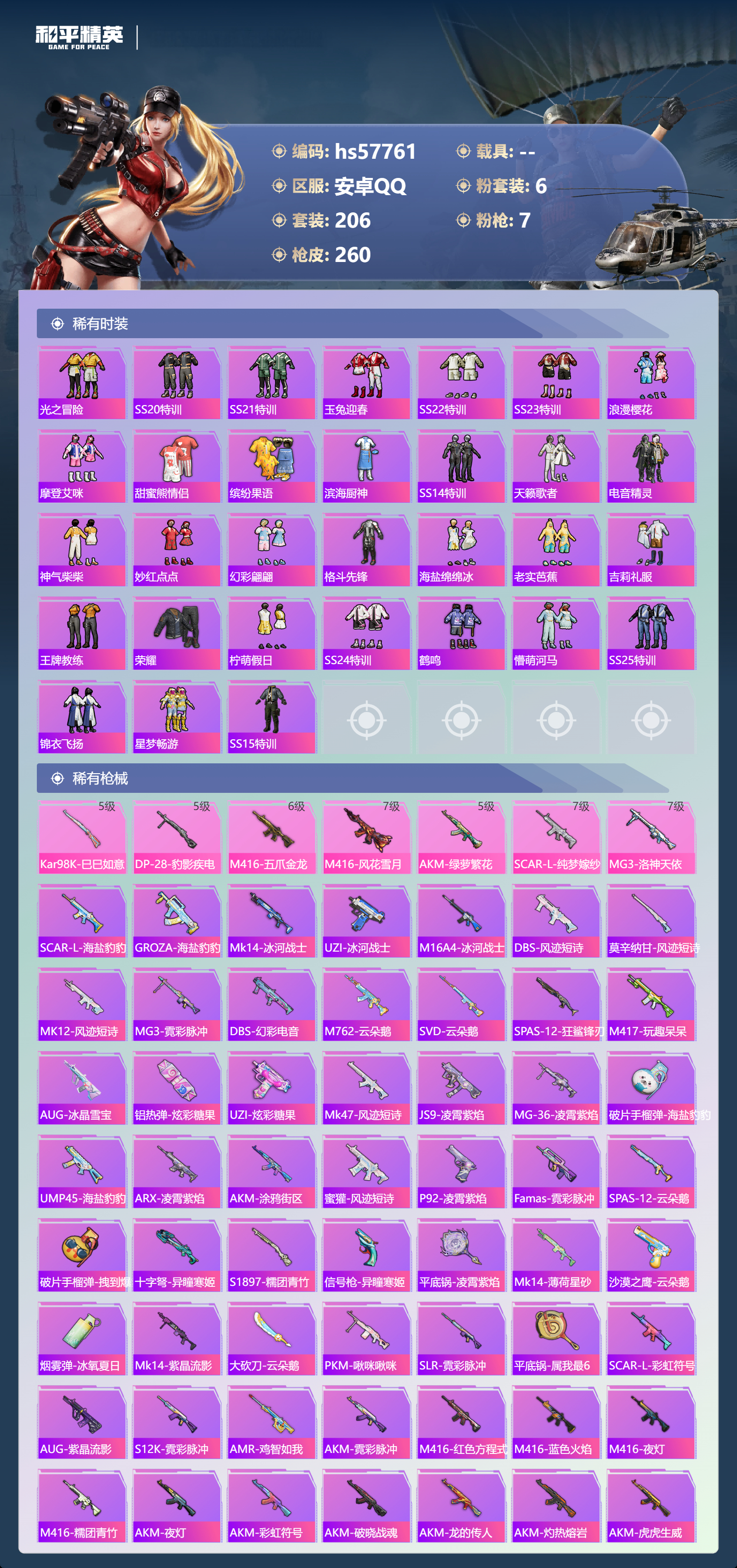 hs57761 安卓手q-25王牌印记-6粉装-7特效呛-84196热力值-206套装-260呛皮-8卓越印记-5传奇印记【6粉装】套装-暖暖奶龙套装-筑梦精灵角色-异瞳寒姬套装-未来歌姬套装-蓝莓炮弹角色-冷漠罗丽【7特效呛】akm-绿萝繁花/5级m416-风花雪月/7级m416-五爪金龙/6级mg3-洛神天依/7级scar-l-纯梦嫁纱/7级kar98k-巳巳如意/5级