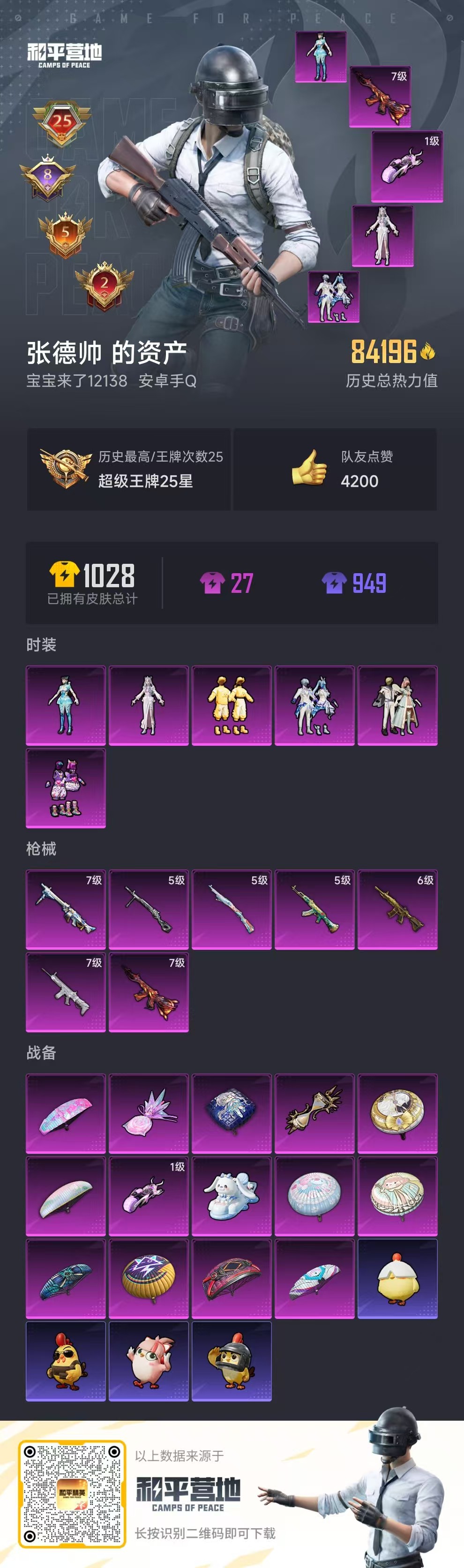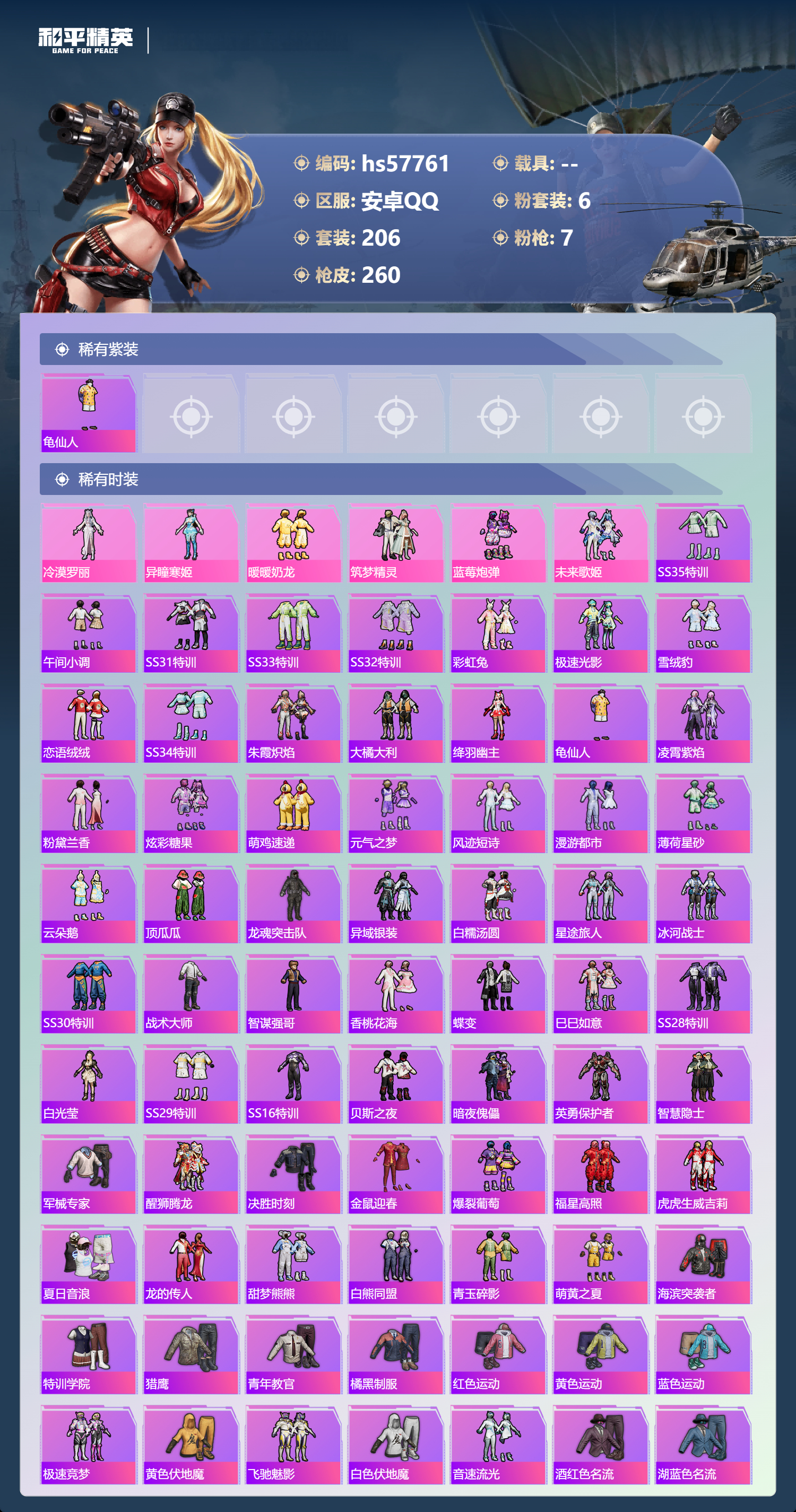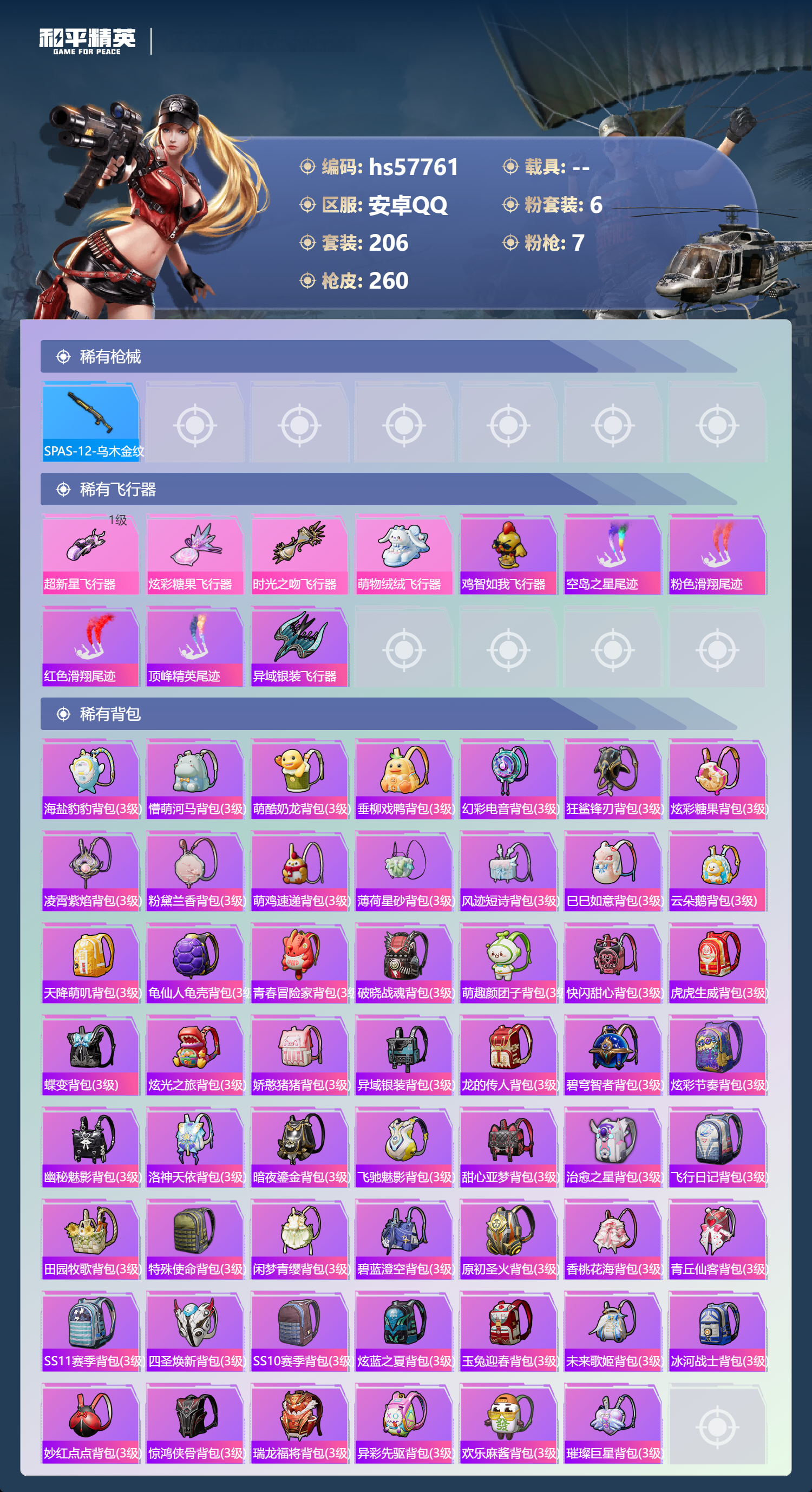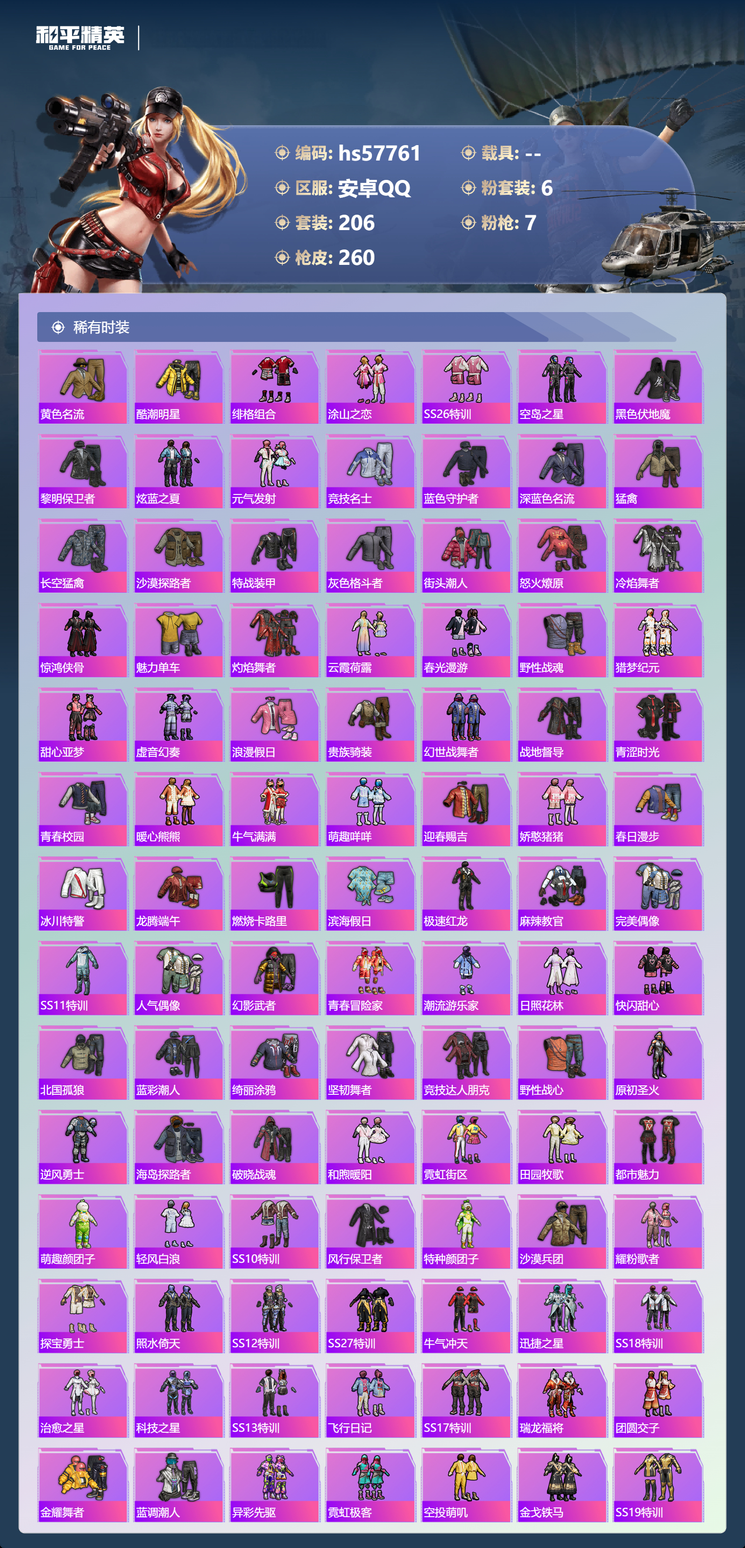 hs57761 安卓手q-25王牌印记-6粉装-7特效呛-84196热力值-206套装-260呛皮-8卓越印记-5传奇印记【6粉装】套装-暖暖奶龙套装-筑梦精灵角色-异瞳寒姬套装-未来歌姬套装-蓝莓炮弹角色-冷漠罗丽【7特效呛】akm-绿萝繁花/5级m416-风花雪月/7级m416-五爪金龙/6级mg3-洛神天依/7级scar-l-纯梦嫁纱/7级kar98k-巳巳如意/5级