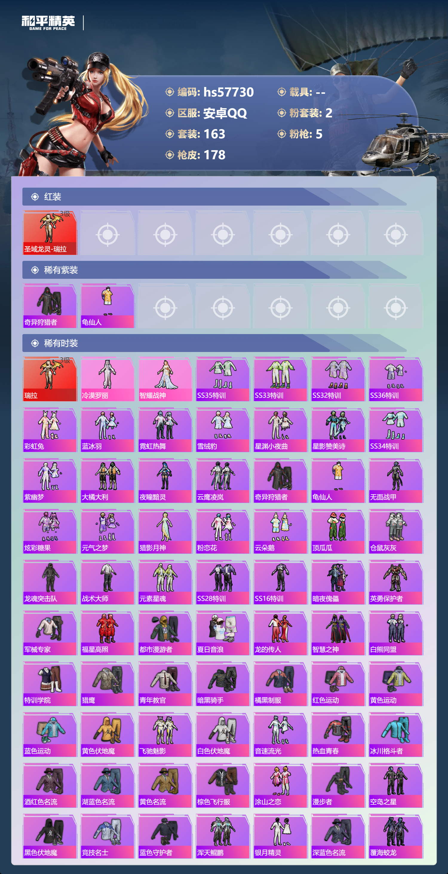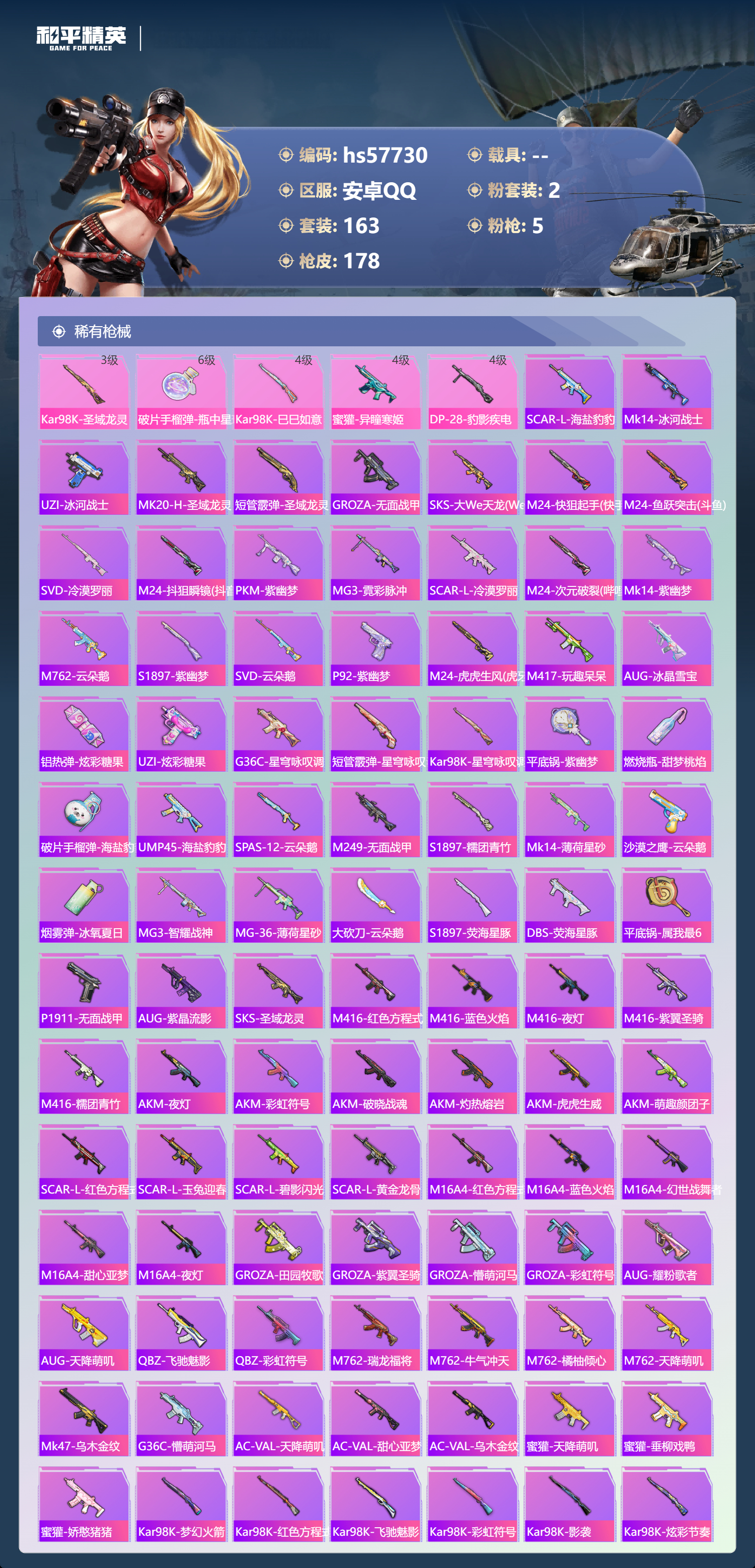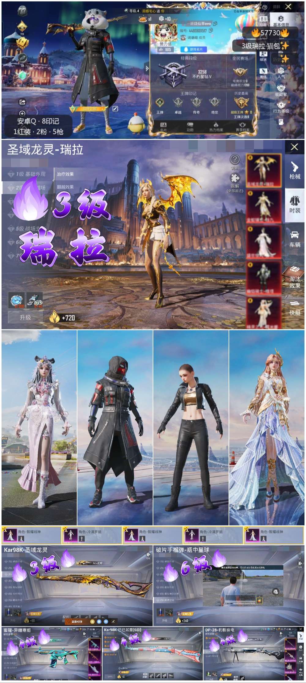 hs57730 安卓手q-8王牌印记-1红装-2粉装-5特效呛-58977热力值-163套装-178呛皮【1红装】圣域龙灵-瑞拉/3级【2粉装】角色-智耀战神角色-冷漠罗丽【5特效呛】dp-28-豹影疾电/4级蜜獾-异瞳寒姬/4级kar98k-圣域龙灵/3级kar98k-巳巳如意/4级破片手留单-瓶中星球/6级【2稀有紫装】奇异狩猎者龟仙人【163稀有时装】瑞拉/3级冷漠罗