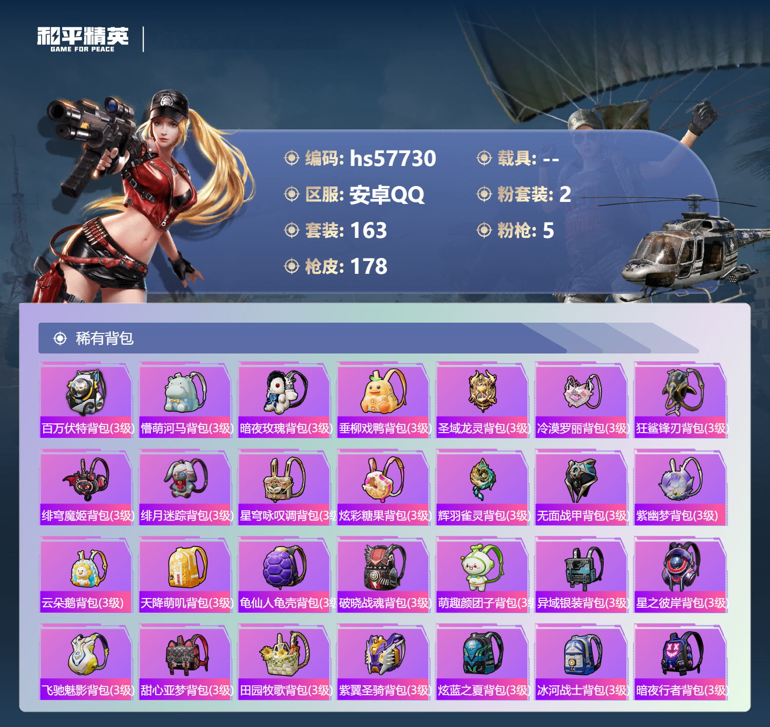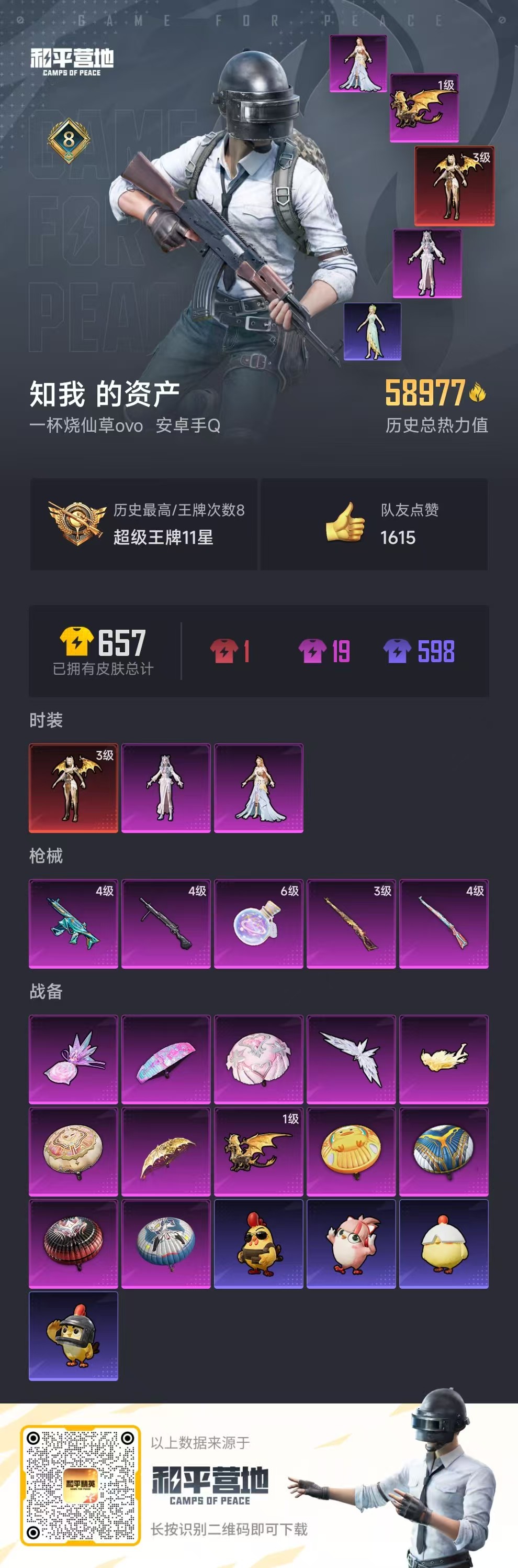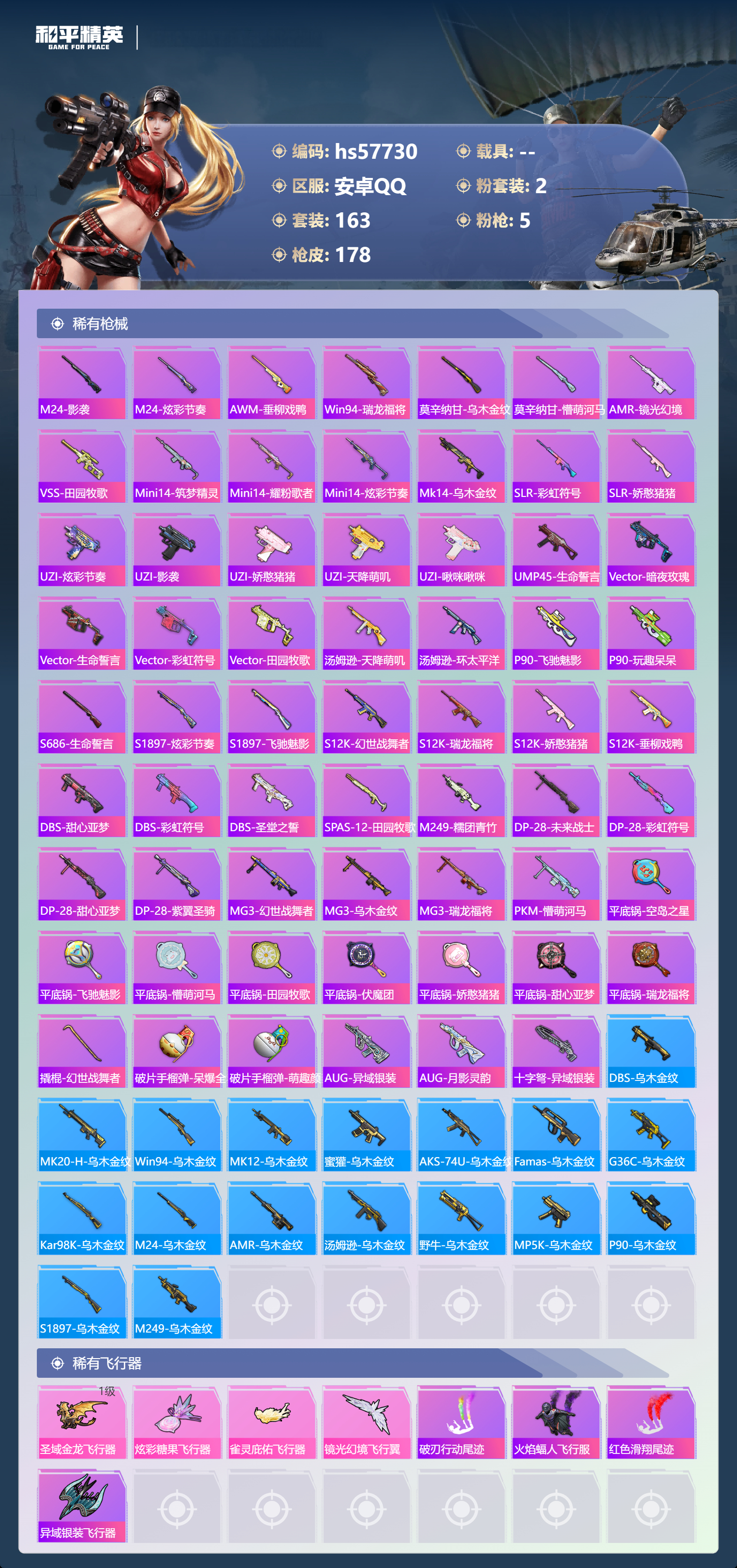 hs57730 安卓手q-8王牌印记-1红装-2粉装-5特效呛-58977热力值-163套装-178呛皮【1红装】圣域龙灵-瑞拉/3级【2粉装】角色-智耀战神角色-冷漠罗丽【5特效呛】dp-28-豹影疾电/4级蜜獾-异瞳寒姬/4级kar98k-圣域龙灵/3级kar98k-巳巳如意/4级破片手留单-瓶中星球/6级【2稀有紫装】奇异狩猎者龟仙人【163稀有时装】瑞拉/3级冷漠罗