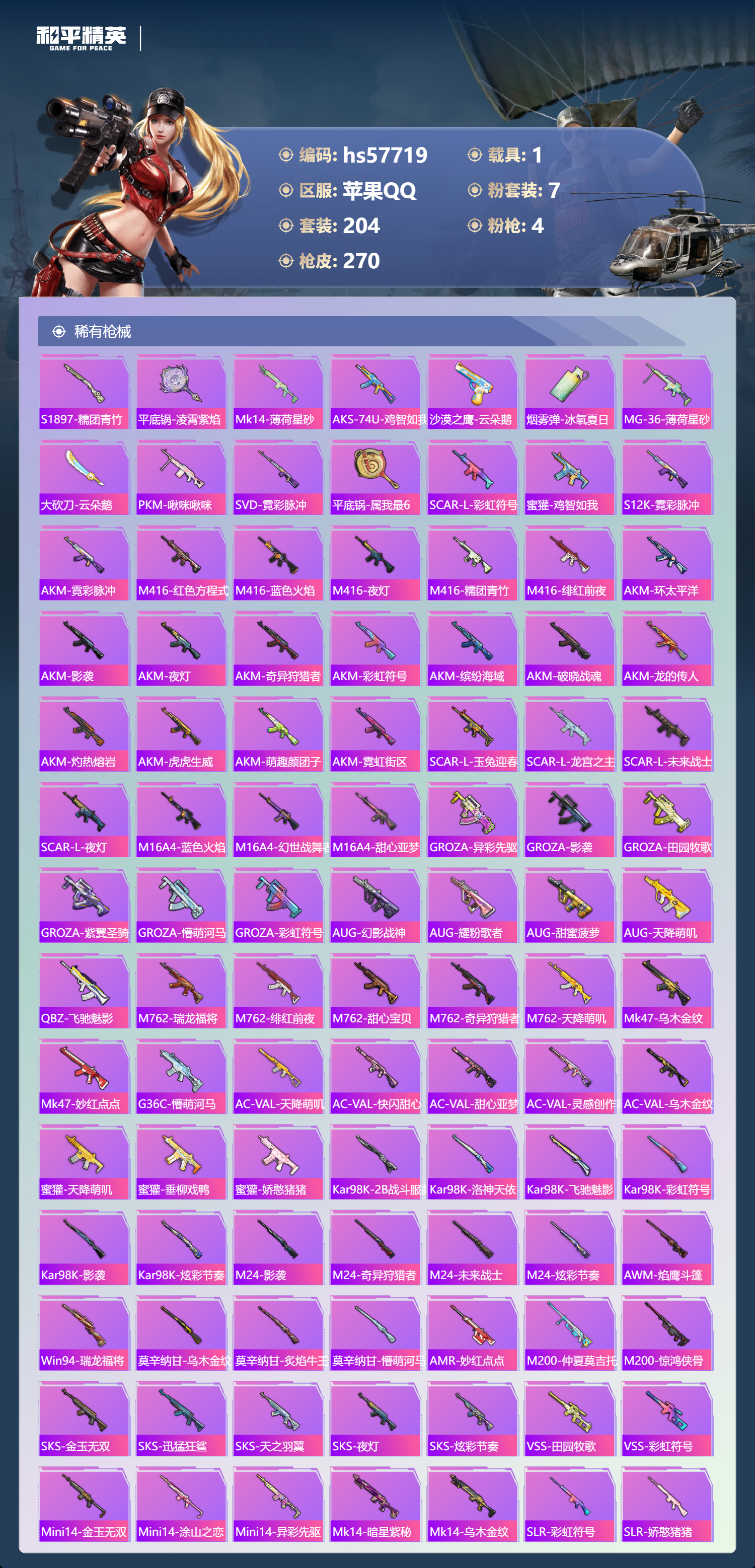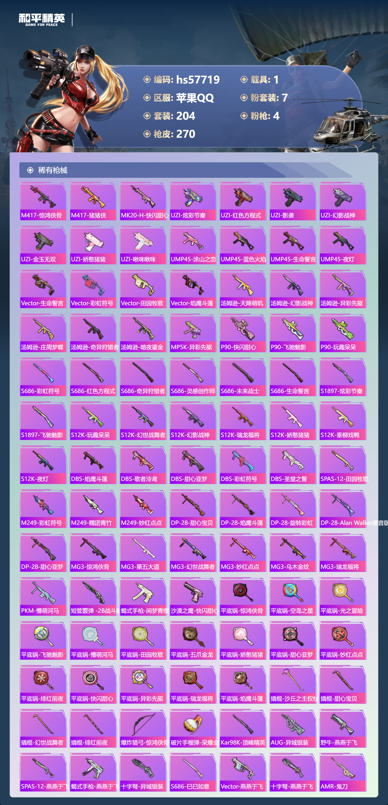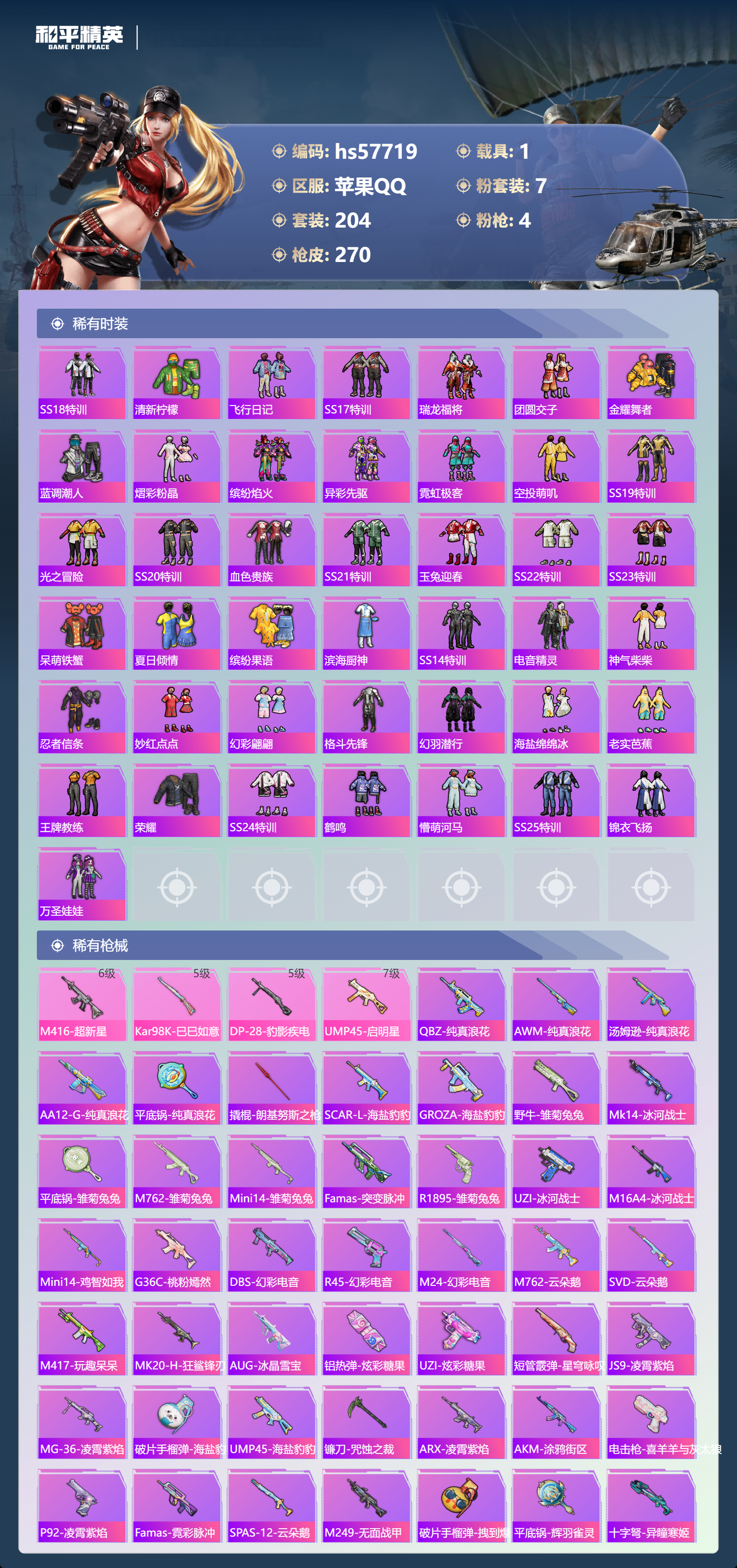 1载具-204套装-270呛皮-hs57719 苹果手q-14王牌印记-7粉装-4特效呛-1载具-86457热力值-204套装-270呛皮-1卓越印记【7粉装】套装-天使彩虹糖套装-天禅智恒角色-幻星舰长套装-垂柳戏鸭角色-智耀战神套装-宝贝奶油派套装-幻影战神【4特效呛】kar98k-巳巳如意/5级m416-超新星/6级ump45-启明星/7级dp-28-豹影疾电/5级【13稀有紫装】都市猎人派对舞王