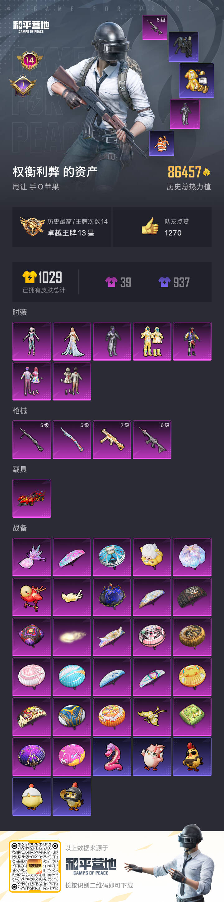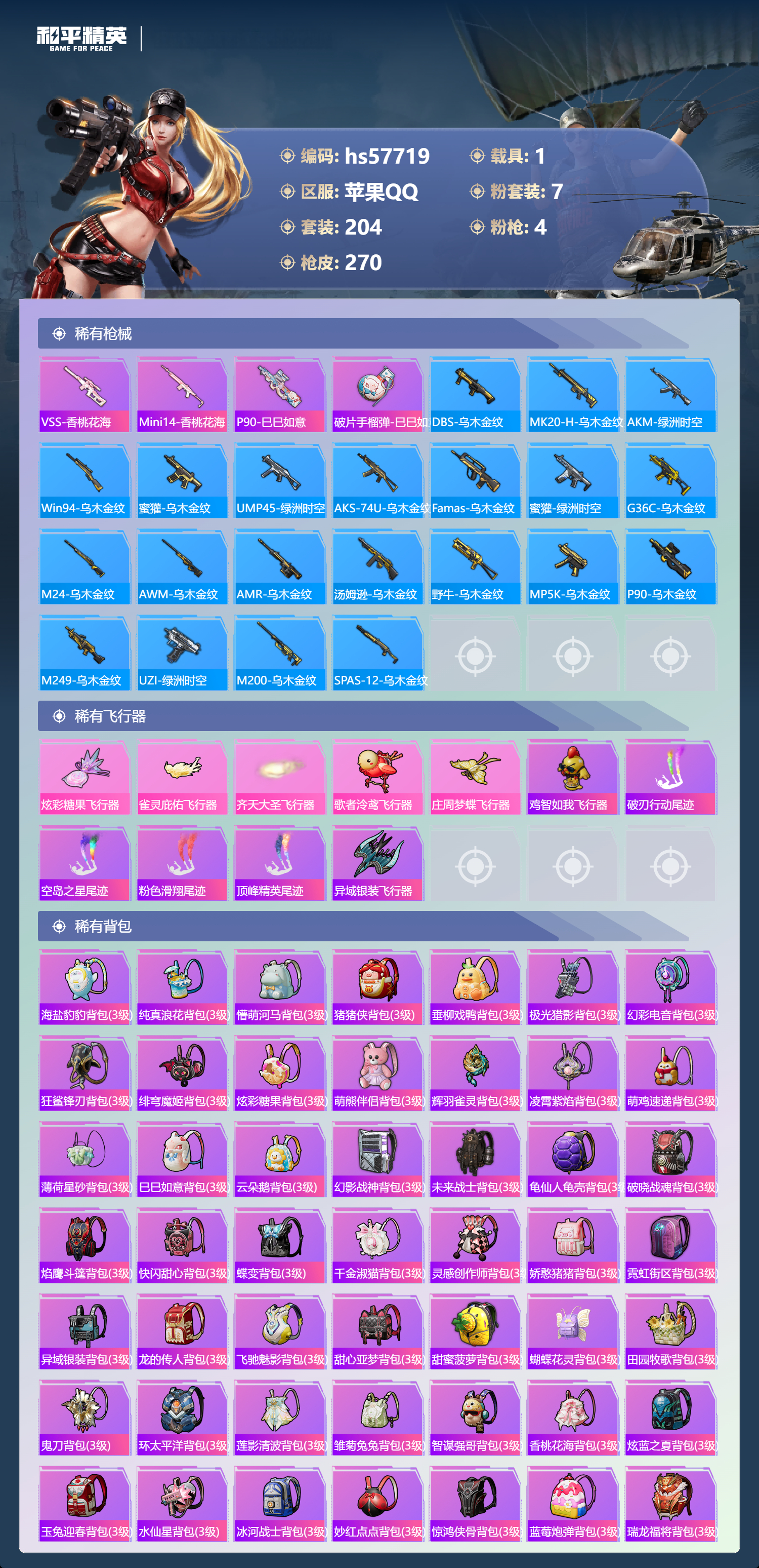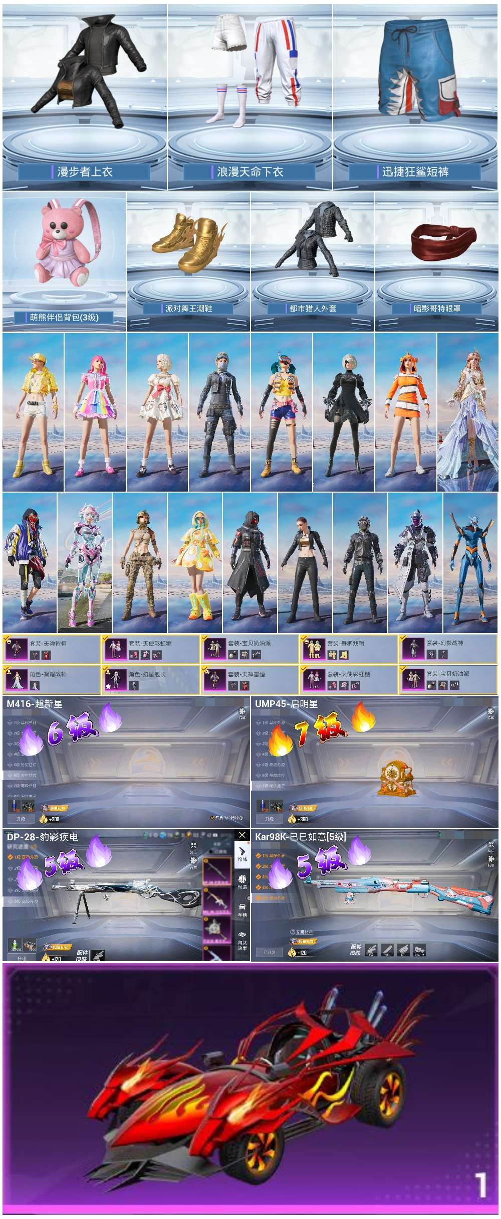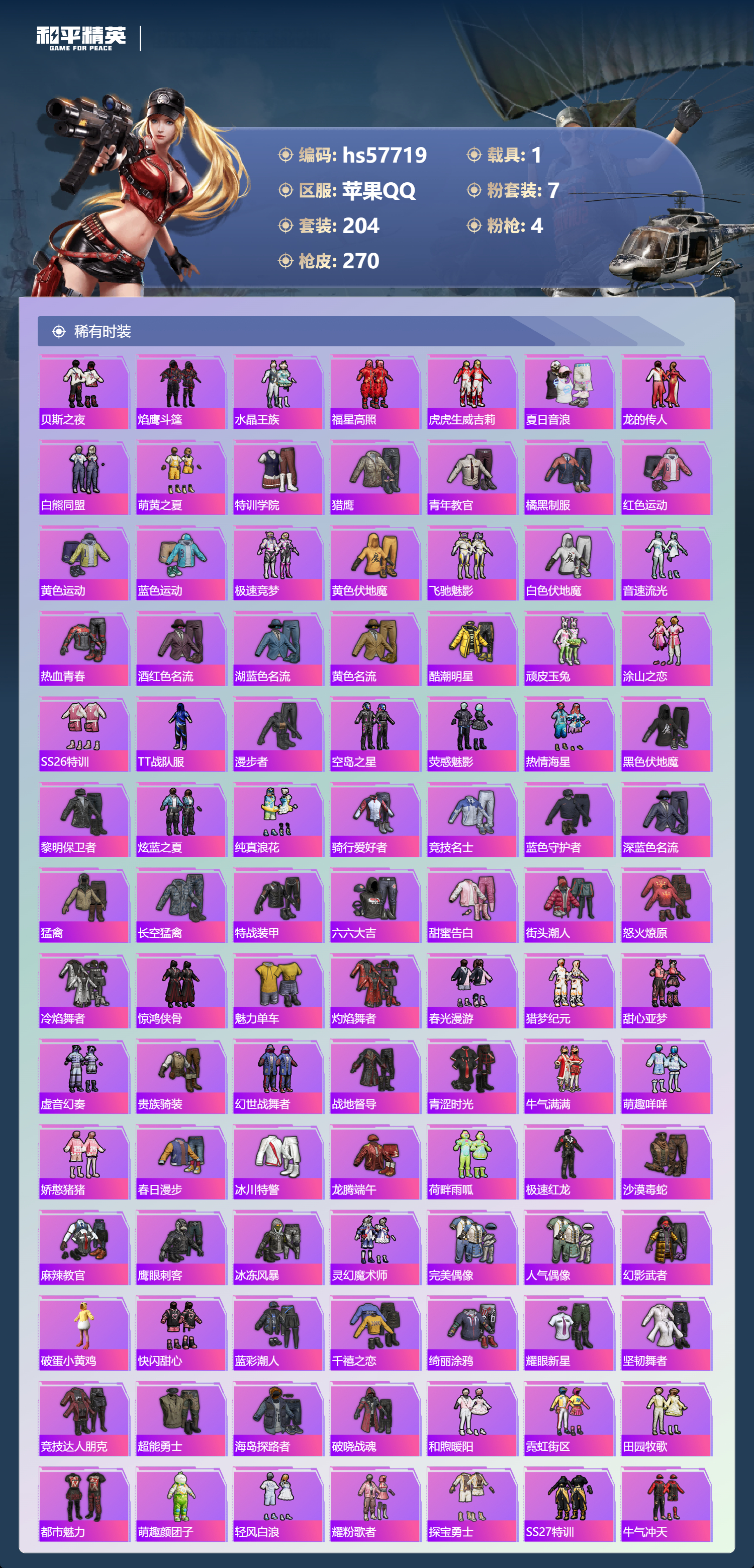 1载具-204套装-270呛皮-hs57719 苹果手q-14王牌印记-7粉装-4特效呛-1载具-86457热力值-204套装-270呛皮-1卓越印记【7粉装】套装-天使彩虹糖套装-天禅智恒角色-幻星舰长套装-垂柳戏鸭角色-智耀战神套装-宝贝奶油派套装-幻影战神【4特效呛】kar98k-巳巳如意/5级m416-超新星/6级ump45-启明星/7级dp-28-豹影疾电/5级【13稀有紫装】都市猎人派对舞王