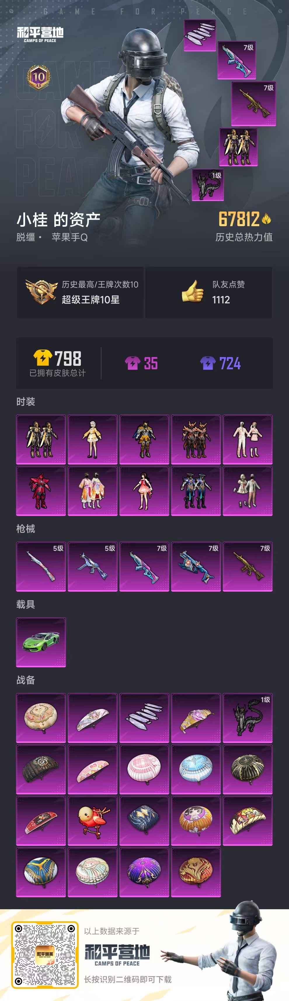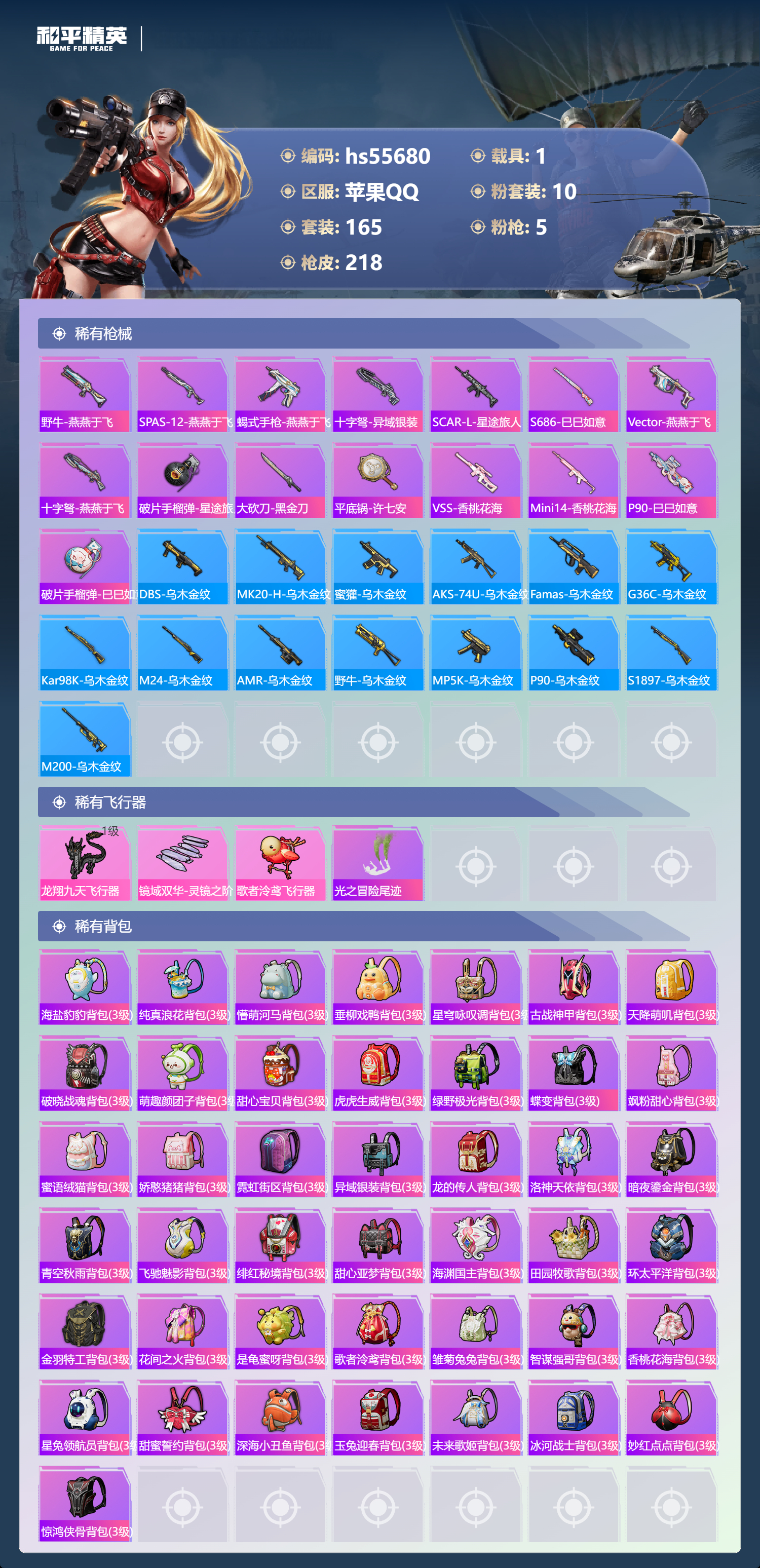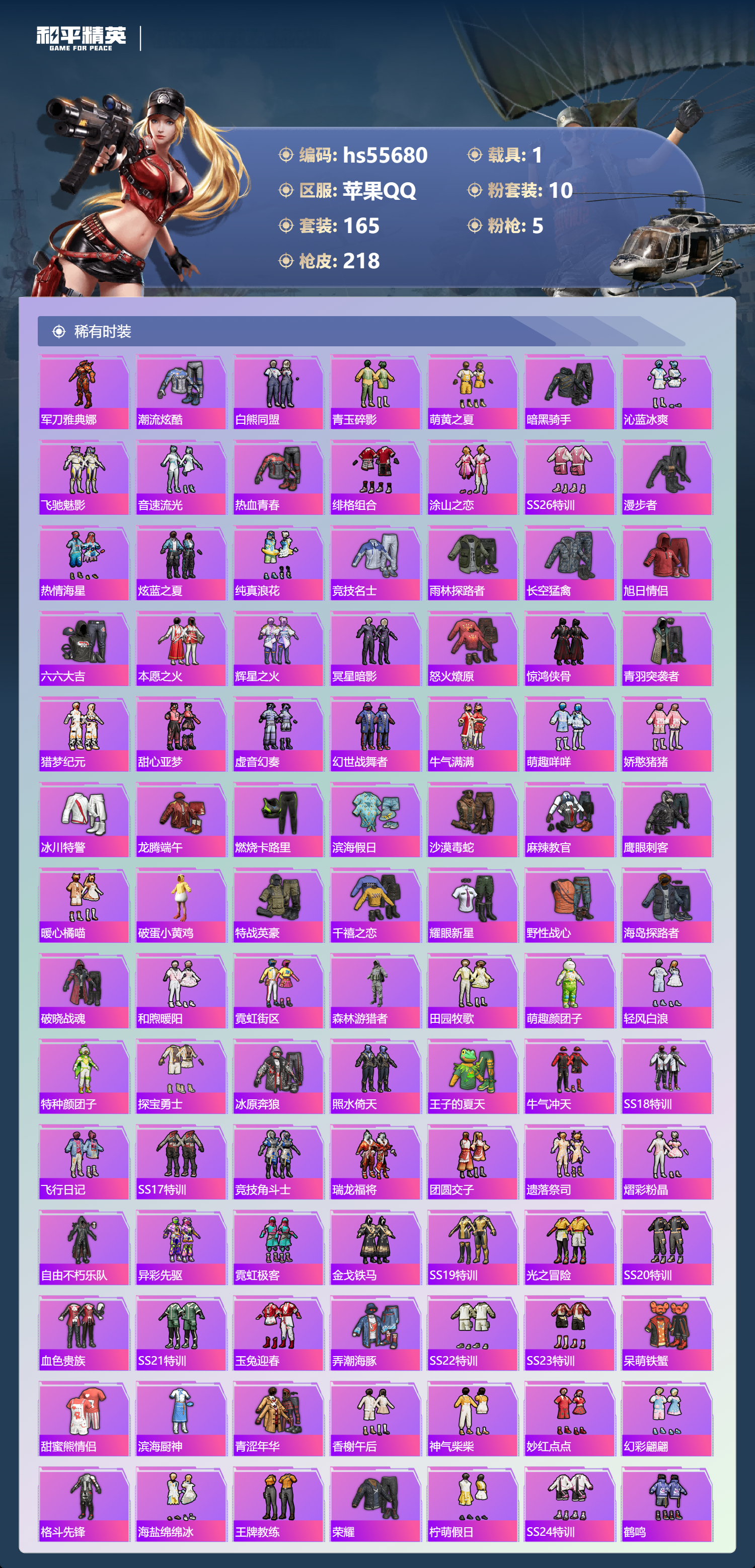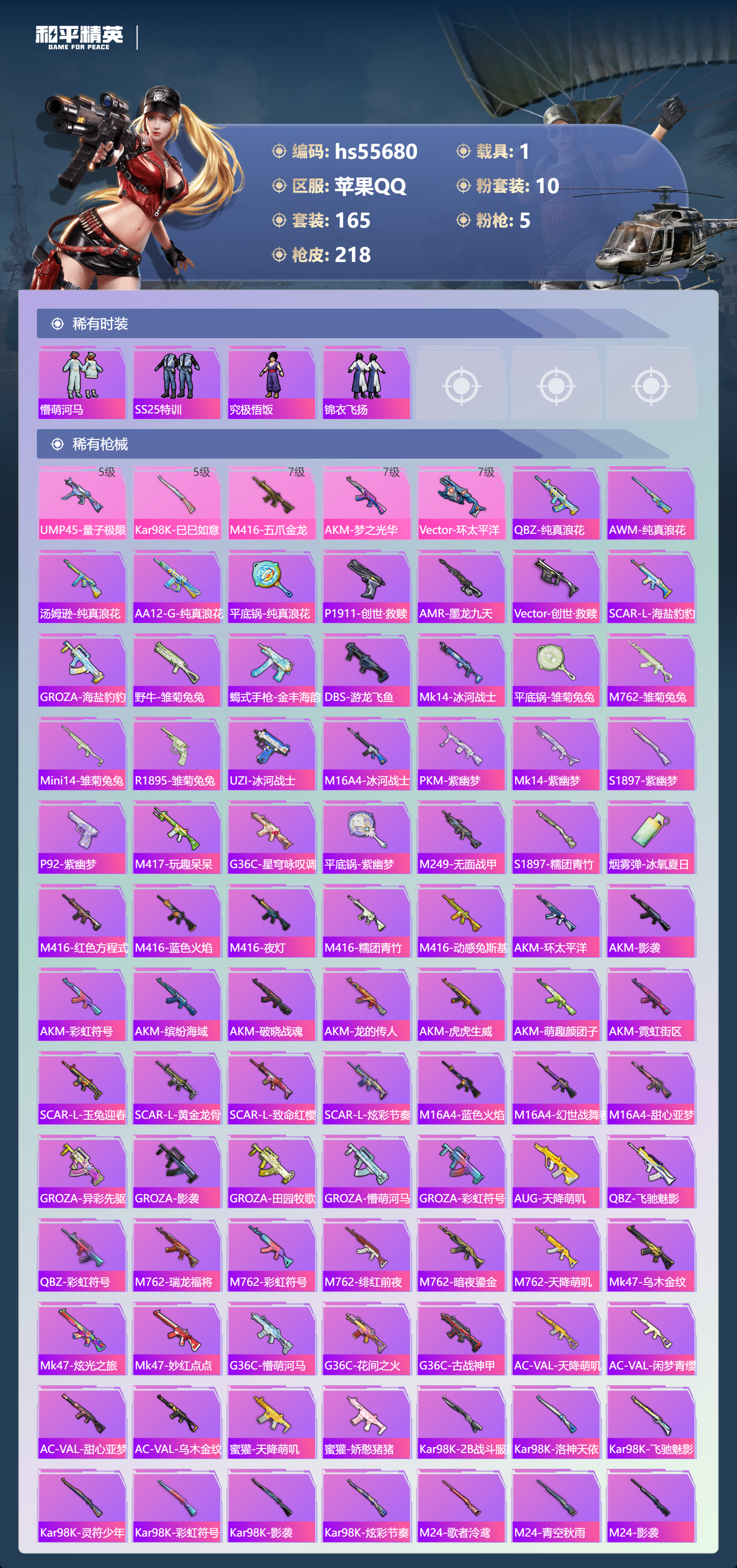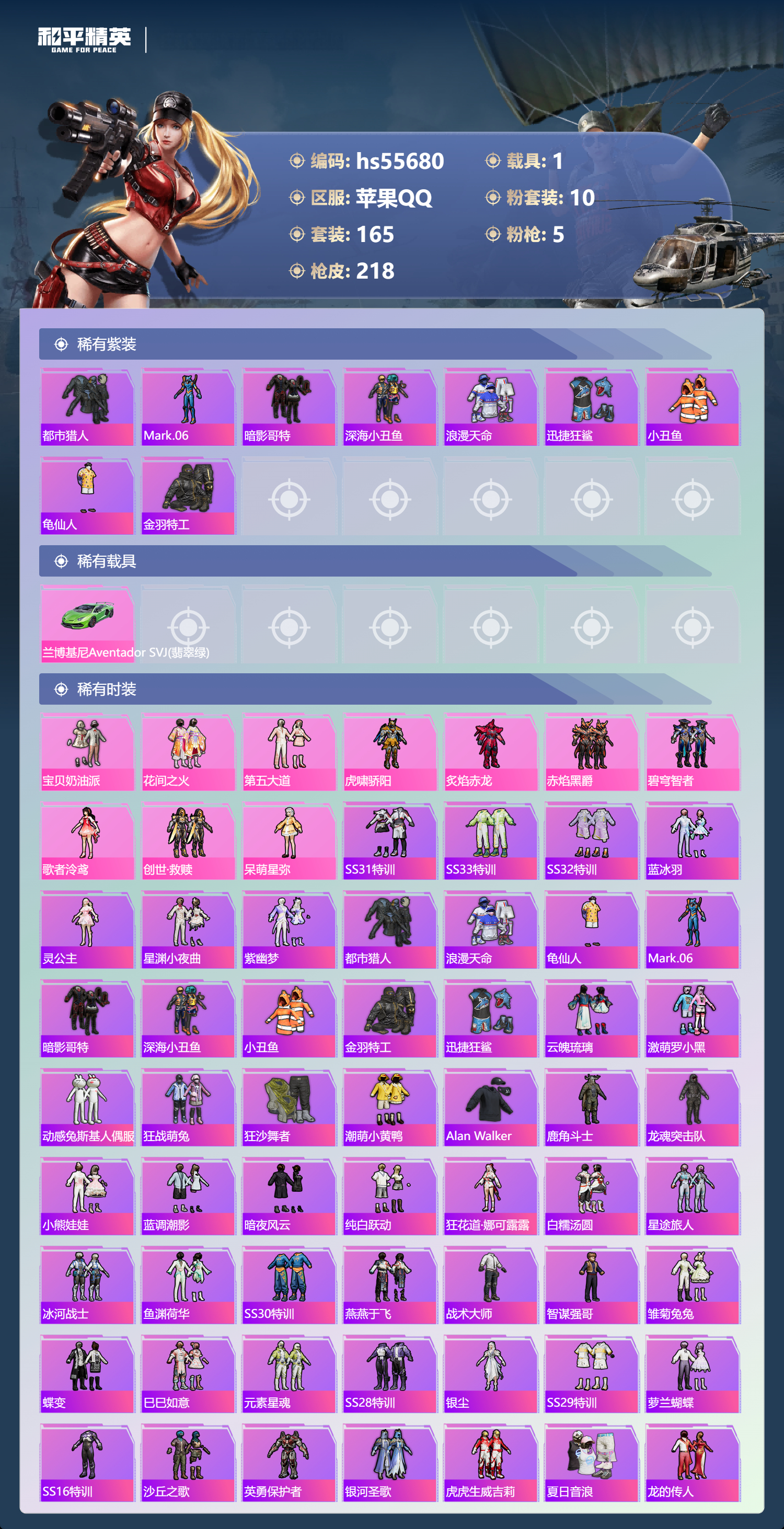 hs55680 苹果手q-10王牌印记-10粉装-5特效呛-1载具-67812热力值-165套装-218呛皮【10粉装】套装-碧穹智者角色-歌者泠鸢套装-创世·救赎套装-第五大道角色-呆萌星弥套装-赤焰黑爵套装-炙焰赤龙套装-虎啸骄阳套装-宝贝奶油派套装-花间之火【5特效呛】akm-梦之光华/7级ump45-量子极限/5级vect-环太平洋/7级m416-五爪金龙/