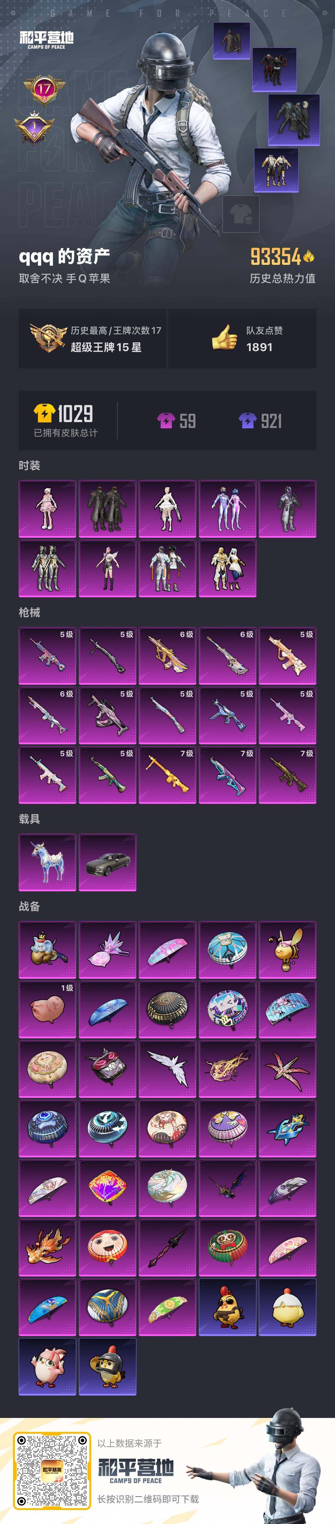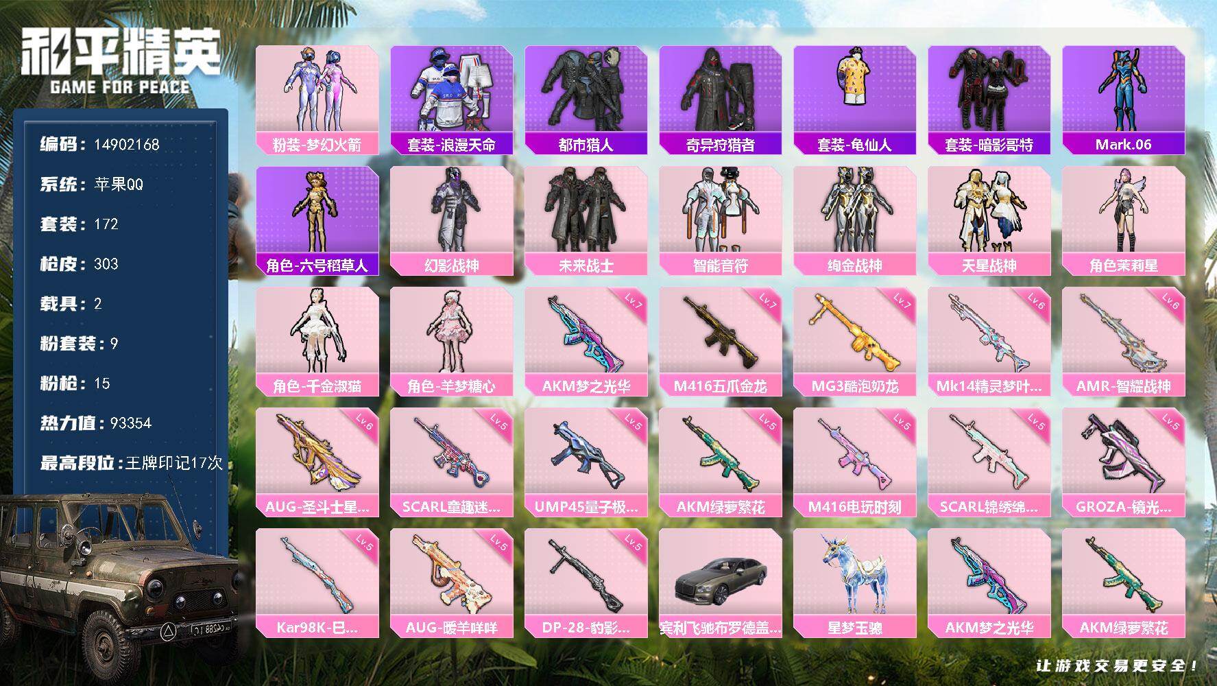[15604922]das9061 可二次 苹果q-6稀有2载具9粉装15特效呛13热门172套装303呛皮 93354热力值 17印记 历史超级王牌15星 奇异狩猎者 都市猎人 浪漫天命 梦幻火箭 m416-五爪金龙 7级 鹰眼刺客 暗影哥特 【6稀有】 奇异狩猎者 m416-黄金龙骨 awm-黄金龙骨 akm-百万伏特 都市猎人 浪漫天命 【2载具】 宾利飞驰布罗德盖棕双色 星梦玉骢 【9粉装】 梦幻火箭 茉莉星 千金淑猫 天星战神 羊梦糖心 幻影战神 智能音符 未来战士 绚金战神 【15特效呛】 m416-五爪金龙 7级 scar-l-锦绣绵绵 5级 m416-电玩时刻 5级 akm-绿萝繁花 5级 kar98k-巳巳如意 5级 mg3-酷泡奶龙 7级 dp-28-豹影疾电 5级 aug-圣斗士星矢 6级 aug-暖羊咩咩 5级 ump45-量子极限 5级 mk14-精灵梦叶罗丽 6级 amr-智耀战神 6级 groza-镜光银凌 5级 scar-l-童趣迷兔 5级 akm-梦之光华 7级 【13热门】 mark.06 龟仙人 六号稻草人 鹰眼刺客 vs追光队服 jde战队服 暗影哥特 水银刺客 漫步者 破蛋小黄鸡 英勇保护者 m24-奇异狩猎者 s686-奇异狩猎者 【4飞行器】 繁龙极客飞行器 祥瑞锦鲤飞行器 夜幕颂歌飞行器 镜光幻境飞行翼 【4头盔】 梦幻火箭头盔 幻影战神头盔 深海小丑鱼头盔 金羽特工头盔 【3背包】 幻影战神背包 深海小丑鱼背包 金羽特工背包