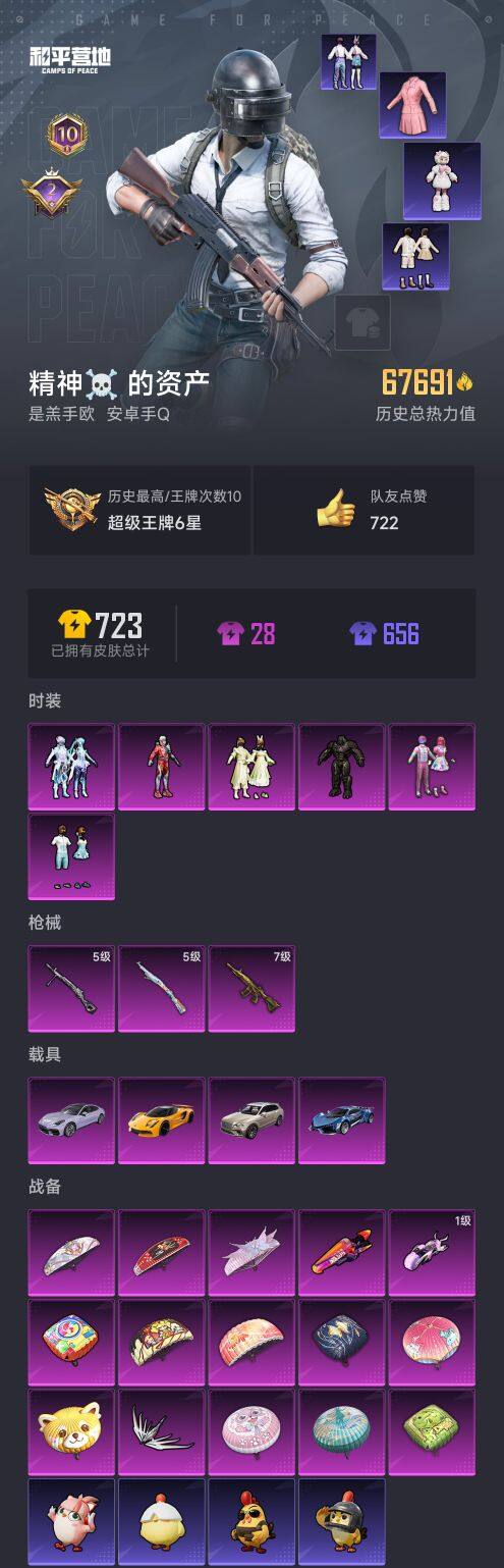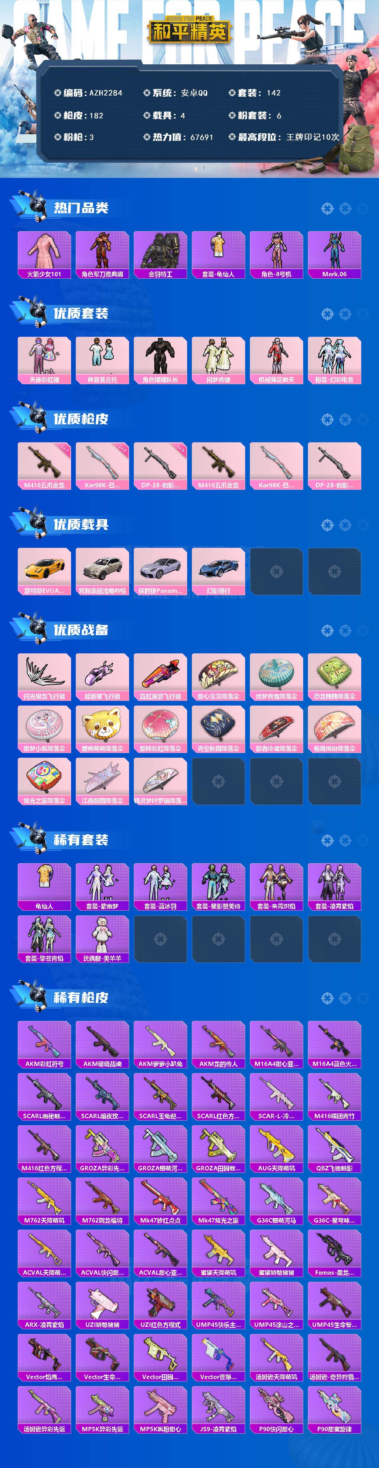 4载具-142套装-182呛皮-安卓 手q【老101 天使彩虹糖 仲夏莫吉托 满级五爪金龙m416 4载具】6粉装-3特效呛-4载具-3粉色飞行器-67691热力值-10王牌印记-142套装-182呛皮 【热门品类】:套装-火箭少女101,角色-军刀雅典娜,套装-金羽特工,套装-龟仙人,角色-8号机,角色-mark.06 【粉色套装】:粉装-天使彩虹糖,粉装-仲夏莫吉托,角色-猩猩队长,粉装-闲梦青缨,粉装-机械师花傲天,粉