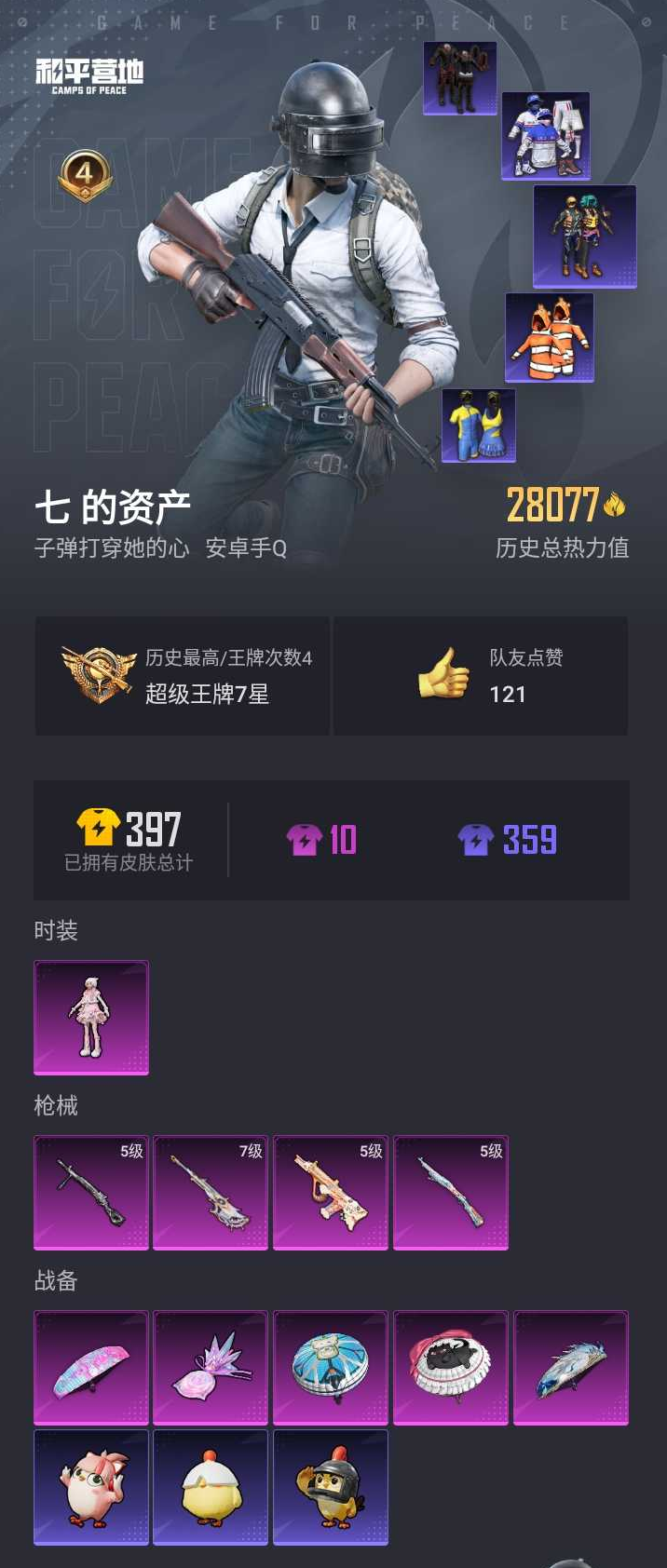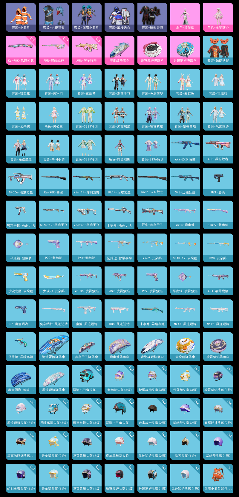 【和平精英】【lyhp20239】1粉装,4特效呛,0载具,历史最高段位:超级王牌7星 王牌印记4次 热力值:28077,83套装,109呛械,129装备,59战备;套装:角色-羊梦糖心,套装-特训学院,套装-红色运动,套装-黄色运动,套装-蓝色运动,套装-白色伏地魔,套装-黑色伏地魔,套装-竞技名士,套装-长空猛禽,套装-海岛探路者,套装-旭日情侣,套装-冷焰舞者,套装-浪漫天命,套装-特战装甲,套装-春日漫步,套装-沙漠毒蛇,套装-幻影武者,套装-暗金炫舞,套装-蓝彩潮人,套装-魅力单车,套装-绮丽涂鸦,套装-破晓战魂,套装-幻世保卫者,套装-都市魅力,套装-清新柠檬,套装-暗影哥特,套装-迅捷狂鲨,套装-呆萌铁蟹,套装-深海小丑鱼,套装-夏日倾情,套装-缤纷果语,套装-滨海厨神,套装-冰川特警,套装-小丑鱼,套装-破蛋小黄鸡,套装-鹤鸣,套装-白熊同盟,套装-白糯汤圆,套装-战术大师,套装-光之冒险,套装-王牌教练,套装-漫游都市,套装-云魄琉璃,套装-恋语绒绒,套装-街头风暴,角色-绯色魅影,角色-无面战甲,套装-异域银装,套装-双彩圣灵,套装-夜幕侵蚀,套装-ss31特训,套装-鱼渊荷华,套装-燕燕于飞,套装-智谋强哥,角色-海琴烟,套装-紫幽梦,套装-粉恋花,套装-ss33特训,套装-云朵鹅,套装-巳巳如意,套装-ss32特训,套装-彩虹兔,套装-蓝冰羽,套装-顶瓜瓜,套装-雪绒豹,套装-大橘大利,角色-灵公主,套装-炫彩糖果,套装-元气之梦,套装-ss34特训,套装-擎苍青焰,套装-朱霞炽焰,套装-游乐,套装-凌霄紫焰,套装-薄荷星砂,套装-ss35特训,套装-午间小调,套装-秘语星愿,套装-风迹短诗,套装-错位像素,套装-ss36特训,套装-雪国风尚,套装-萌鸡速递;呛皮:mk47-乌木金纹,mk47-风迹短诗,scar-l-红色方程式,scar-l-夜灯,scar-l-炫彩节奏,scar-l-彩虹符号,scar-l-海盐豹豹,akm-缤纷海域,akm-涂鸦街区,akm-霓彩脉冲,akm-绿洲时空,groza-治愈之星,groza-无面战甲,famas-霓彩脉冲,famas-乌木金纹,5级aug-暖羊咩咩,aug-耀粉歌者,aug-异域银装,aug-冰晶雪宝,aug-紫晶流影,arx-凌霄紫焰,m416-错位像素,m762-云朵鹅,ace32-冰晶雪宝,蜜獾-鸡智如我,蜜獾-风迹短诗,蜜獾-绿洲时空,蜜獾-乌木金纹,ac-val-天降萌叽,m24-天降萌叽,m24-快狙起手快手,awm-绿洲时空,svd-云朵鹅,svd-霓彩脉冲,5级kar98k-巳巳如意,kar98k-影袭,win94-乌木金纹,7级amr-智耀战神,amr-鸡智如我,m200-乌木金纹,莫辛纳甘-风迹短诗,mk14-治愈之星,mk14-紫幽梦,mk14-薄荷星砂,mk14-紫晶流影,m417-玩趣呆呆,mini14-穿刺龙虾,mini14-鸡智如我,sks-迅猛狂鲨,mk12-风迹短诗,mk12-乌木金纹,qbu-夜幕侵蚀,slr-霓彩脉冲,uzi-影袭,uzi-炫彩糖果,uzi-绿洲时空,汤姆逊-炫彩节奏,汤姆逊-智耀战神,汤姆逊-错位像素,ump45-夜灯,ump45-生命誓言,ump45-海盐豹豹,ump45-夜幕侵蚀,ump45-绿洲时空,野牛-燕燕于飞,js9-凌霄紫焰,aks-74u-鸡智如我,aks-74u-乌木金纹,vect-燕燕于飞,p90-巳巳如意,s12k-夜灯,s12k-霓彩脉冲,dbs-彩虹符号,dbs-风迹短诗,s686-未来战士,s686-巳巳如意,spas-12-燕燕于飞,spas-12-狂鲨锋刃,spas-12-云朵鹅,s1897-紫幽梦,s1897-糯团青竹,5级dp-28-豹影疾电,m249-无面战甲,mg3-幻世战舞者,mg3-惊鸿侠骨,mg3-霓彩脉冲,mg-36-凌霄紫焰,mg-36-薄荷星砂,pkm-啾咪啾咪,pkm-紫幽梦,p92-紫幽梦,p92-凌霄紫焰,沙墨之鹦-云朵鹅,f57-魔童闹海 敖闰,p1911-无面战甲,蝎式手呛-燕燕于飞,信号呛-异瞳寒姬,平底锅-许七安,平底锅-紫幽梦,平底锅-属我最6,平底锅-凌霄紫焰,大砍刀-云朵鹅,十子怒-异瞳寒姬,十子怒-燕燕于飞,十子怒-异域银装,盐雾蛋-冰氧夏日,铝热弹-炫彩糖果,破片手留单-海盐豹豹,破片手留单-拽到爆炸;降落伞:炫彩糖果飞行器,异域银装飞行器,狂鲨锋刃飞行器,破刃行动尾迹,鸡智如我飞行器; 详情看图1粉装4特效呛 羊梦糖心 满级amr智耀战神