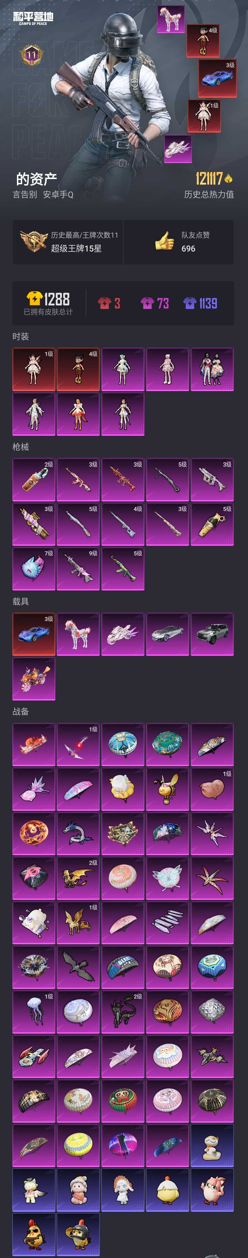 【和平精英】【lyhp20016】6粉装,13特效呛,6载具,历史最高段位:超级王牌15星 王牌印记11次 热力值:121117,216套装,326呛械,469装备,231战备;套装:魔童闹海-哪吒,暮色玫影-艾丽娅,角色-圣堂之誓,角色-小蓝,角色-月影灵韵,角色-霁蓝缠春,套装-星穹咏叹调,角色-羊梦糖心,套装-猎鹰,套装-青年教官,套装-黄色伏地魔,套装-白色伏地魔,套装-黑色伏地魔,套装-骑行爱好者,套装-冰川格斗者,套装-竞技名士,套装-湖蓝色名流,套装-黄色名流,套装-长空猛禽,套装-竞技勇士朋克,套装-黎明保卫者,套装-蓝色守护者,套装-灰色守护者,套装-海岛探路者,套装-旭日情侣,套装-六六大吉,套装-冷焰舞者,套装-灼焰舞者,套装-特战装甲,套装-战地督导,套装-街舞之王,套装-活力之心,套装-甜蜜告白,套装-战地名士,套装-潮流先锋,套装-滨海假日,套装-完美偶像,套装-幻影武者,套装-街头潮人,套装-蓝彩潮人,套装-酷萌兔限定,套装-魅力单车,套装-耀眼新星,套装-坚韧舞者,套装-破晓战魂,套装-都市魅力,套装-热血青春,套装-沙漠兵团,套装-丛林猎人,套装-雪山精英,套装-酷潮明星,套装-幻世战舞者,套装-深海小丑鱼,套装-甜蜜熊情侣,套装-青涩时光,套装-缤纷果语,套装-滨海厨神,套装-龙魂突击队,套装-极速红龙,套装-格斗先锋,套装-破蛋小黄鸡,套装-疯狂小兔子,套装-深蓝冒险家,套装-迷域探索者,套装-浪漫波比,套装-金鼠迎春,套装-军械专家,套装-ss7特训,套装-核芯基因,套装-精神漫游,套装-霓虹街区,套装-ss10特训,套装-ss8特训,套装-众神之王,套装-智慧之神,套装-白熊同盟,套装-萌黄之夏,套装-pel躁动竞梦者,套装-夏日音浪,套装-ss9特训,套装-辉星之火,套装-蓝甜马卡龙,套装-牛气满满,套装-ss11特训,套装-怪笑疯兔,套装-诡面顽熊,套装-原初圣火,套装-逆风勇士,套装-萌趣颜团子,套装-特种颜团子,套装-战术大师,套装-ss12特训,套装-镭射皇者,套装-银白舞王,套装-耀粉歌者,套装-治愈之星,套装-科技之星,套装-飞行日记,套装-ss13特训,套装-曼妙人鱼,套装-热情海星,套装-纯真浪花,套装-冰爽海盐,套装-ss14特训,套装-吉莉礼服,套装-ss15特训,套装-ss16特训,套装-福星高照,套装-玉兔迎春,套装-ss22特训,套装-田园牧歌,套装-轻风白浪,套装-熠彩粉晶,套装-光之冒险,套装-绯格组合,套装-ss23特训,套装-神气柴柴,套装-懵萌河马,套装-妙红点点,套装-幻彩翩翩,套装-王牌教练,套装-柠萌假日,套装-青玉碎影,套装-ss24特训,套装-日照花林,套装-龟仙人,套装-涂山之恋,套装-ss25特训,套装-金戈铁马,套装-惊鸿侠骨,套装-锦衣飞扬,套装-果汁能量,套装-龙的传人,套装-冰河战士,套装-ss26特训,套装-快闪甜心,套装-春光漫游,套装-空岛之星,套装-无暇誓言,套装-明鸳圣池,套装-童真绒兔,套装-贝斯之夜,套装-焰鹰斗篷,套装-幽夜迷踪,套装-幻羽潜行,套装-ss27特训,套装-恋语绒绒,套装-老实芭蕉,套装-ss28特训,角色-听雨铃兰,角色-情公主,角色-银尘,套装-白辉玉蕊,套装-街头风暴,套装-海盐绵绵冰,套装-蝶变,套装-创世·追猎,套装-ss29特训,角色-紫俏灵猫,套装-火种守卫者,套装-异域银装,角色-都市丽猫,套装-星途旅人,角色-糖霜甜心,角色-怀庆长公主,角色-临安公主,套装-ss30特训,套装-青团波波,套装-棉花软糖,套装-绒绒粉兔,角色-绛羽幽主,套装-糖糖葫芦,角色-馥郁金蕊,套装-ss31特训,套装-鱼渊荷华,套装-石蕴玉辉,套装-燕燕于飞,套装-智谋强哥,套装-紫幽梦,套装-粉恋花,套装-晶辉守护,套装-ss33特训,角色-猎影月神,套装-云朵鹅,套装-巳巳如意,套装-ss32特训,套装-彩虹兔,套装-蓝冰羽,套装-顶瓜瓜,套装-雪绒豹,套装-狂鲨锋刃,套装-大橘大利,套装-霓虹热舞,套装-炫彩糖果,套装-星影赞美诗,玩偶服-喜羊羊,玩偶服-美羊羊,套装-元气之梦,套装-ss34特训,套装-擎苍青焰,套装-朱霞炽焰,套装-游乐,套装-凌霄紫焰,套装-薄荷星砂,套装-ss35特训,套装-午间小调,套装-秘语星愿,套装-风迹短诗,套装-琴音绮想,套装-粉黛兰香,套装-画境星梦,套装-书海巡游,角色-玄霖雨神,套装-ss36特训,套装-雪国风尚,套装-萌鸡速递;呛皮:9级m416-超新星,m416-夜灯,m416-糯团青竹,m416-乌木金纹,aug-怪笑疯兔,aug-闲梦青缨,aug-异域银装,aug-冰晶雪宝,aug-紫晶流影,aug-乌木金纹,g36c-懵萌河马,g36c-桃粉嫣然,g36c-镜域双华,g36c-星穹咏叹调,5级akm-绿萝繁花,3级akm-暮色玫影,akm-夜灯,akm-涂鸦街区,akm-彩虹符号,akm-萌趣颜团子,akm-龙的传人,akm-江南烟雨,akm-霓彩脉冲,akm-乌木金纹,groza-春暖花开,groza-黑色刀锋,groza-马卡龙,groza-治愈之星,groza-彩虹符号,groza-田园牧歌,groza-懵萌河马,groza-海盐豹豹,groza-荧海星豚,groza-暮色玫影,groza-乌木金纹,蜜獾-天降萌叽,蜜獾-精灵梦叶罗丽,蜜獾-糖糖葫芦,蜜獾-风迹短诗,蜜獾-冰澜龙吟,蜜獾-乌木金纹,m762-牛气冲天,m762-镭射皇者,m762-天降萌叽,m762-云朵鹅,m762-乌木金纹,q-原初圣火,q-洛神天依,q-纯真浪花,q-乌木金纹,ac-val-乌木金纹,ac-val-快闪甜心,ac-val-梦海之灵,m16a4-蓝色火焰,m16a4-生命誓言,m16a4-幻世战舞者,m16a4-冰河战士,m16a4-最终圣卫者,m16a4-乌木金纹,famas-霓彩脉冲,famas-乌木金纹,3级scar-l-魔童闹海 哪吒,scar-l-夜灯,scar-l-繁花小夜曲,scar-l-炫彩节奏,scar-l-彩虹符号,scar-l-玉兔迎春,scar-l-绊爱,scar-l-星途旅人,scar-l-海盐豹豹,scar-l-天象三御,scar-l-乌木金纹,ace32-画境星梦,ace32-冰晶雪宝,mk47-天之羽翼,mk47-洛神天依,mk47-妙红点点,mk47-风迹短诗,arx-凌霄紫焰,5级kar98k-巳巳如意,kar98k-梦幻火