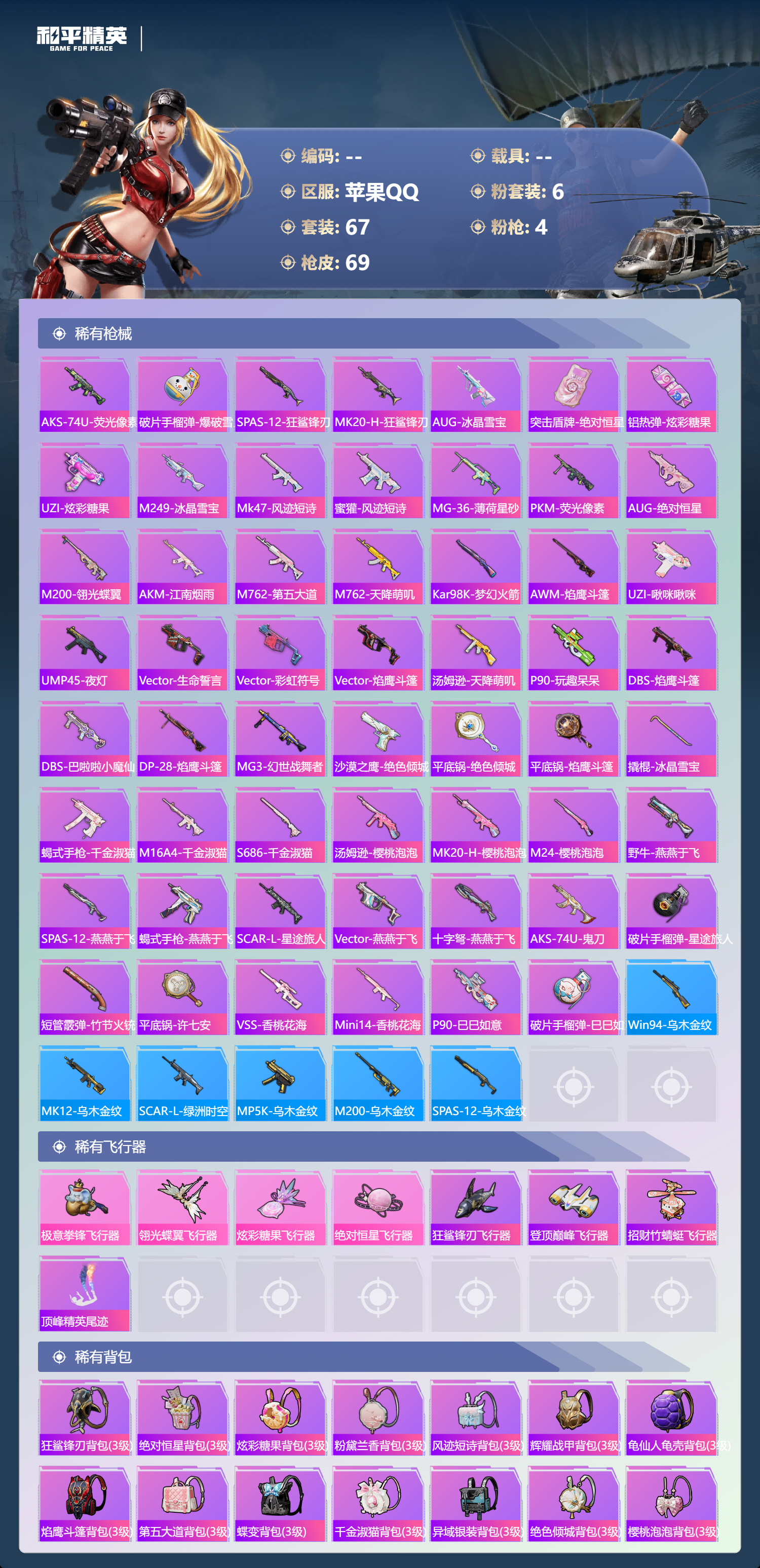0载具-67套装-69呛皮-【公主号连体王者贵】苹果手q-2王牌印记-6粉装-4特效呛-26053热力值-67套装-69呛皮【6粉装】角色-绝对恒星角色-樱桃泡泡套装-第五大道角色-美琪角色-千金淑猫套装-梦幻火箭【4特效呛】kar98k-巳巳如意/5级m249-绝对恒星/2级dp-28-千金淑猫/1级mk14-樱桃泡泡/1级【3稀有紫装】暗影哥特胖达团团龟仙人【67稀有时装】梦幻火箭第五大道绝对恒星