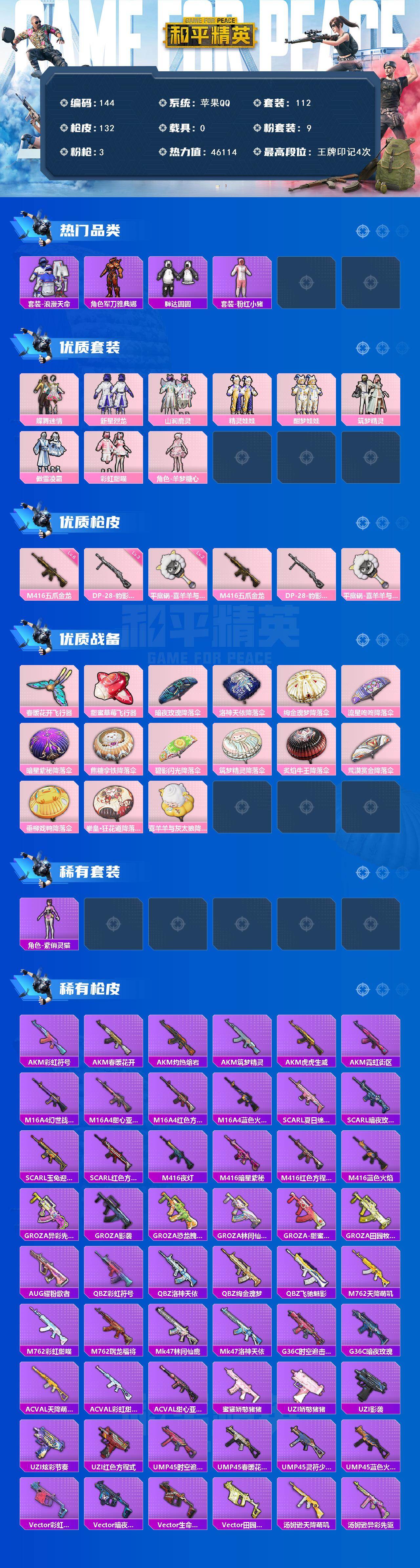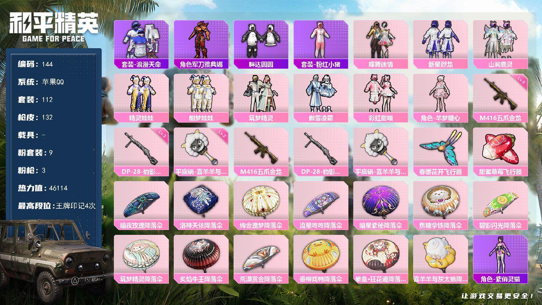 0载具-112套装-132呛皮-【粉装9特效呛3 m416五爪金龙6级 胖达圆圆 浪漫天命】苹果q-4王牌印记-9粉装-3特效呛-132呛皮-112套装 【9粉装】 羊梦糖心 山涧鹿灵 新星烈龙(小白龙) 蝶舞迷情 酣梦娃娃 傲雪凌霜 彩虹甜喵 精灵娃娃 筑梦精灵 【3特效呛】 dp-28-豹影疾电 平底锅-喜羊羊与灰太狼 m416-五爪金龙 【4飞行器】 鸡智如我飞行器 春暖花开飞行器 火焰蝠人飞行服